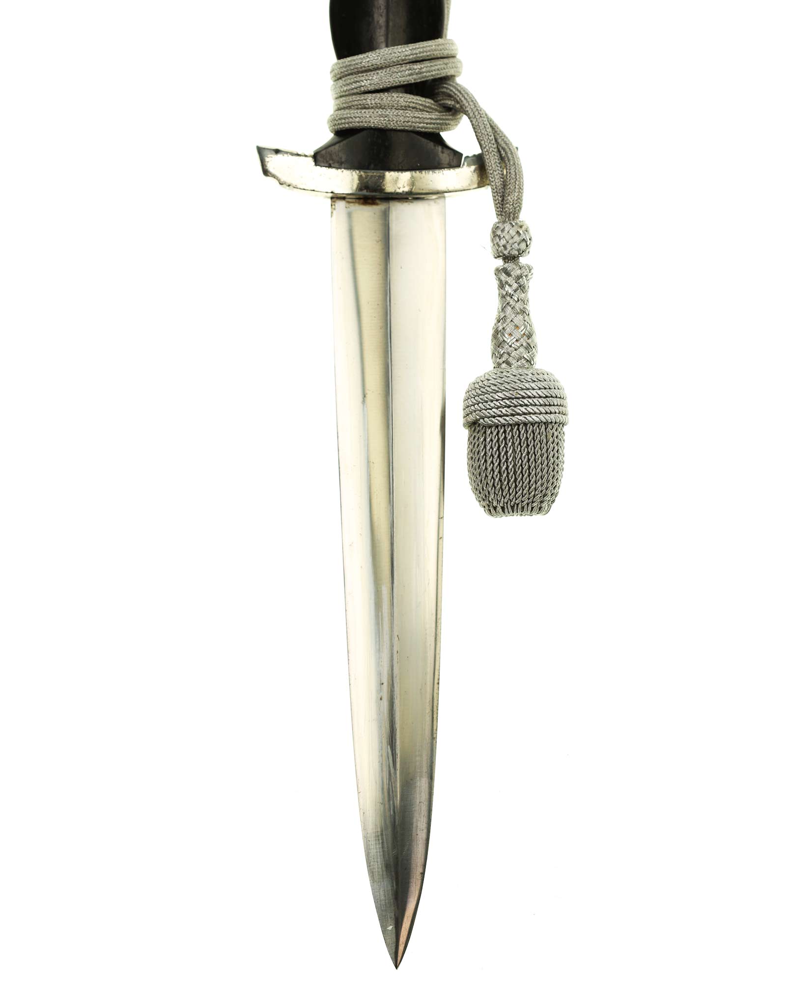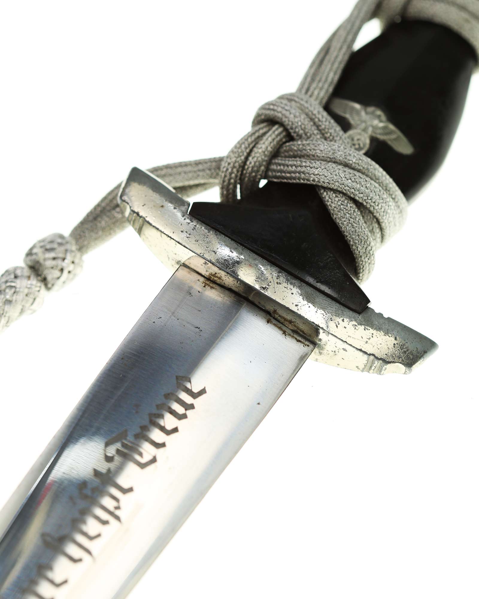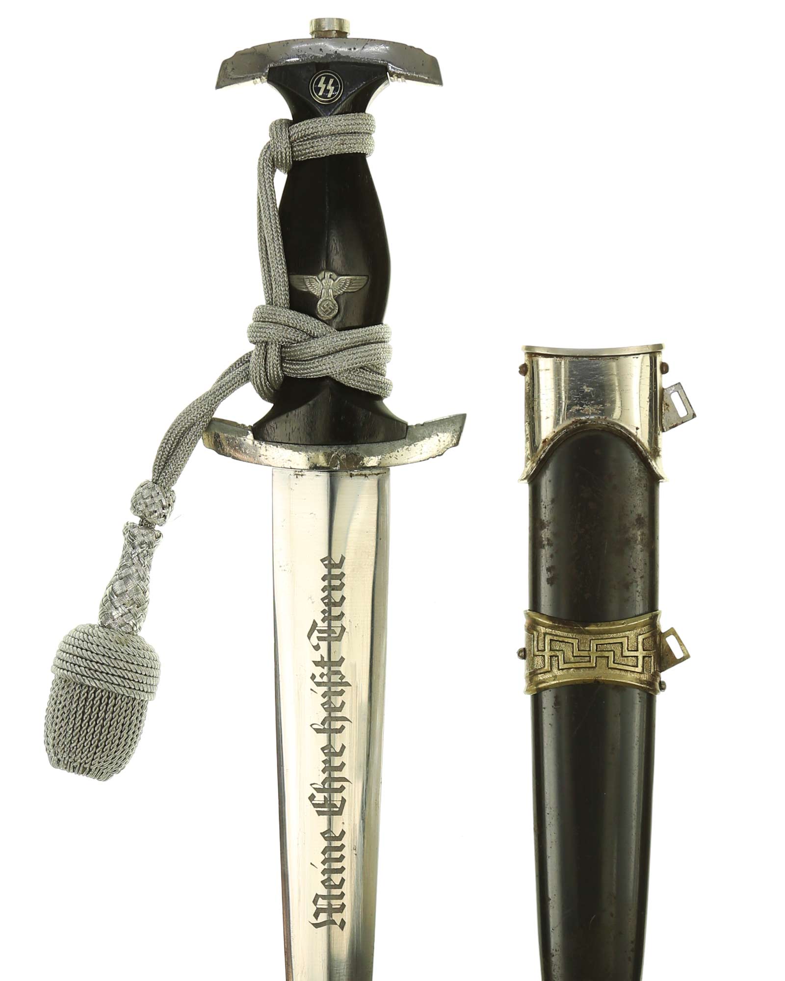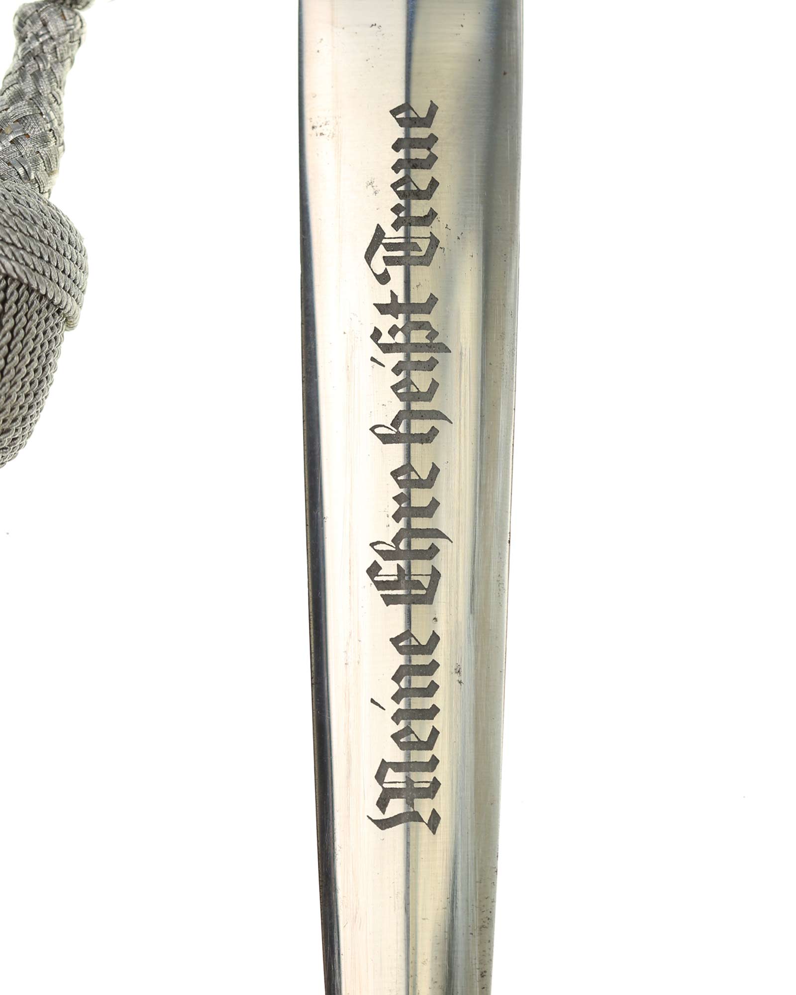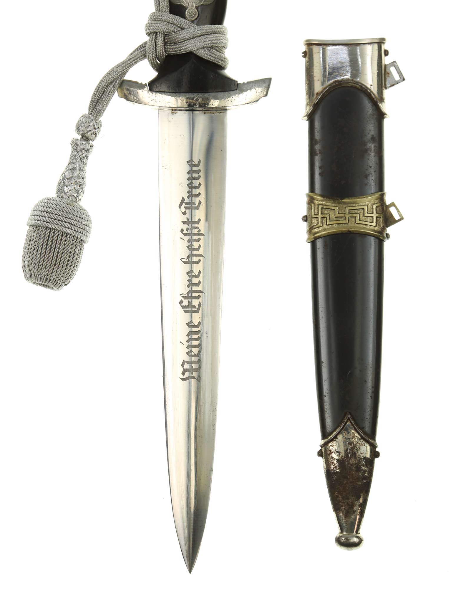 Klinge: Die Klinge zweischneidig und spiegelblank, ohne Rost und Kerben. Auf der Vorderseite der Klinge befindet sich die SS Devise mit der Inschrift: Meine Ehre heißt Treue, die Rückseite ist blank ohne Hersteller, wie es vorschriftlich auch sein sollte. Die Klingenschultern passen perfekt auf die untere Parierstange.