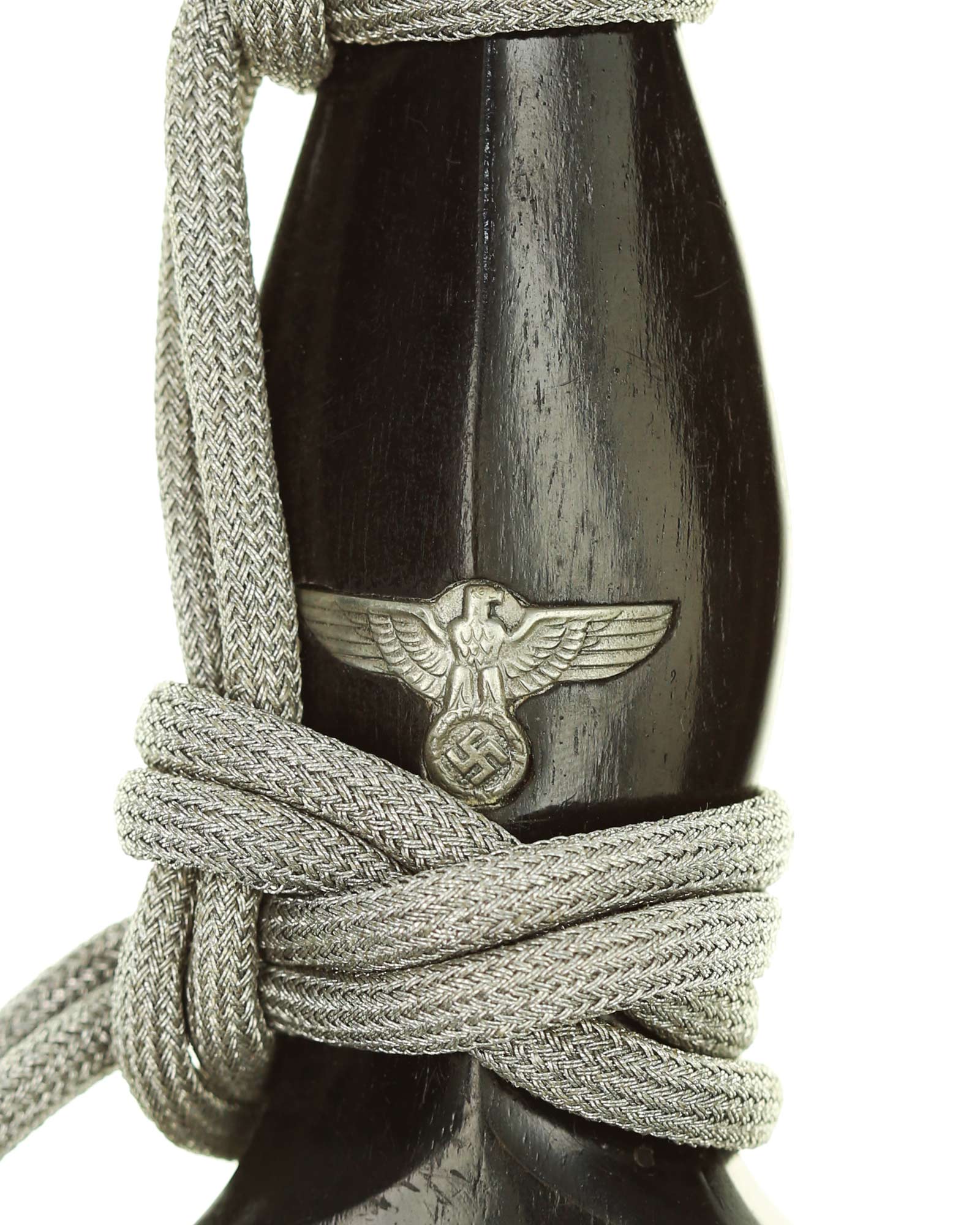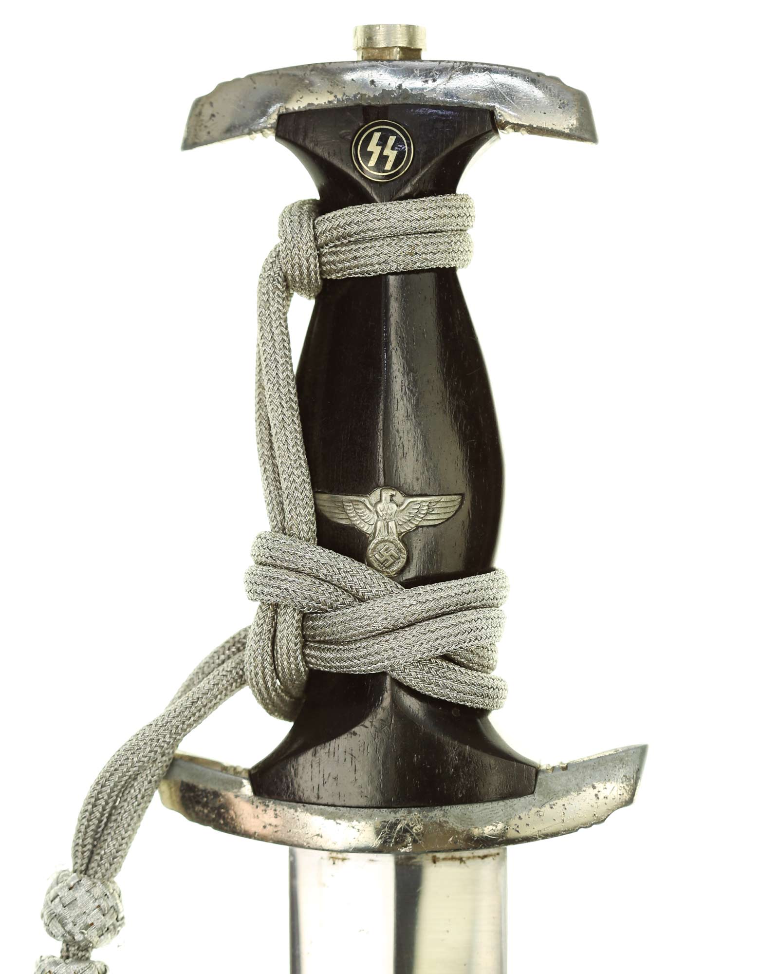 Griff: Der Griff besteht aus einem schwarzen Ebenholz. Auf dem Griff befinden sich die SS Runen und der Hoheitsadler.
