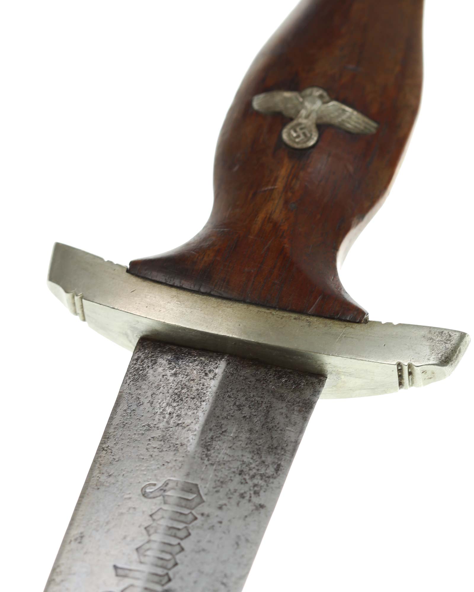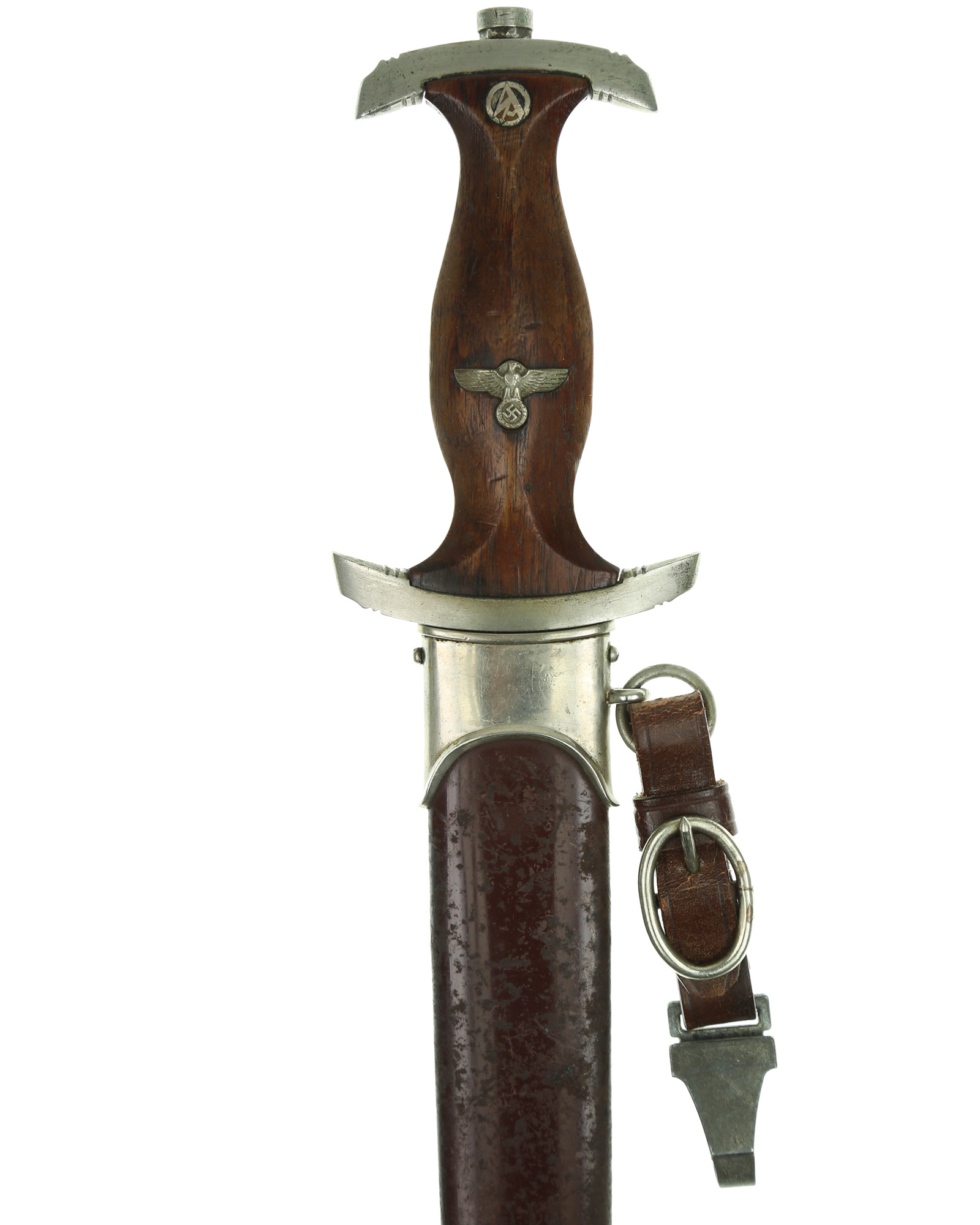 Griff: Brauner Holzgriff, der Hoheitsadler im Griff ist in Nickelausführung und mit langem Hals, darüber befindet sich das emaillierte SA-Emblem, diese sind innen geklammert. Beide Parierstangen sind aus Nickel und sind mit Tragespuren. Die untere Parierstange ist auf der Rückseite mit dem Gruppenstempel He [Hessen] handgestanzt.