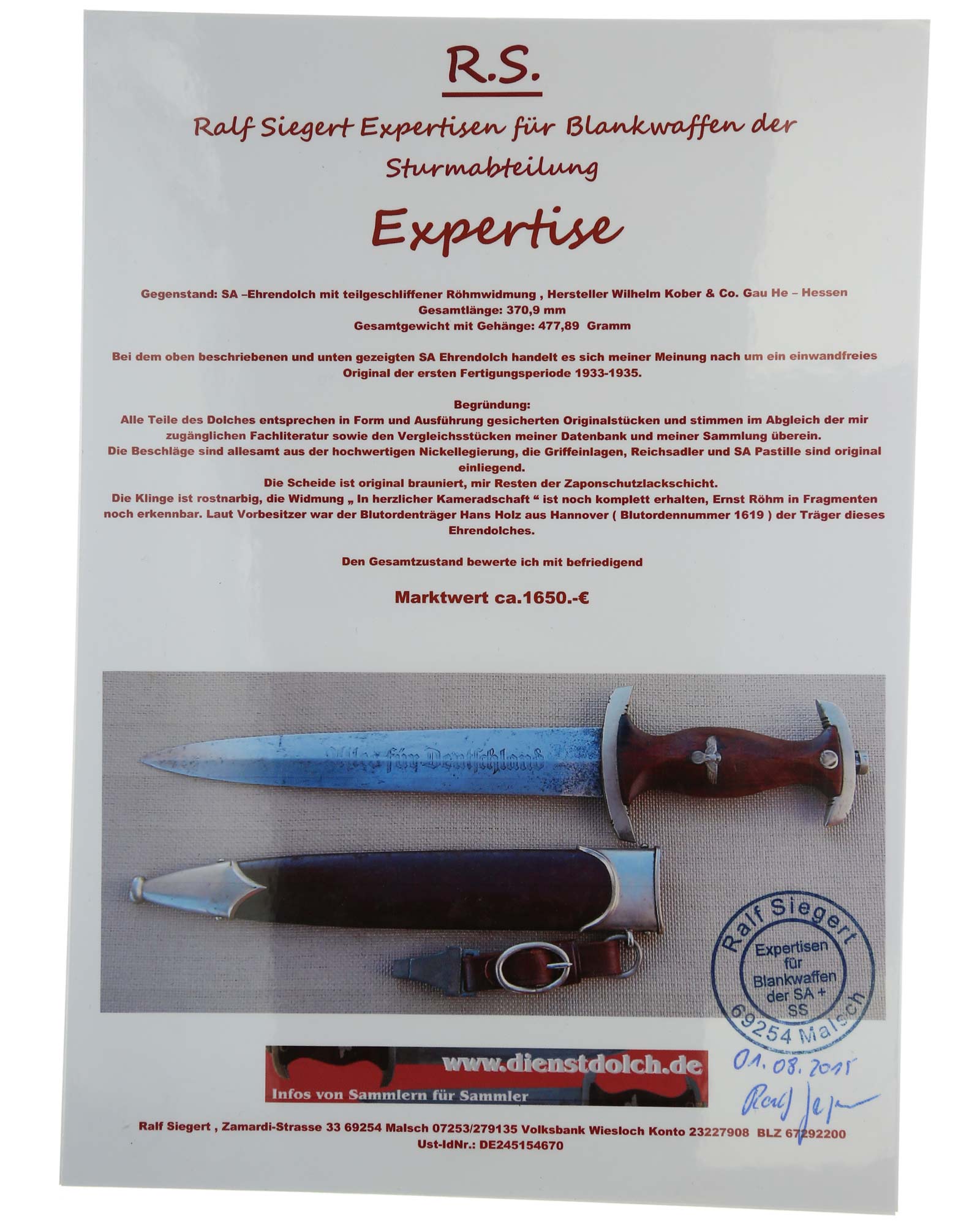 Ehrendolch der Sturmabteilung [SA] mit teilgeschliffener Röhmwidmung, mit dem Suhler Hersteller auf der Klinge: Willhelm Kober & Co., Suhl. Untere Parierstange mit passender Gruppenstempelung He für Hessen.