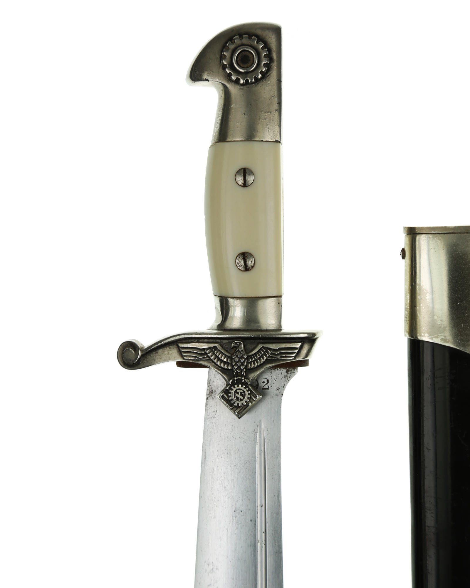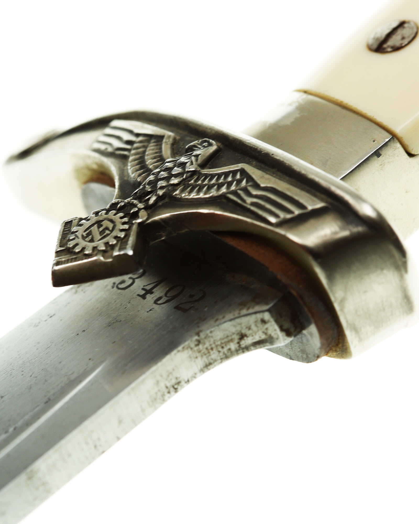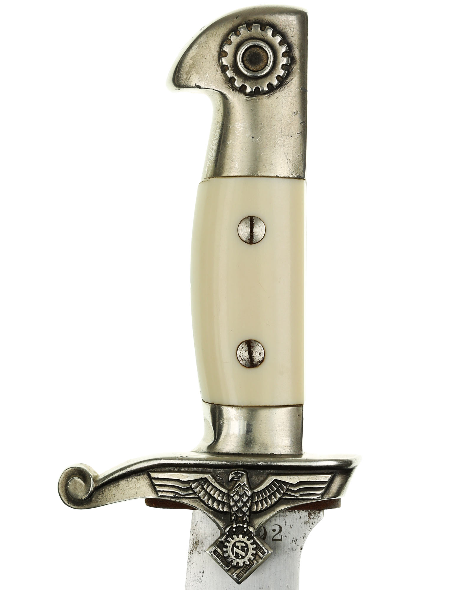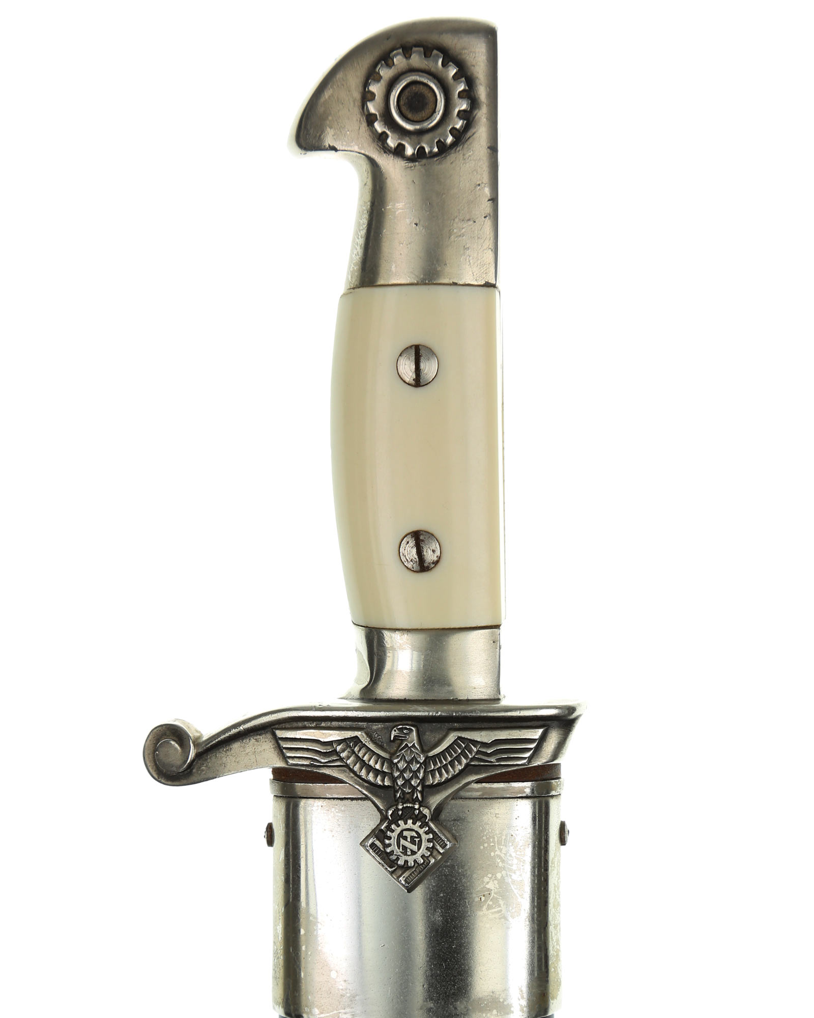 Griff: Der Griff ist mit zwei Kunststoff-Griffschalen, diese werden durch zwei Schrauben festgehalten. Versilberung des Griffes ist zu 99% erhalten. Die Parierstange ist in Form eines Reichsadlers, der nach links schaut. Zum linken Ende hin wirbelt das Ende nach oben. In der Mitte befindet sich der Adler, der in seinen Krallen einen Kranz mit typischem TENO Zeichen und einen Hakenkreuz festhält.