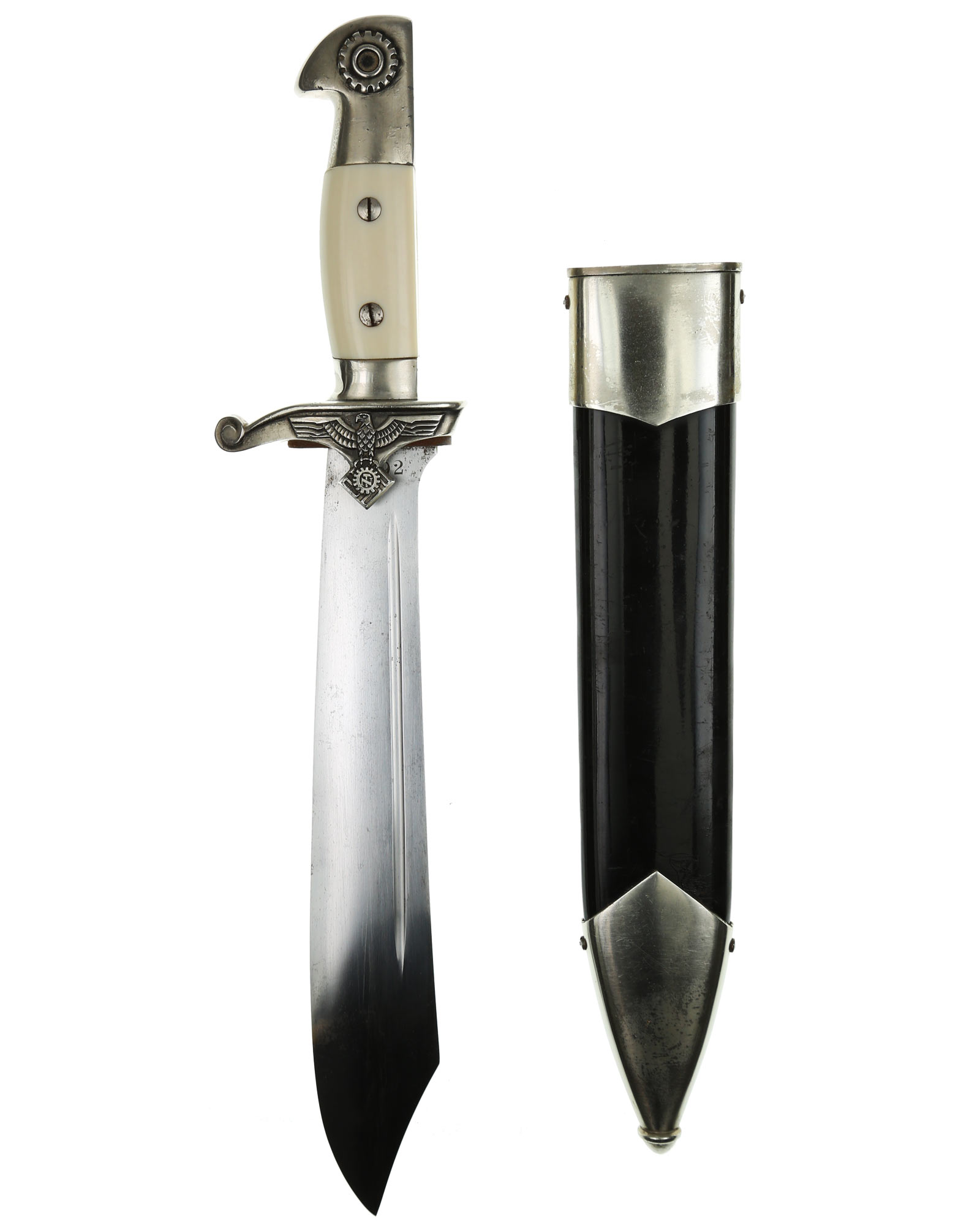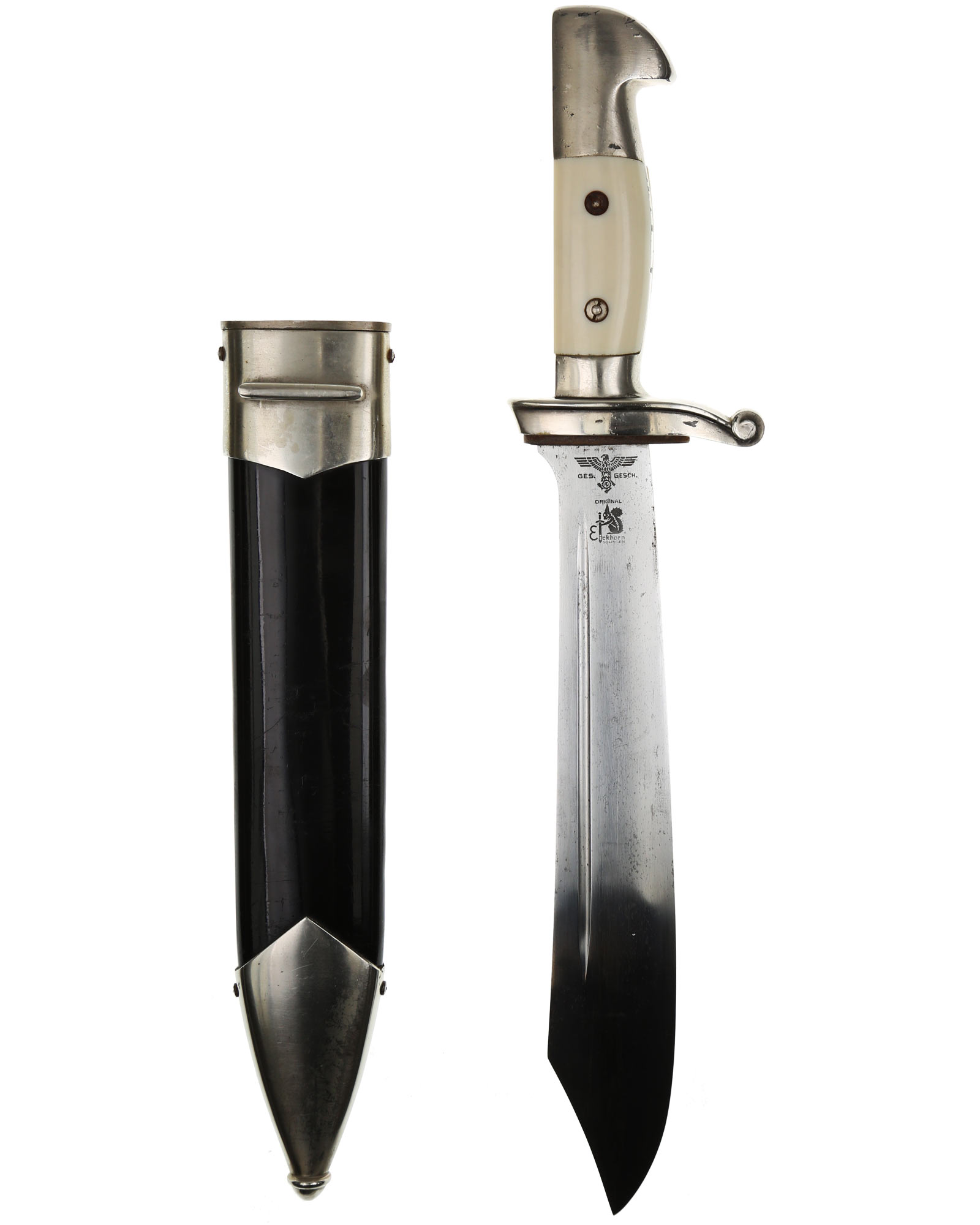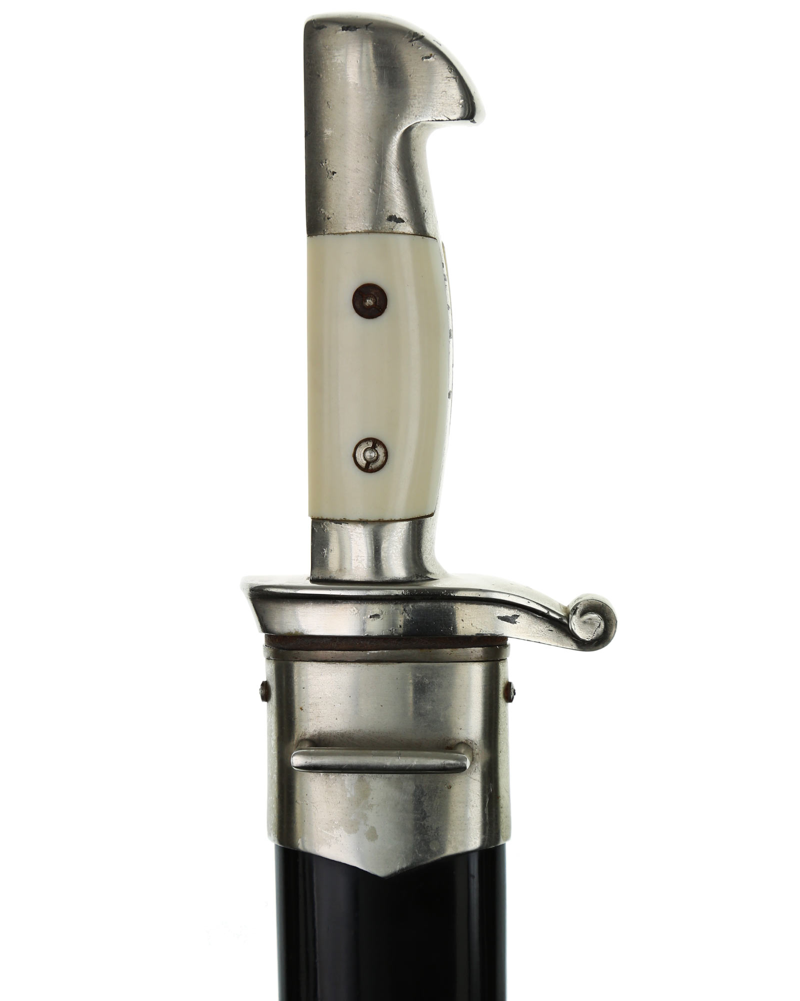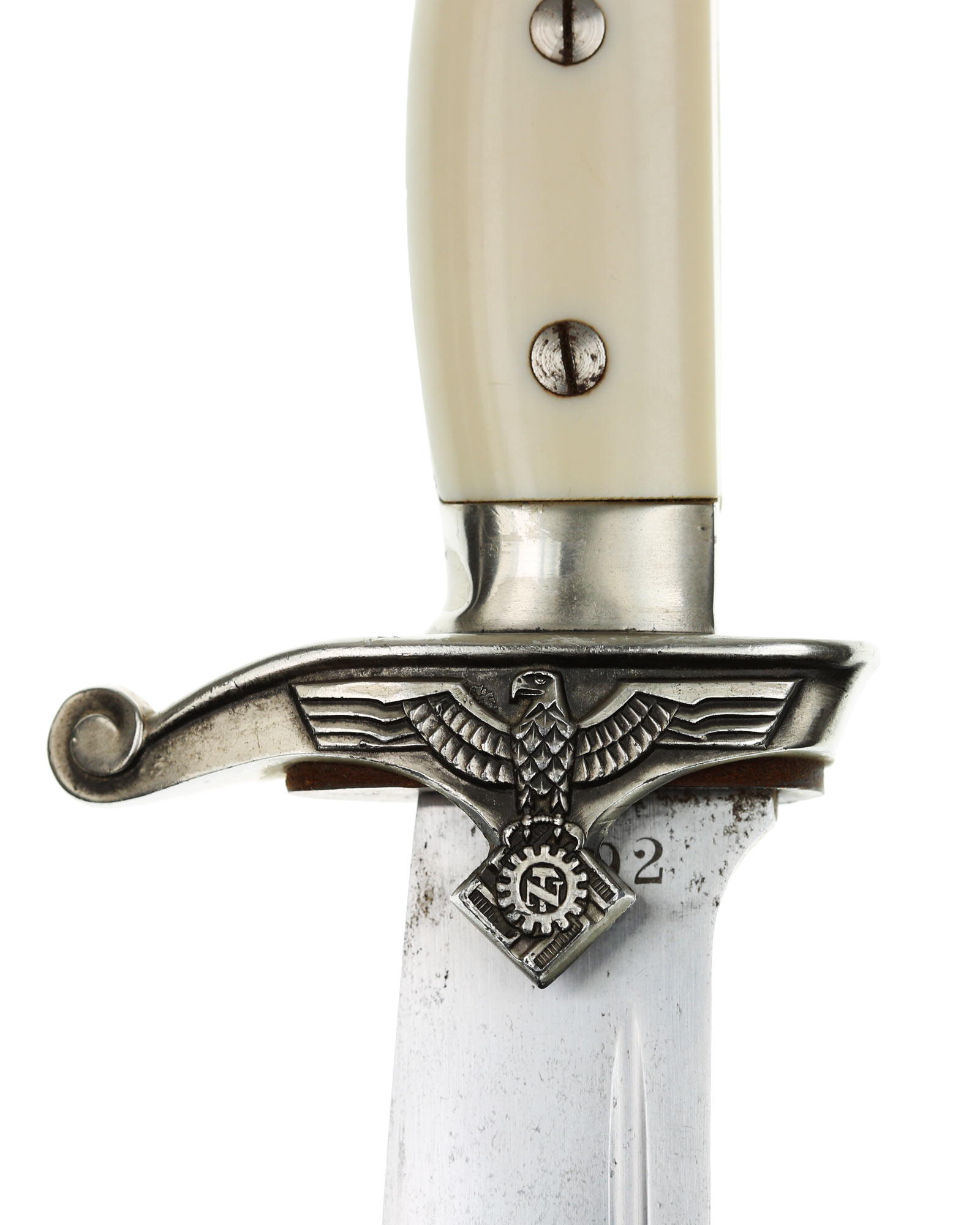 Griff: Der Griff ist mit zwei Kunststoff-Griffschalen, diese werden durch zwei Schrauben festgehalten. Versilberung des Griffes ist zu 99% erhalten. Die Parierstange ist in Form eines Reichsadlers, der nach links schaut. Zum linken Ende hin wirbelt das Ende nach oben. In der Mitte befindet sich der Adler, der in seinen Krallen einen Kranz mit typischem TENO Zeichen und einen Hakenkreuz festhält.