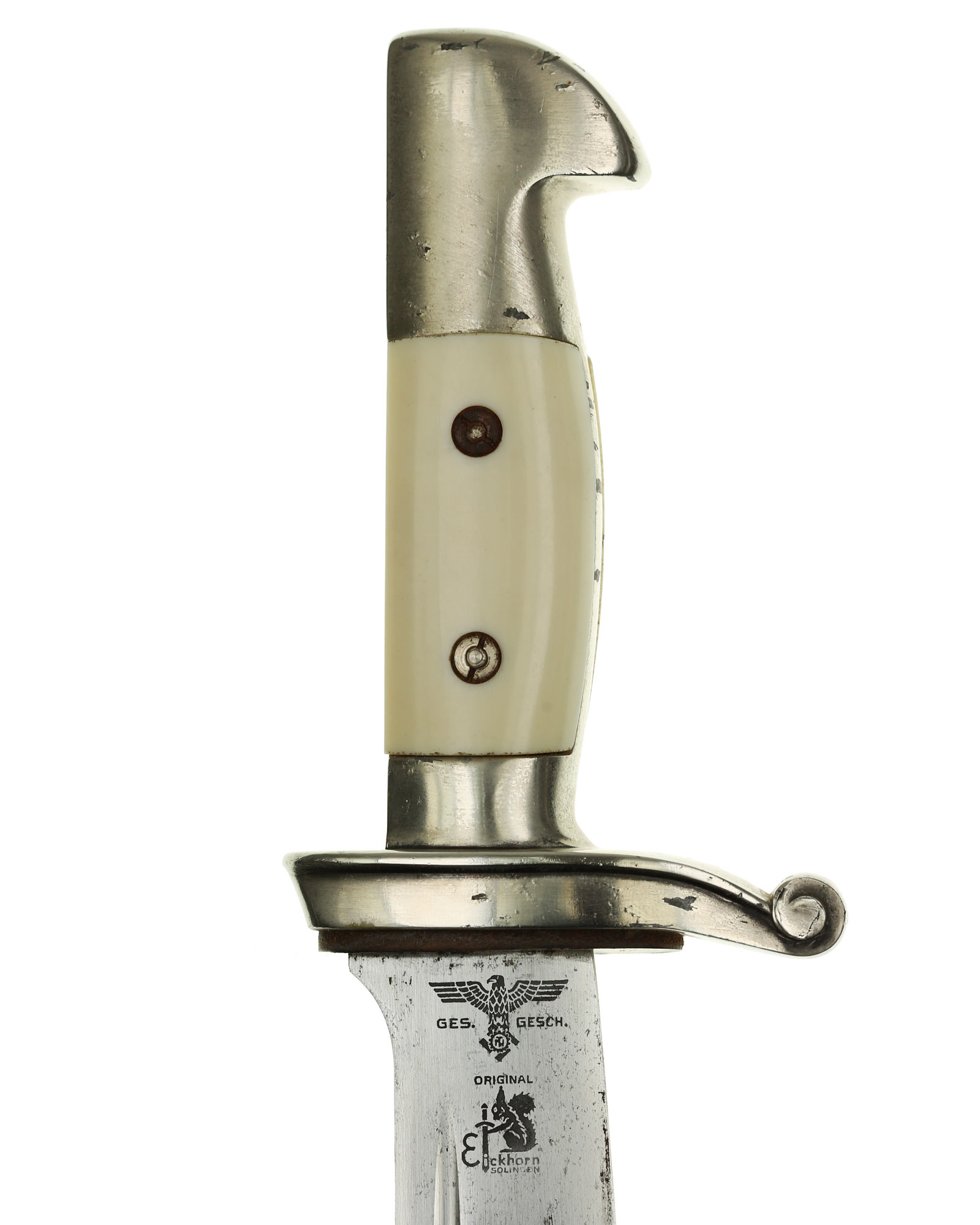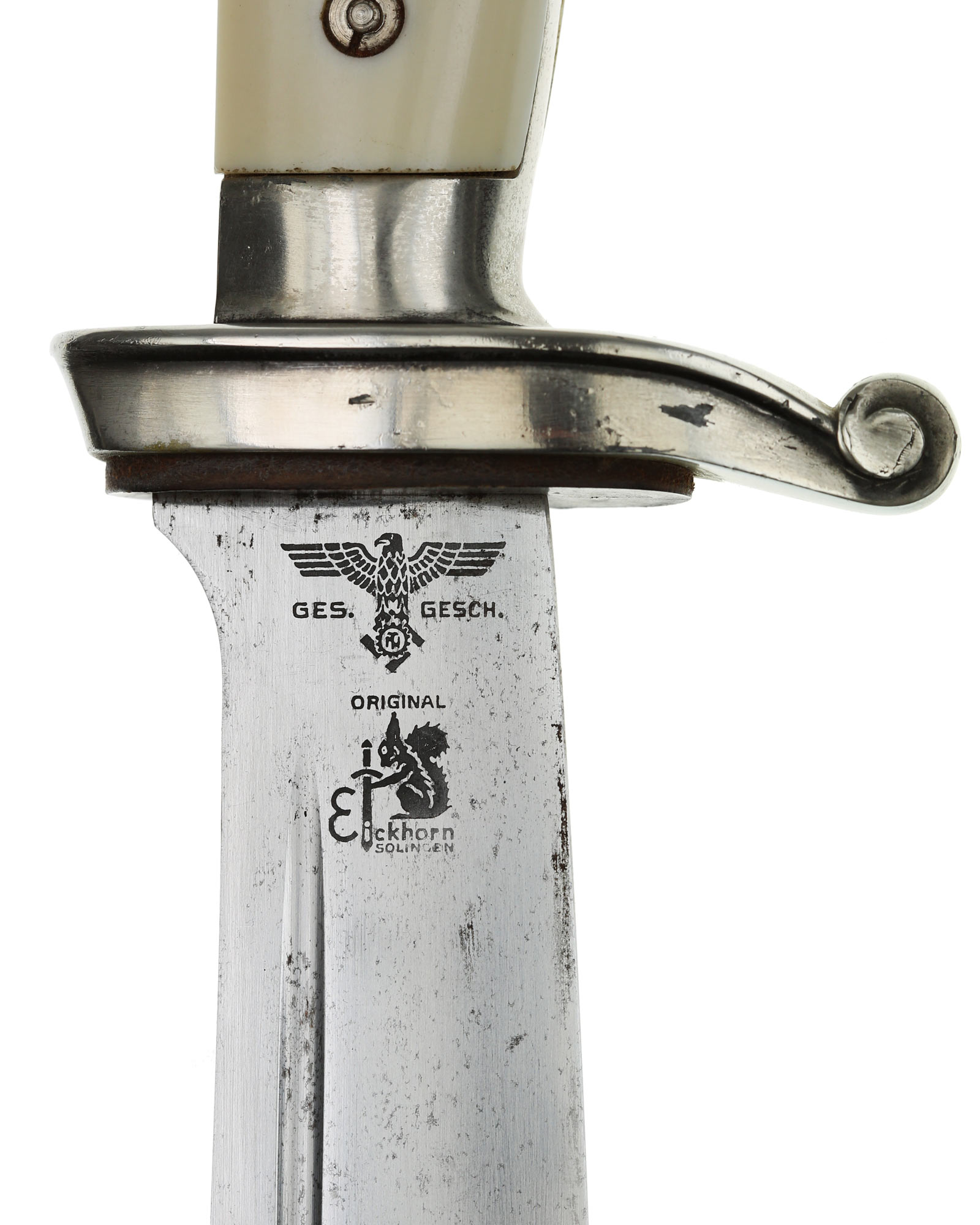 Klinge: Kräftige Kehlklinge mit dem Hersteller: Original Carl Eickhorn, Solingen. Über dem Herstellerloge befindet sich der TeNo Adler mit GES. GESCH. Auf der Vorderseite der Klinge befindet sich die Nummer 3492, die selbe Nummer befindet sich auch auf dem Mundblech der Scheide.