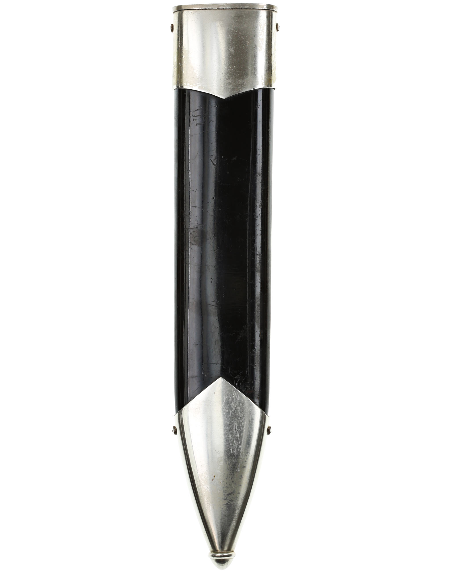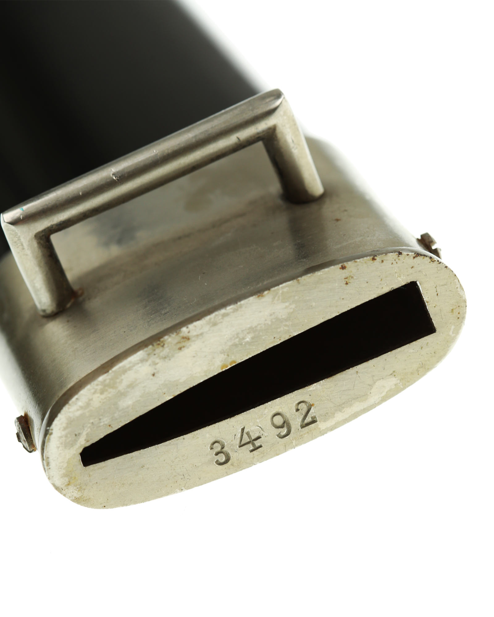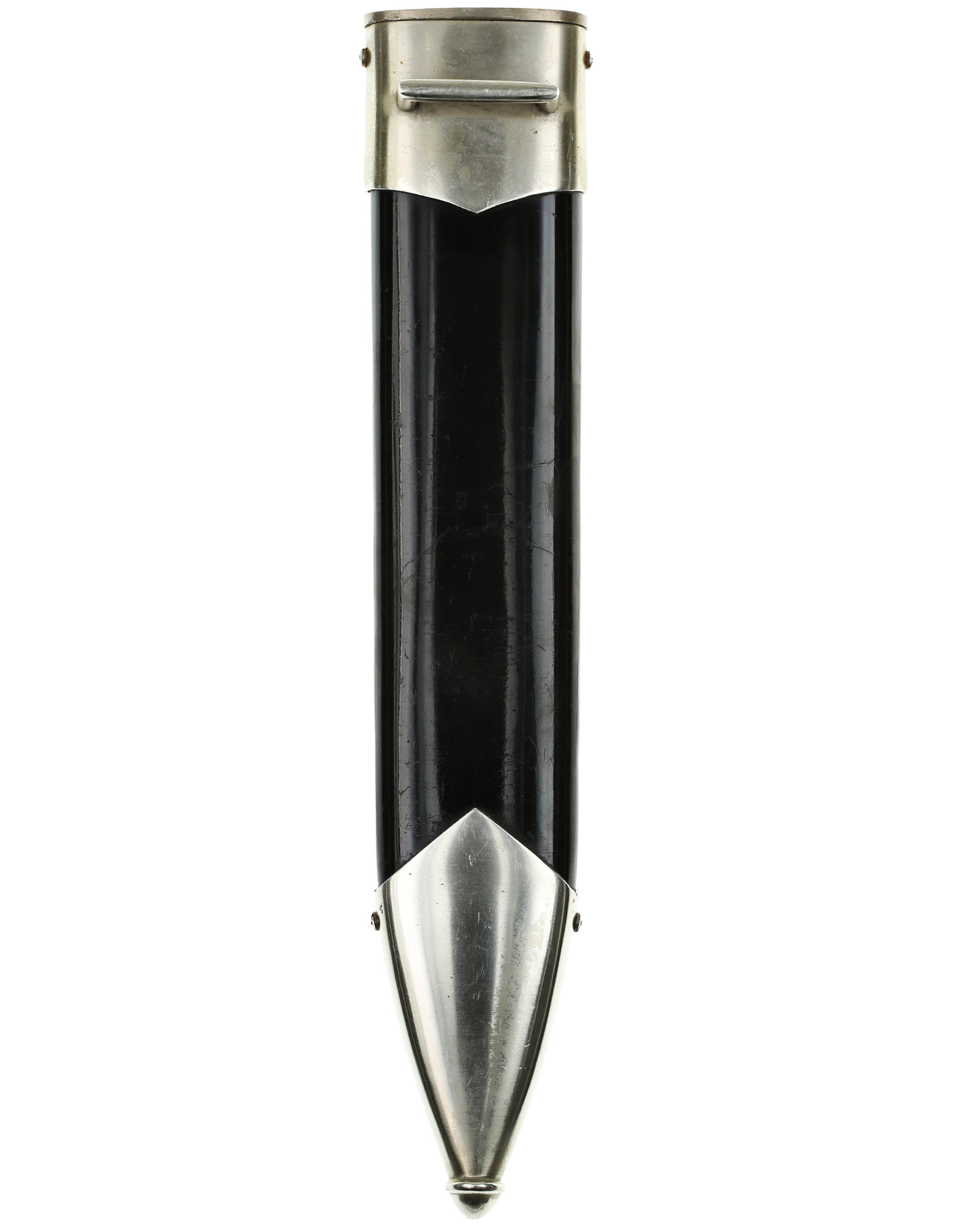 Scheide: Schwarz lackierte Stahlscheide mit 99% Originallack. Die Beschläge werden mit seitlich angebrachten Schrauben festgehalten. Am oberen Scheidenbeschlag befindet sich der Bügel auf der Rückseite, zum Einhängen des Tragehängers.
