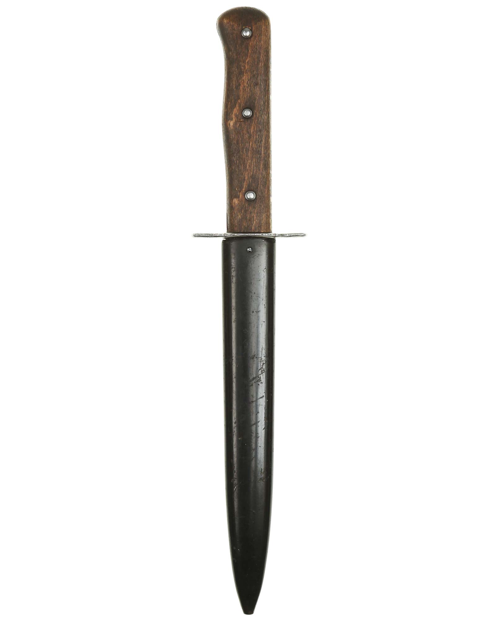 Wehrmacht Luftwaffe (WL) Kampfmesser mit Stiefelclip. Die Klinge ist einschneidig. Braune Nussbaum-Holzgriffschalen sind vernietet. Die Klinge ist mit Stempel der Luftwaffenabnahme "5". Die Scheide ist mit Originallackierung. Gesamtgewicht 221 g. Gesamtlänge: 293 mm. Zustand 2.