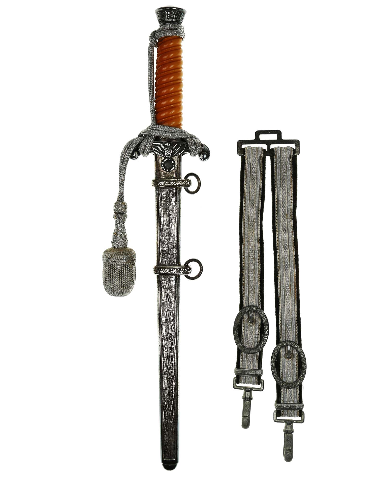 Heeres-Offiziersdolch, Modell 1935. Die Gesamtlänge beträgt 40,0 cm. Der HOD ist zusammen mit einem zweiteiligem Gehänge und Portepee.