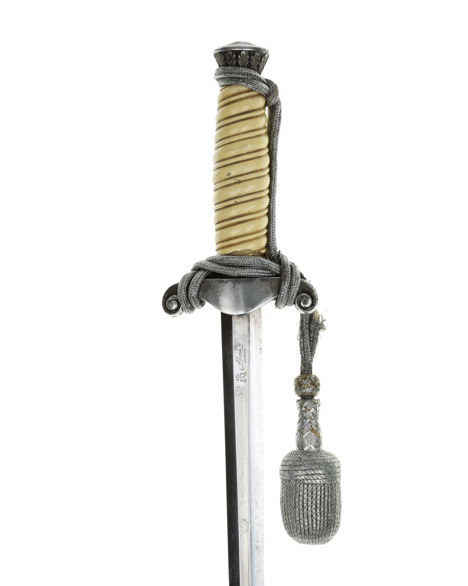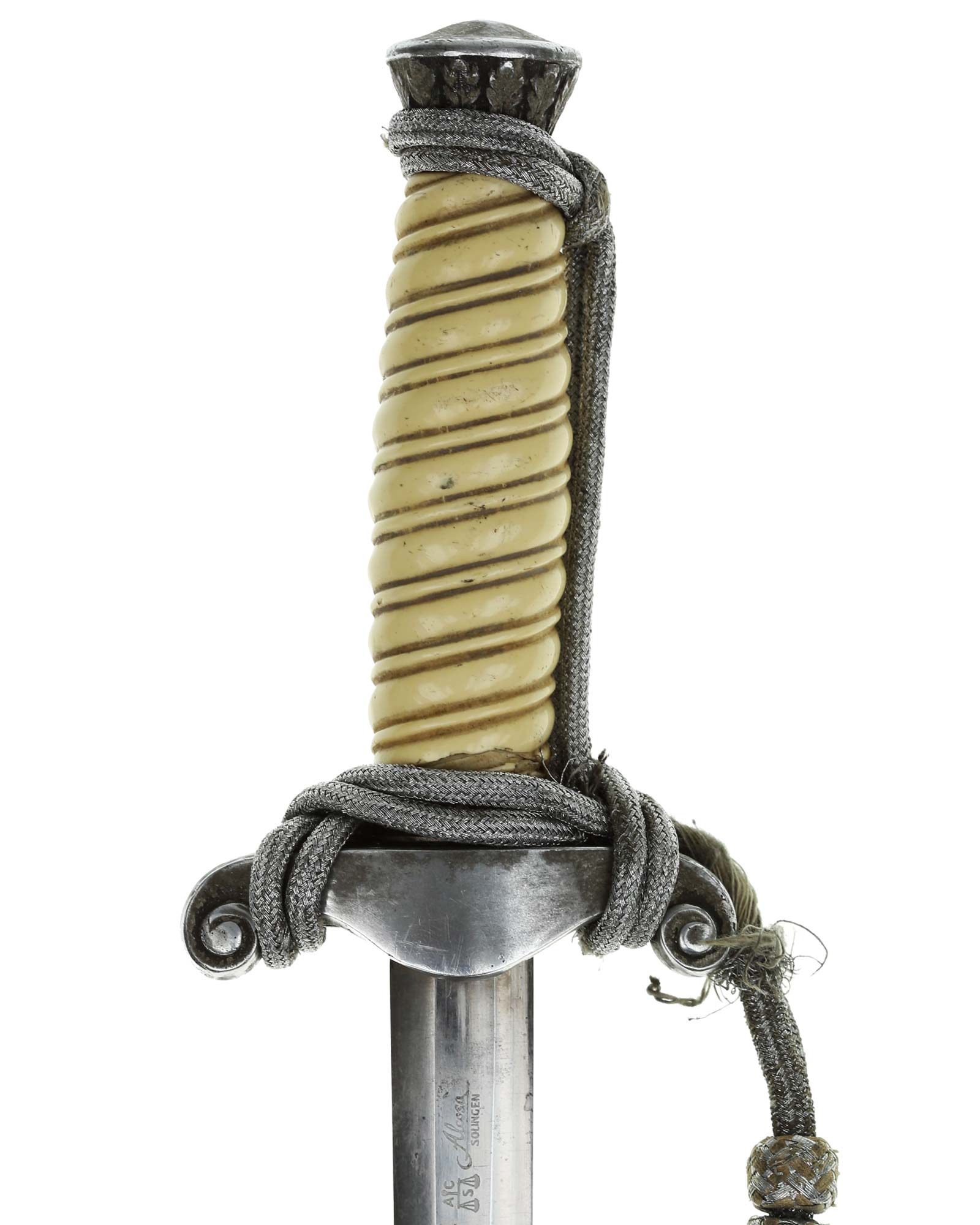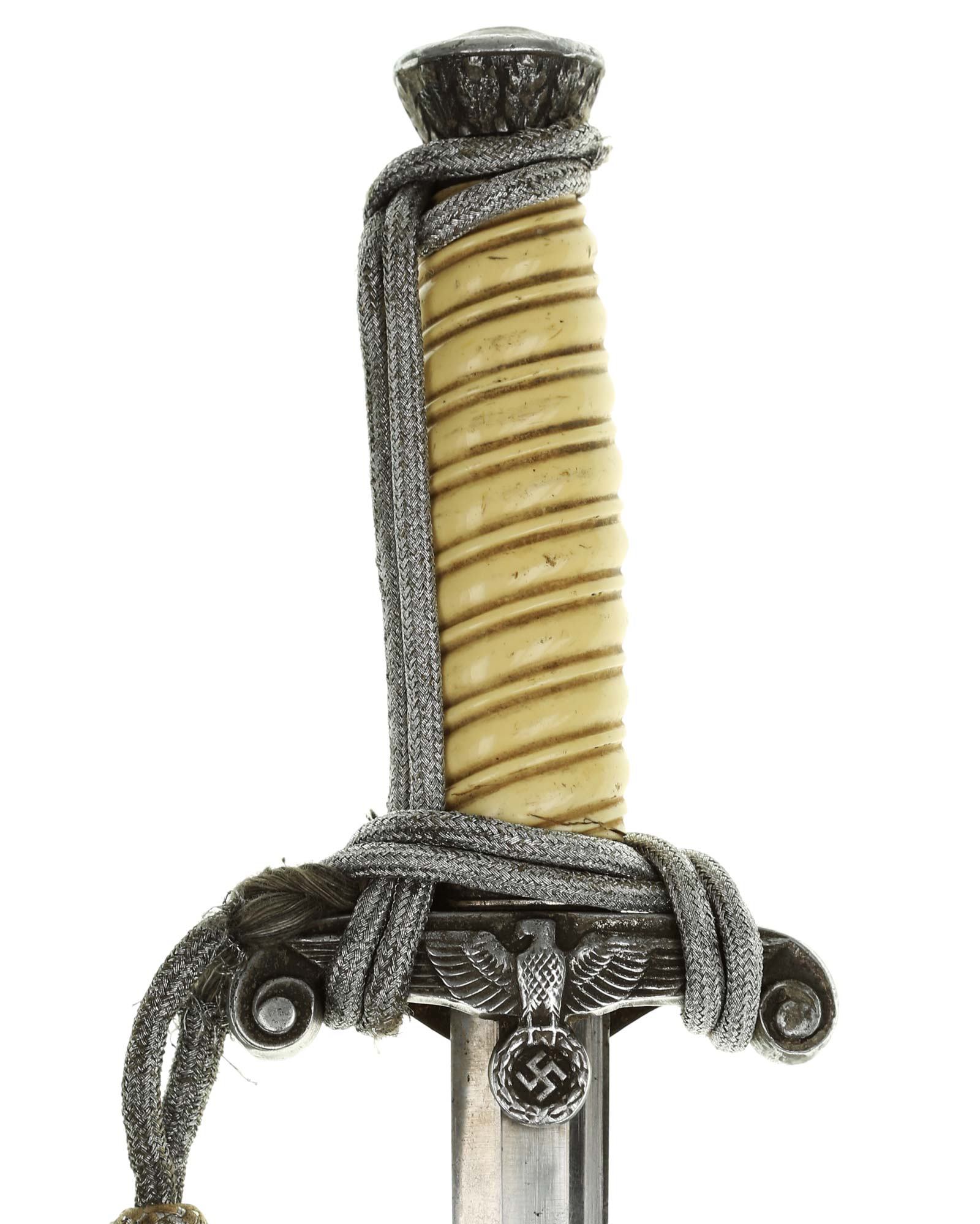 Griff: Der Griff ist rund mit zweifach verdrehten Kanneluren. Der Griff besteht innen aus Gips und außen mit einer Schicht Zelluloid überzogen. Die Form der Kanneluren ist konvex bzw. nach außen gewölbt. Der Knauf ist konisch und ist auf die Klingenangel festgeschraubt, er ist mit 12 Eichenlaubblätter verziert. Am unteren Ende des Griffes befindet sich der Griffring, der mit 7 Eichenblätter in einer Reihe nebeneinander verziert ist. Die Parierstange ist in Form eines Reichsadlers, der nach links schaut. Zu den beiden Enden hin wirbeln die Flügel nach unten. In der Mitte befindet sich der Adler, der in seinen Krallen einen Kranz mit dem Hakenkreuz festhält.