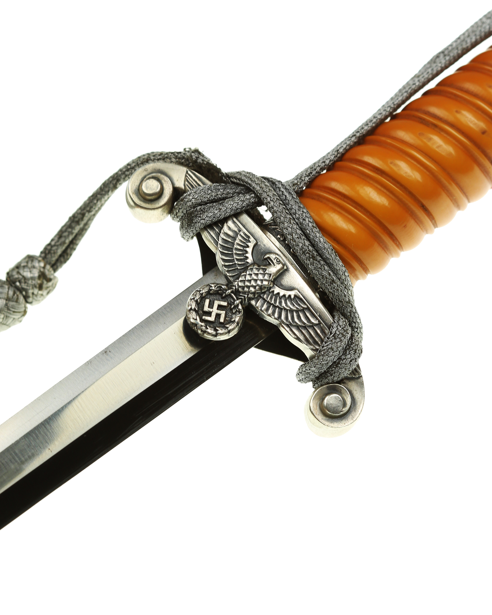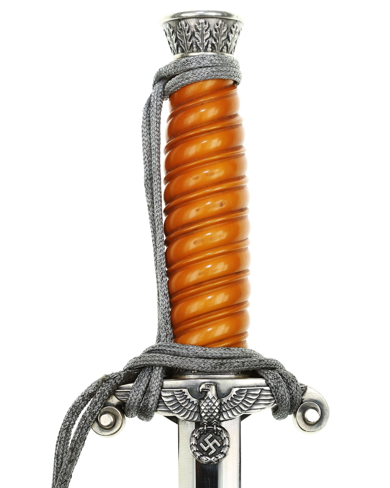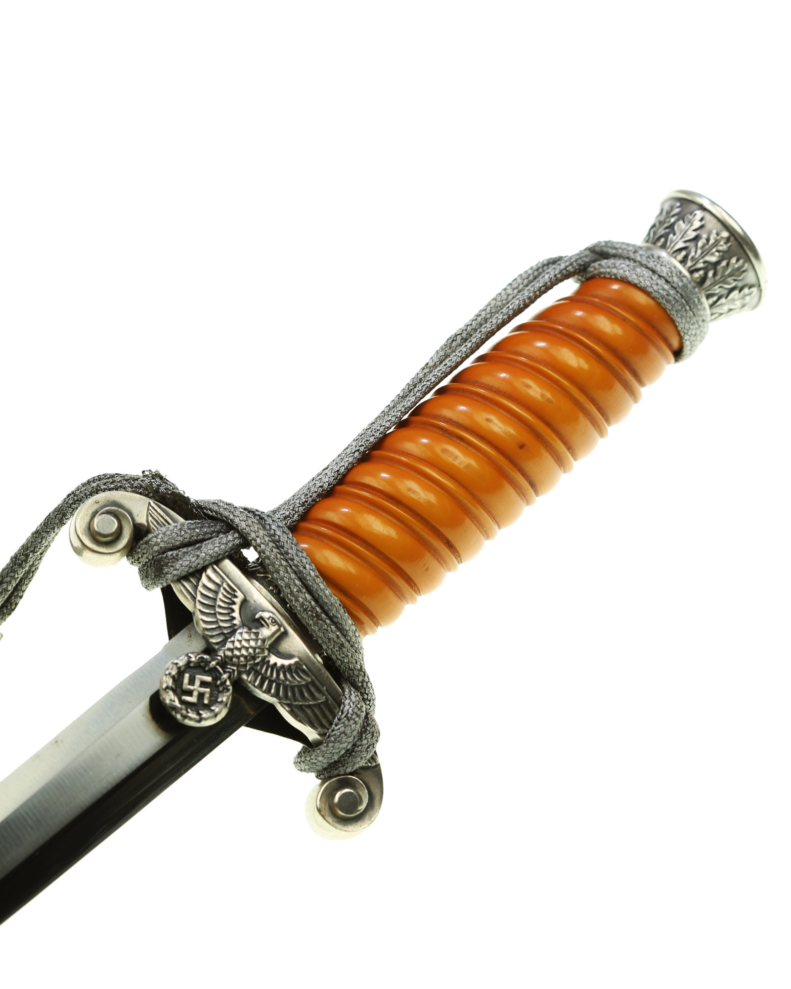 Griff: Der Griff ist rund mit zweifach verdrehten Kanneluren. Der Griff besteht aus gelben Trolon. Die Form der Kanneluren ist konvex bzw. nach außen gewölbt. Der Knauf ist konisch und ist auf die Klingenangel festgeschraubt, er ist mit 12 Eichenlaubblätter verziert. Am unteren Ende des Griffes befindet sich der Griffring, der mit 6 Eichenblätter in einer Reihe nebeneinander verziert ist. Die Parierstange ist in Form eines Reichsadlers, der nach links schaut. Zu den beiden Enden hin wirbeln die Flügel nach unten. In der Mitte befindet sich der Adler, der in seinen Krallen einen Kranz mit dem Hakenkreuz festhält.