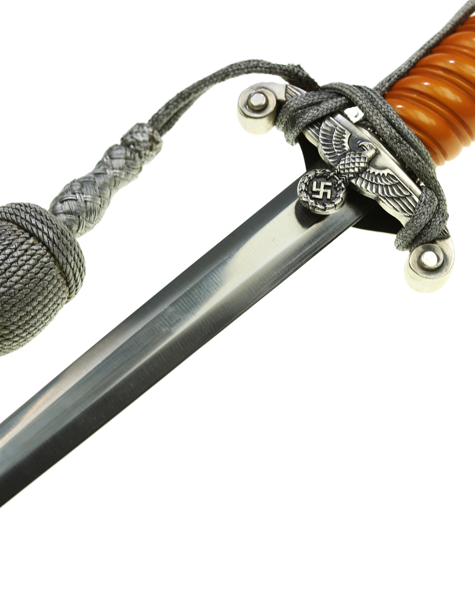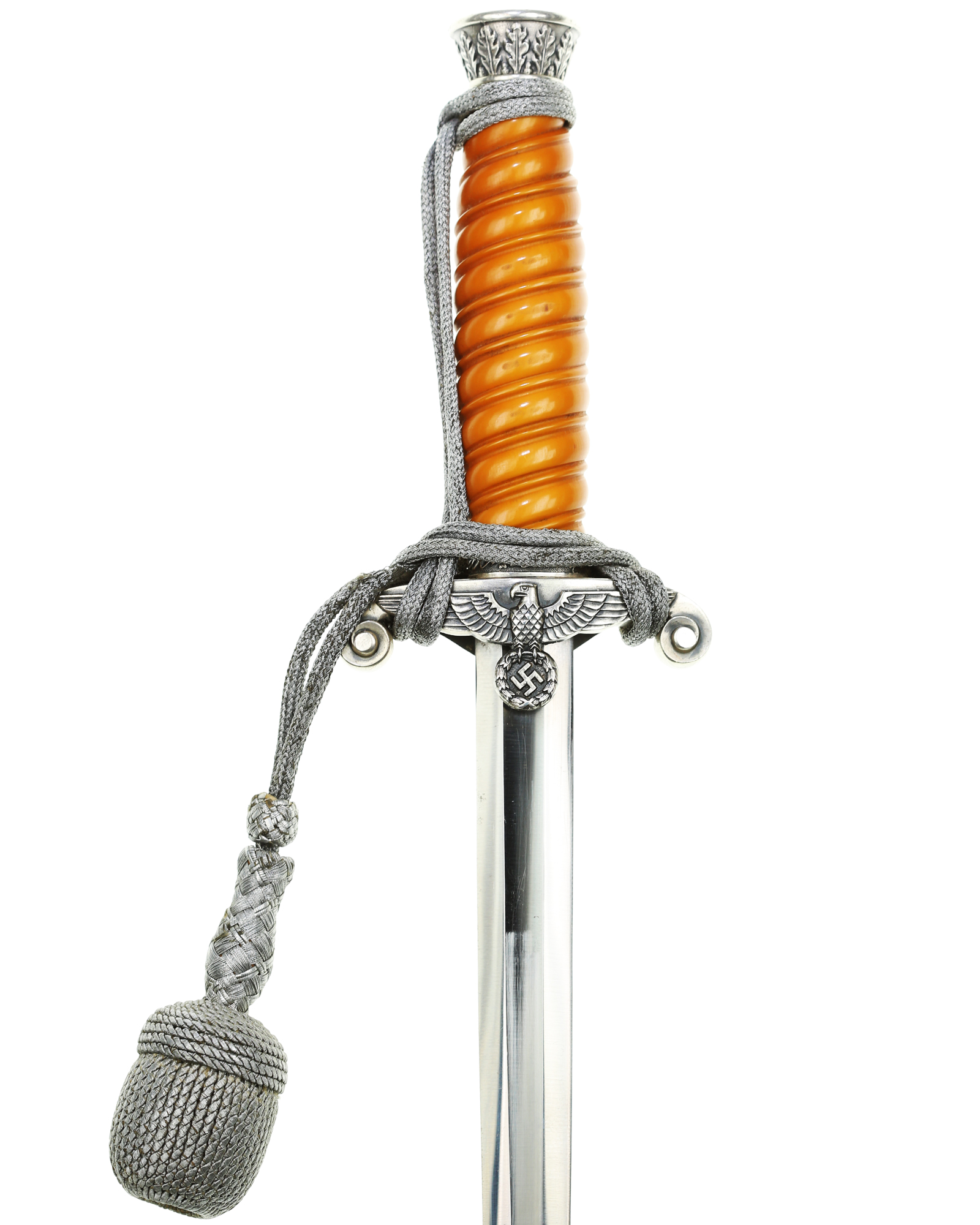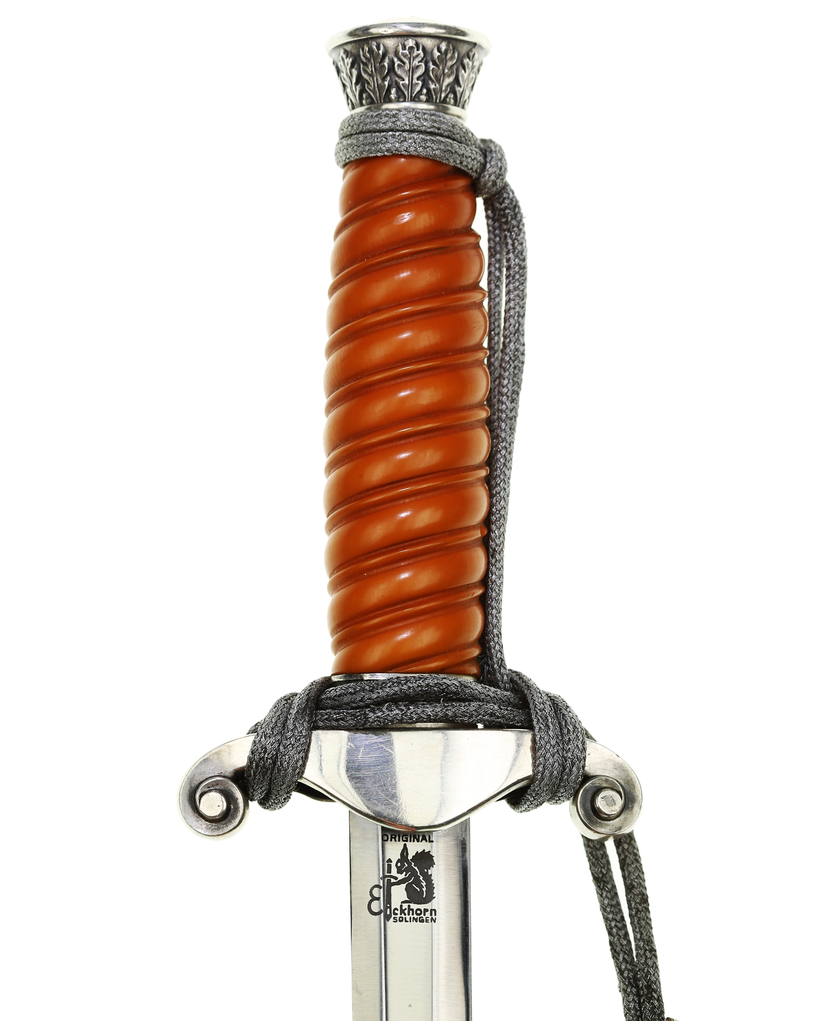 Griff: Der Griff ist rund mit zweifach verdrehten Kanneluren. Der Griff besteht aus gelben Trolon. Die Form der Kanneluren ist konvex bzw. nach außen gewölbt. Der Knauf ist konisch und ist auf die Klingenangel festgeschraubt, er ist mit 12 Eichenlaubblätter verziert. Am unteren Ende des Griffes befindet sich der Griffring, der mit 6 Eichenblätter in einer Reihe nebeneinander verziert ist. Die Parierstange ist in Form eines Reichsadlers, der nach links schaut. Zu den beiden Enden hin wirbeln die Flügel nach unten. In der Mitte befindet sich der Adler, der in seinen Krallen einen Kranz mit dem Hakenkreuz festhält.