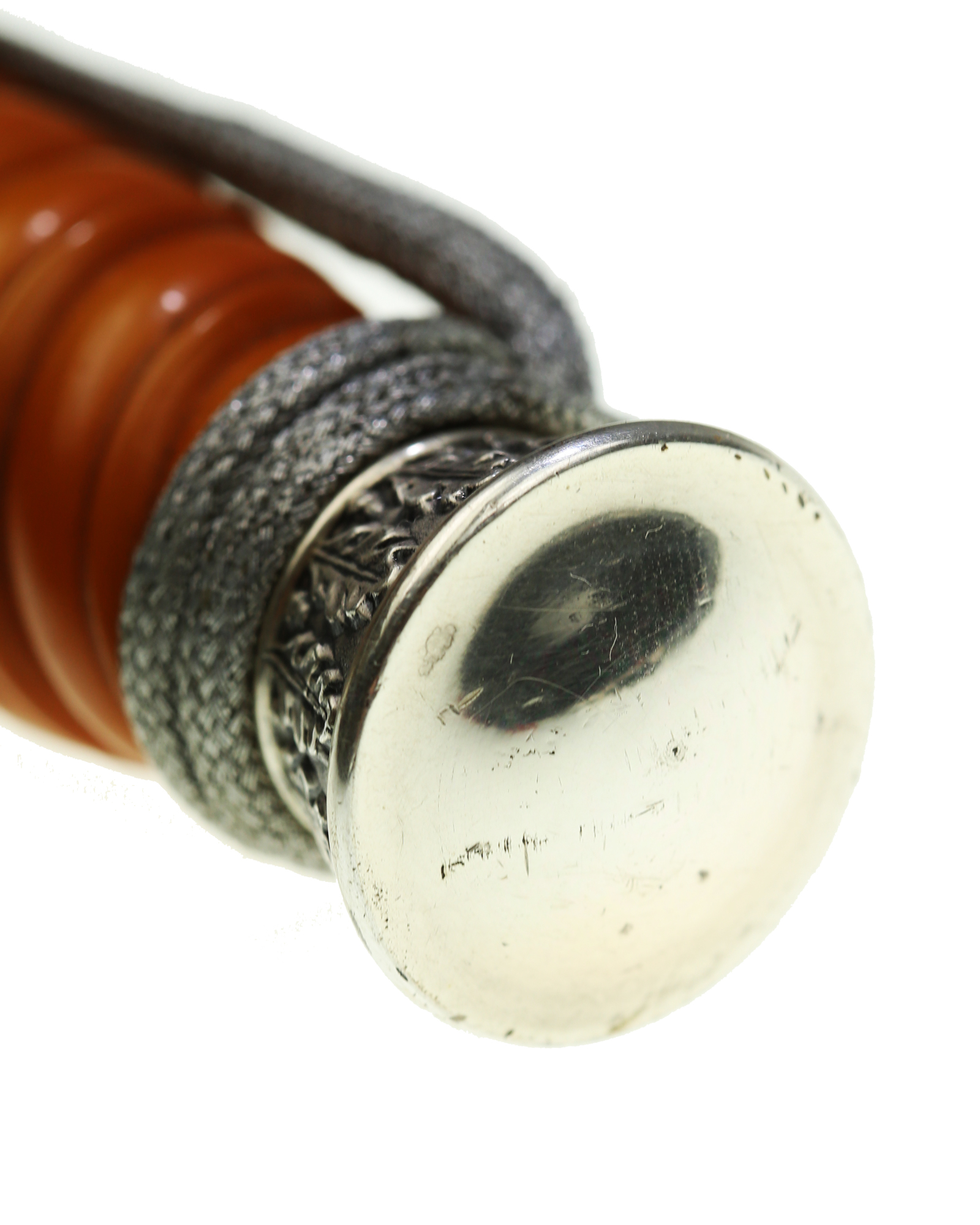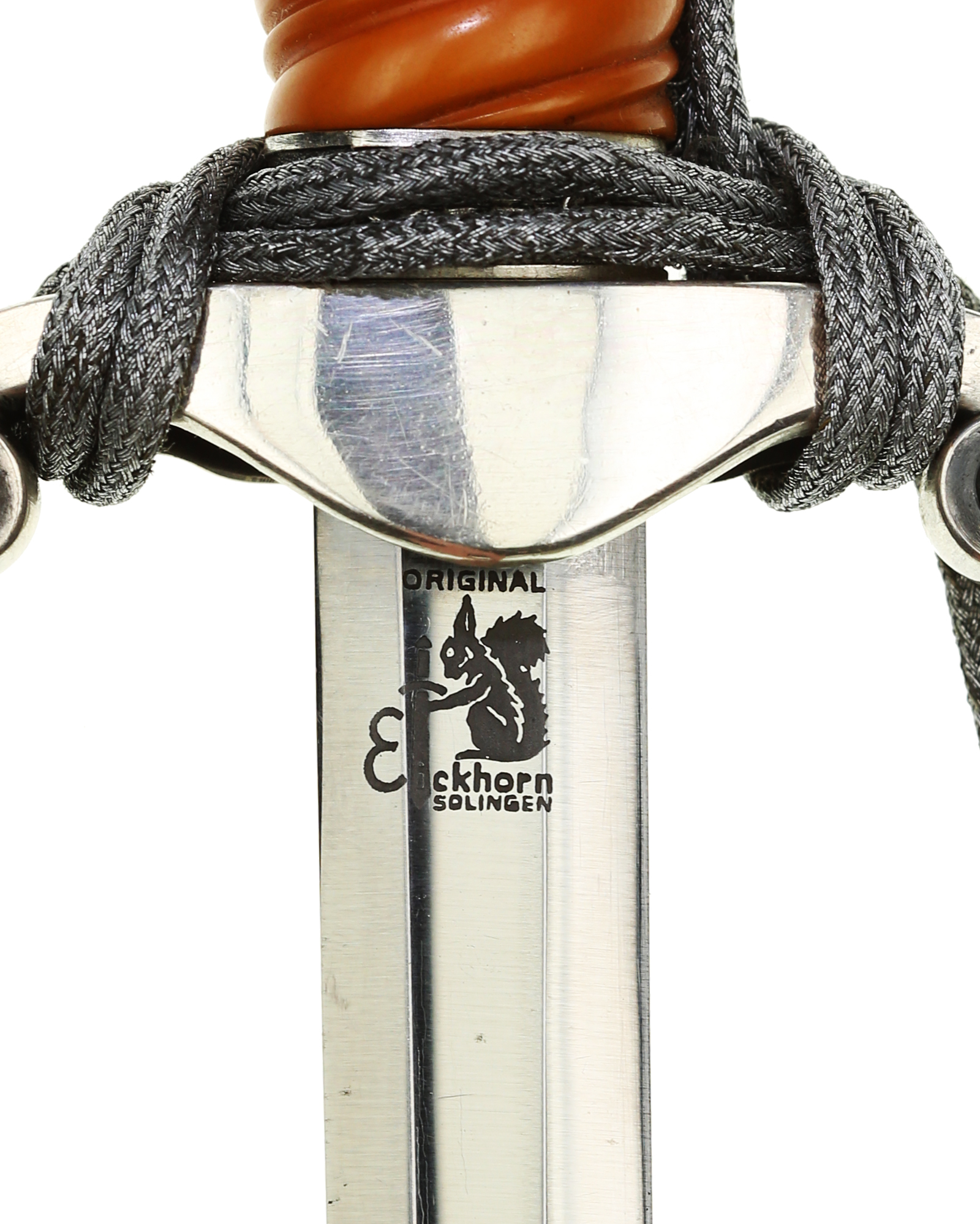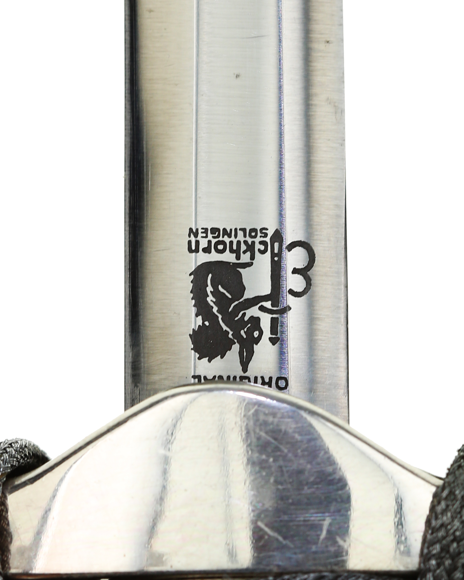Klinge: Die Klinge ist sehr sauber im neuwertigen Zustand mit 100% vom sog. "Crossgrain". Auf der Rückseite der Klinge befindet sich das geschlagene Herstellerlogo: Carl Eickhorn Solingen. Die Klingenspitze ist zu 100% noch erhalten und ungekürzt. Zwischen den Schultern der Klinge und der unteren Parierstange ist befindet sich das originale Stoßleder.