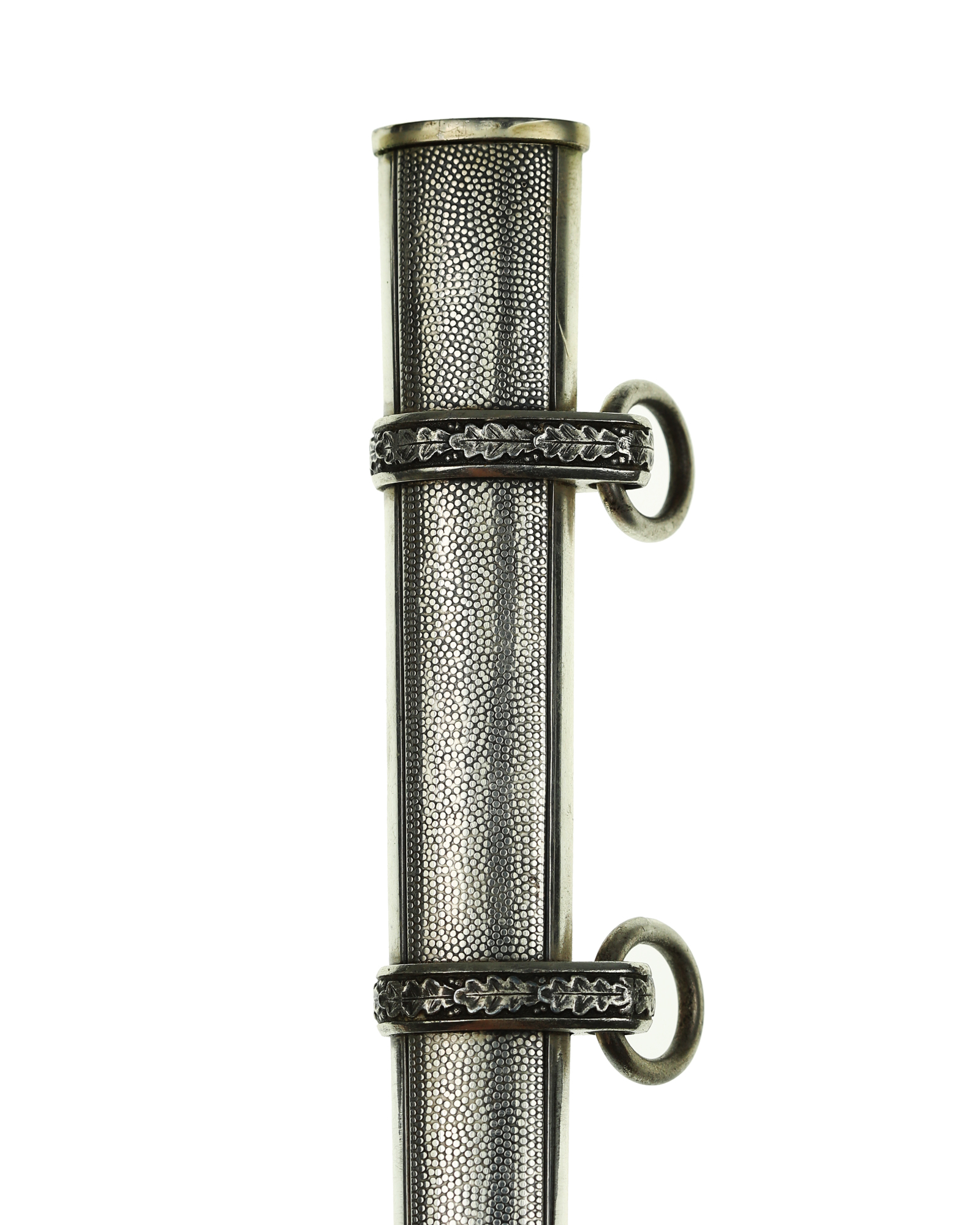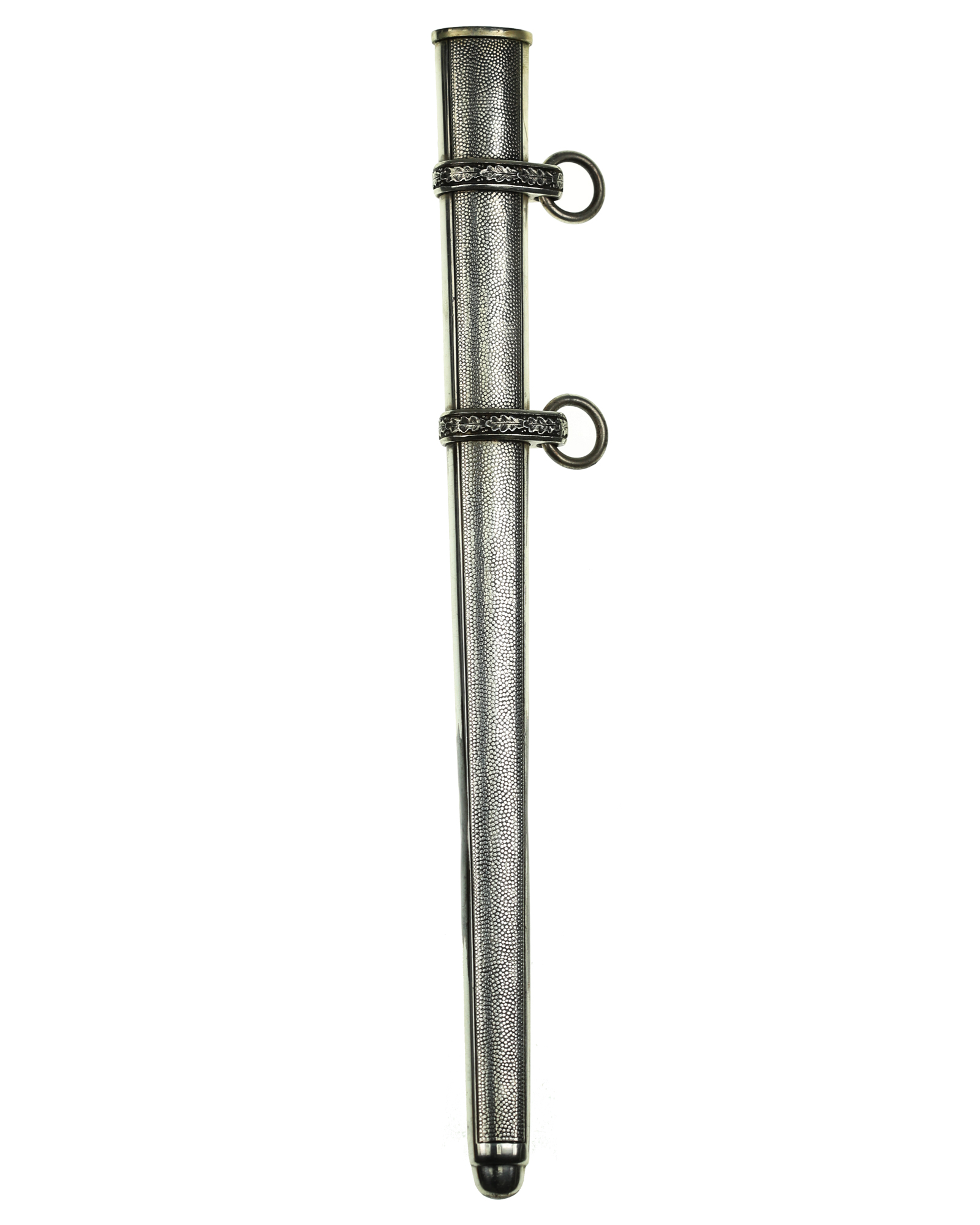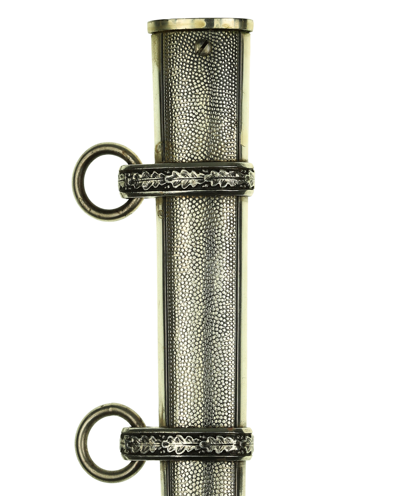 Scheide: Die Scheide besteht aus Mundblech und aus zwei Eichenlaub verzierten Scheidenbändern mit zwei losen Trageringen, diese sind komplett geschlossen. Die Scheide ist aus einem Stahlblech gezogen und auf der Vorder- und Rückseite mit körniger Oberflächenstruktur versehen. Die Spitze ist abgerundet und nicht eingedrückt. Das Mundstück ist separat eingesetzt und auf der Rückseite mit einer Schraube befestigt.