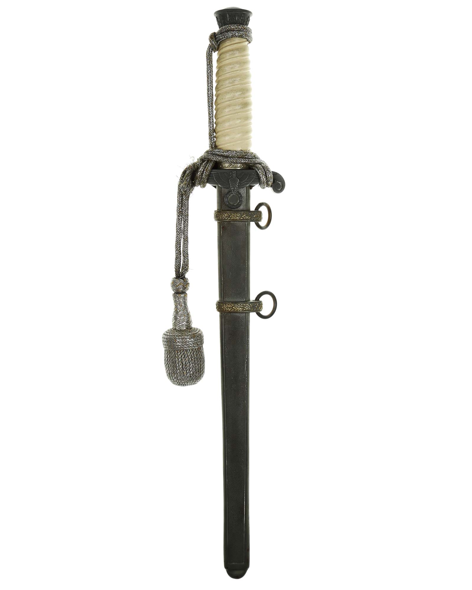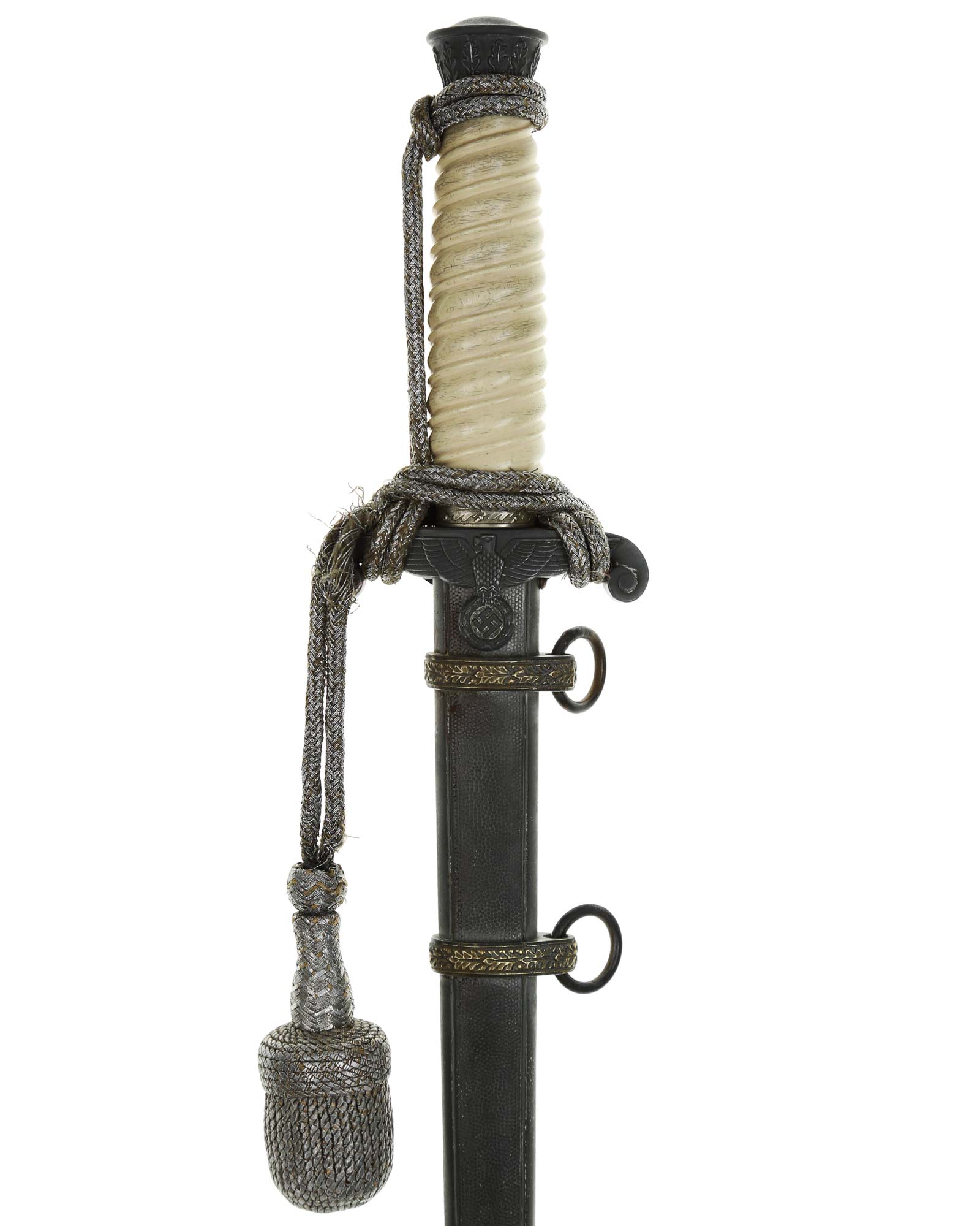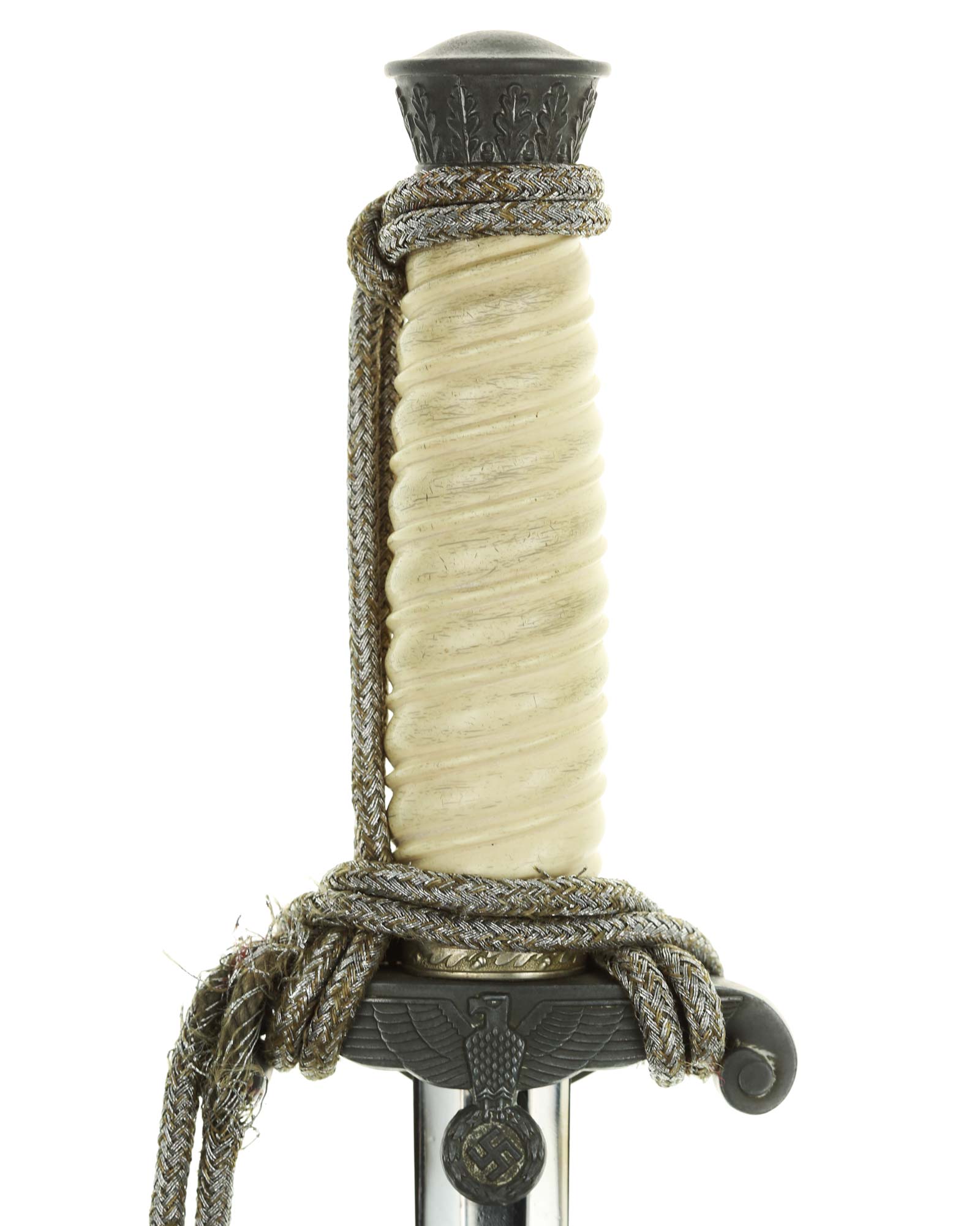 Griff: Der Griff ist rund mit zweifach verdrehten Kanneluren. Der Griff besteht aus Galalith. Die Form der Kanneluren ist konvex bzw. nach außen gewölbt. Der Knauf ist konisch und ist auf die Klingenangel festgeschraubt, er ist mit 12 Eichenlaubblätter verziert. Am unteren Ende des Griffes befindet sich der Griffring, der mit 7 Eichenblätter in einer Reihe nebeneinander verziert ist. Die Parierstange ist in Form eines Reichsadlers, der nach links schaut. Zu den beiden Enden hin wirbeln die Flügel nach unten. In der Mitte befindet sich der Adler, der in seinen Krallen einen Kranz mit dem Hakenkreuz festhält.