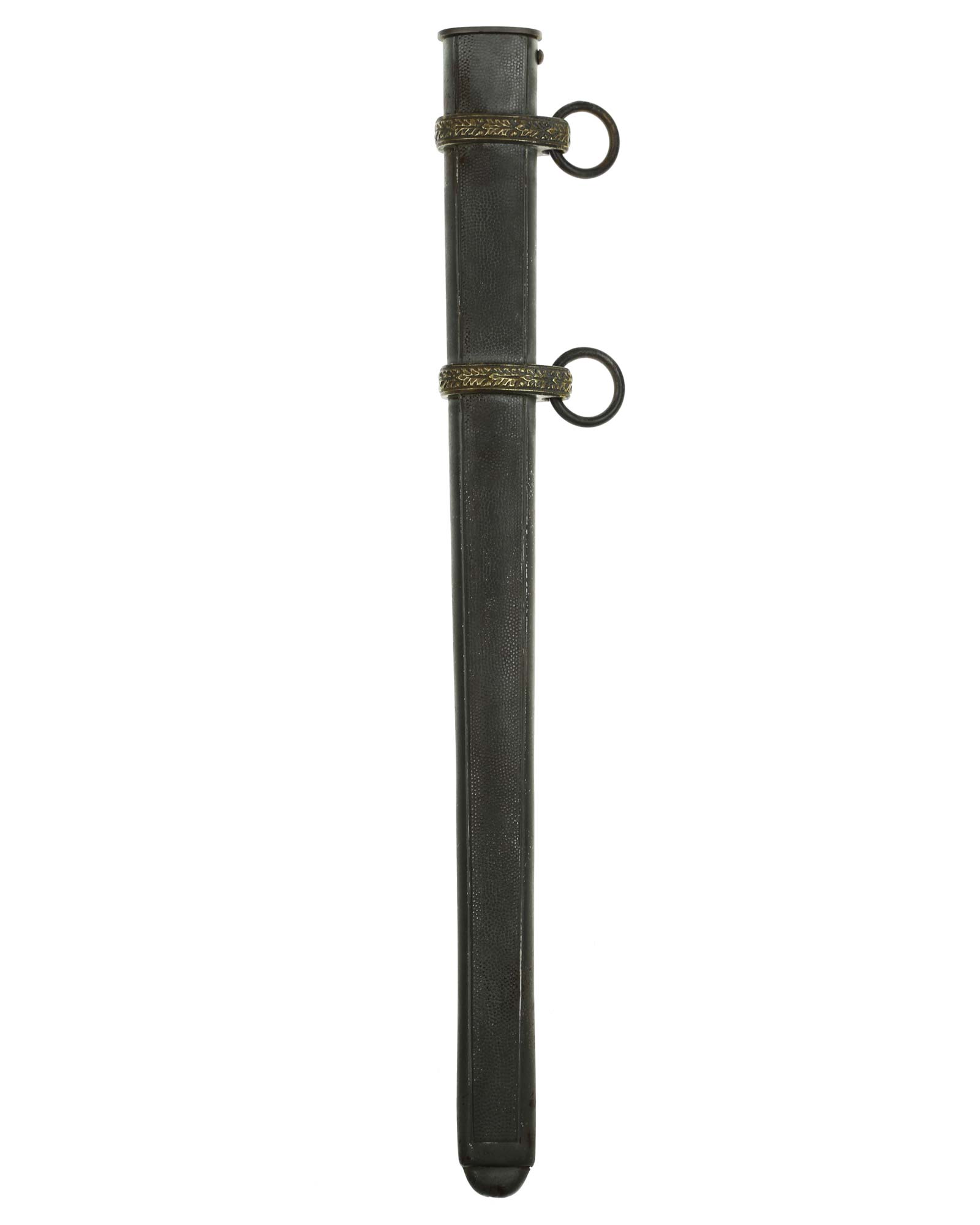 Scheide: Die Scheide besteht aus Mundblech und aus zwei Eichenlaub verzierten Scheidenbändern mit zwei losen Trageringen, diese sind komplett geschlossen. Die Scheide ist aus einem Stahlblech gezogen und auf der Vorder- und Rückseite mit körniger Oberflächenstruktur versehen. Das Mundstück ist separat eingesetzt und mit einer ungeöffneten Schraube befestigt.