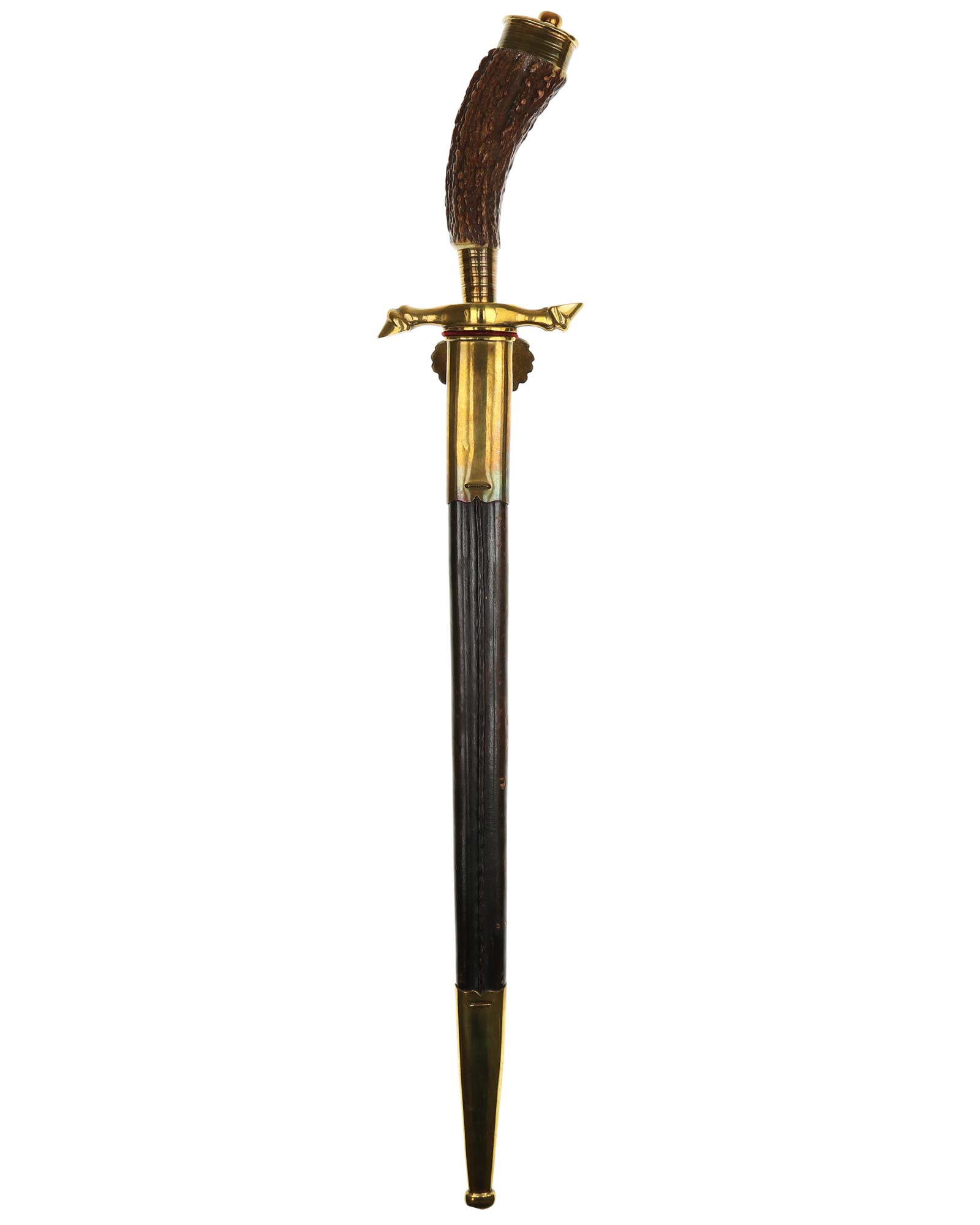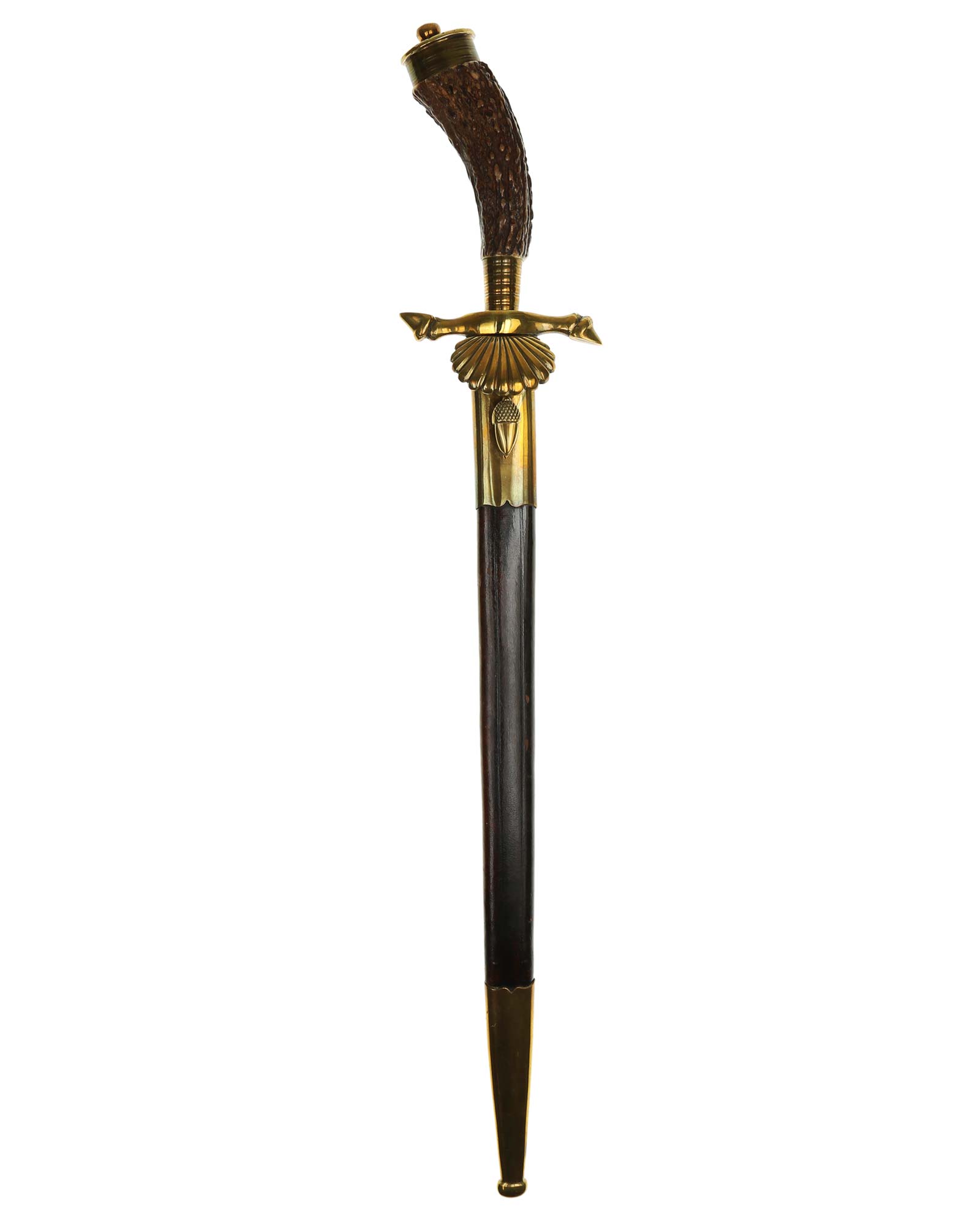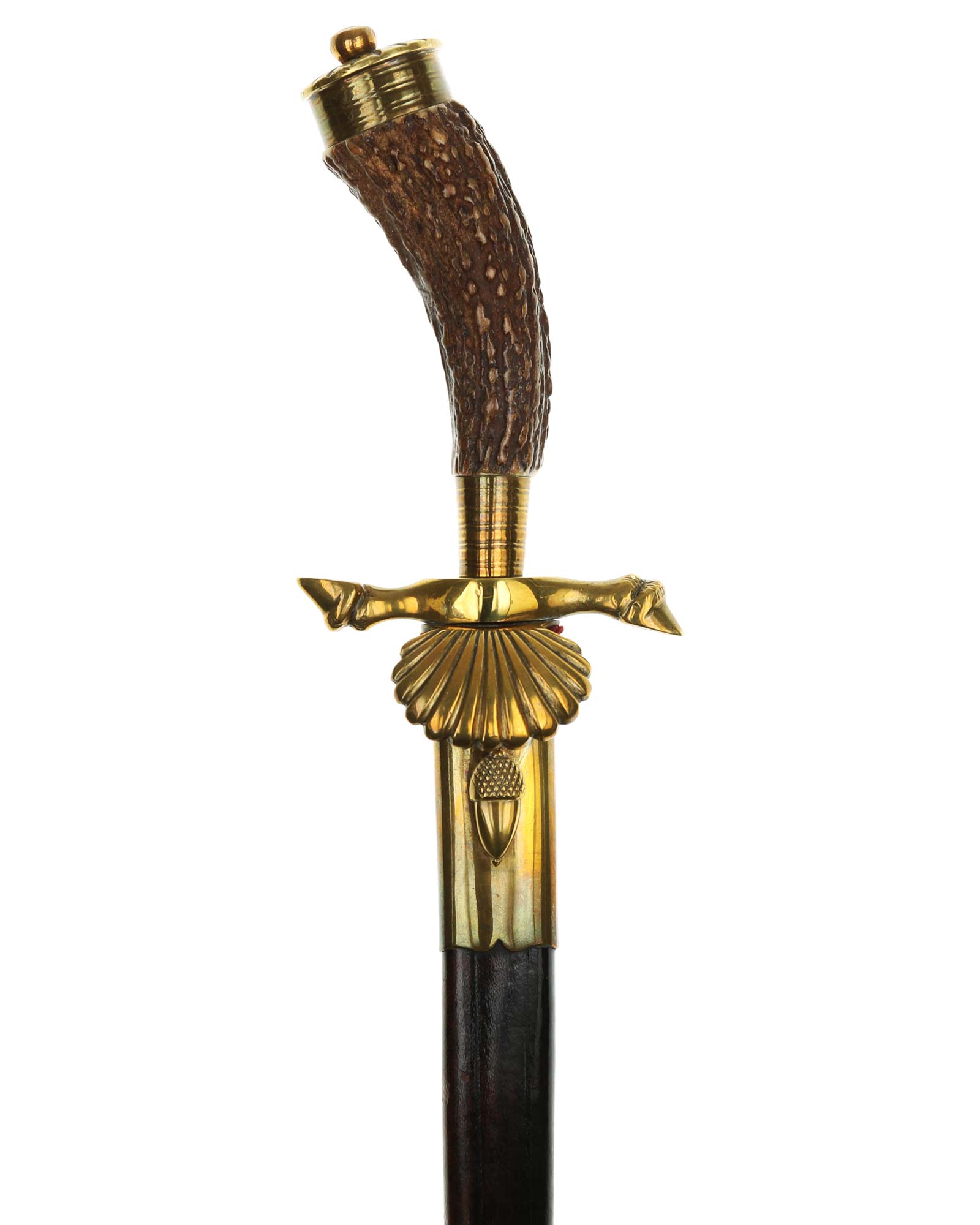 Hirschfänger mit beidseitiger Ätzung von Alcoso. Hirschhorngriff zur Seite gebogen. Schmaler Griffring und ovale Griffkappe mit Hutmutter verschraubt an der Klingenangel. Parierstange in Form von zwei Hirschbeinen, nach oben und unten zeigend. Stichblatt in Form einer Muschel. Die vernickelte Keilklinge ist mit geätzten Jagdszenen. Auf der Fehlschärfe befindet sich die Herstellermarke ACS Alcoso Solingen. Die Scheide ist aus Stahl mit zwei Beschlägen.