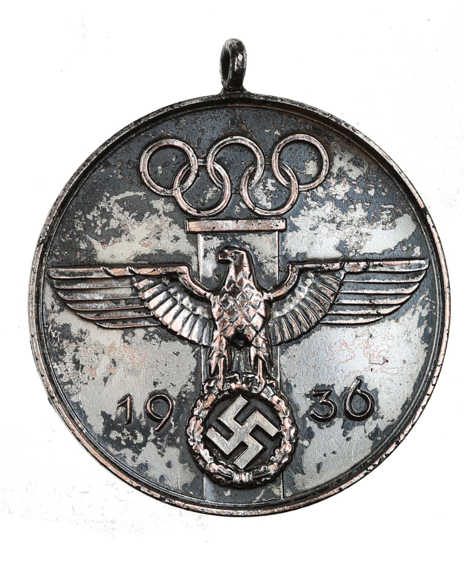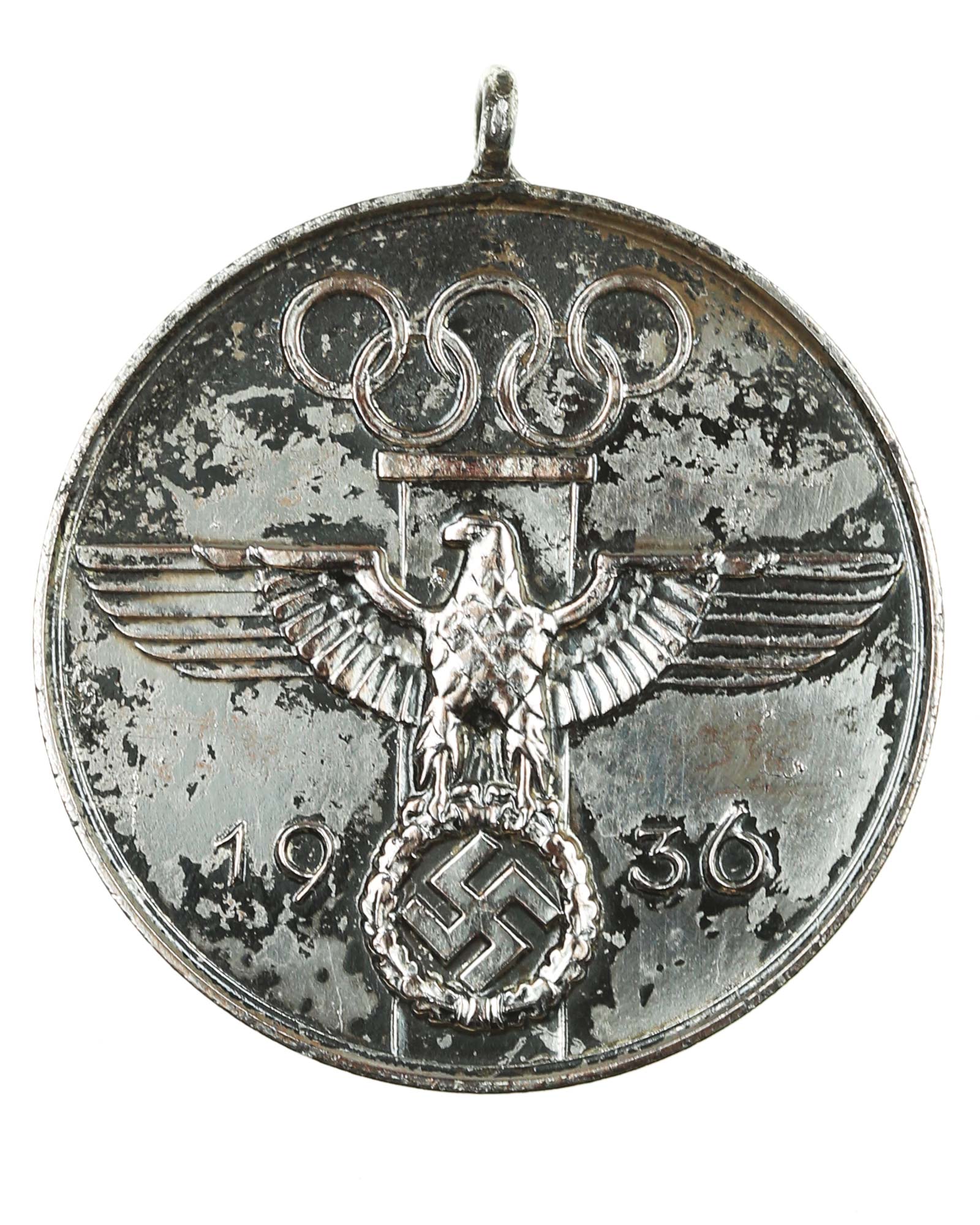 Deutsche Olympia-Medaille 1936 aus Eisen, versilbert. Gewicht: 16 g, Durchmesser: 37 mm. Rückseite mit Inschrift: Für verdienstvolle Mitarbeit bei den Olympischen Spielen 1936.