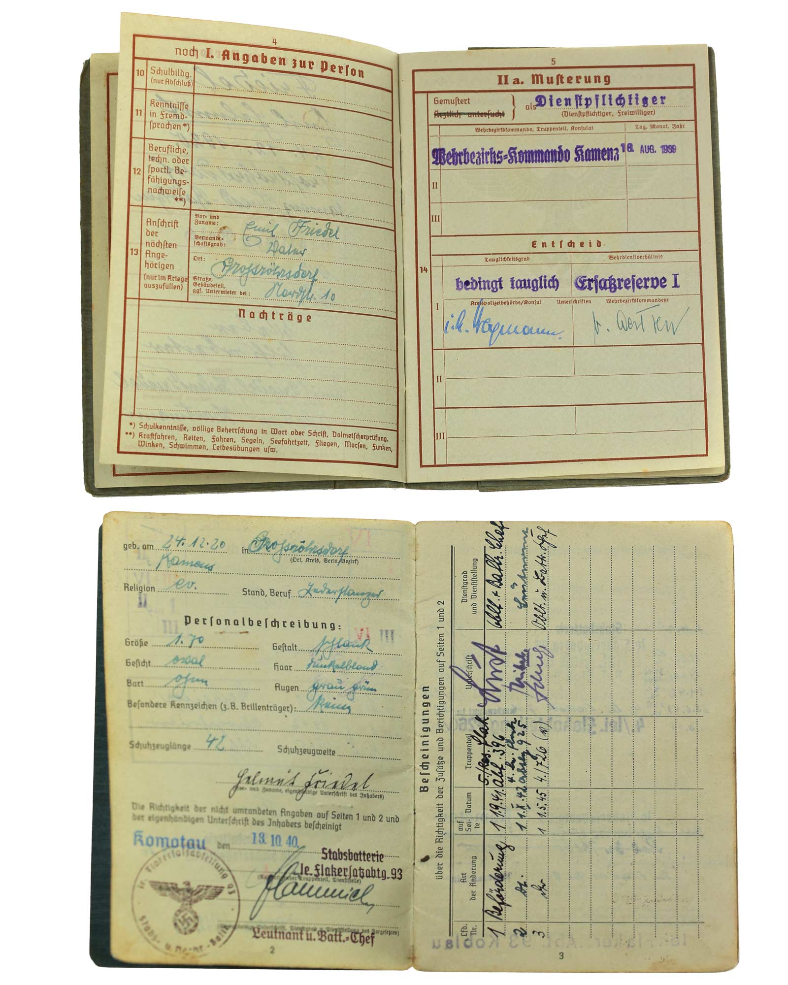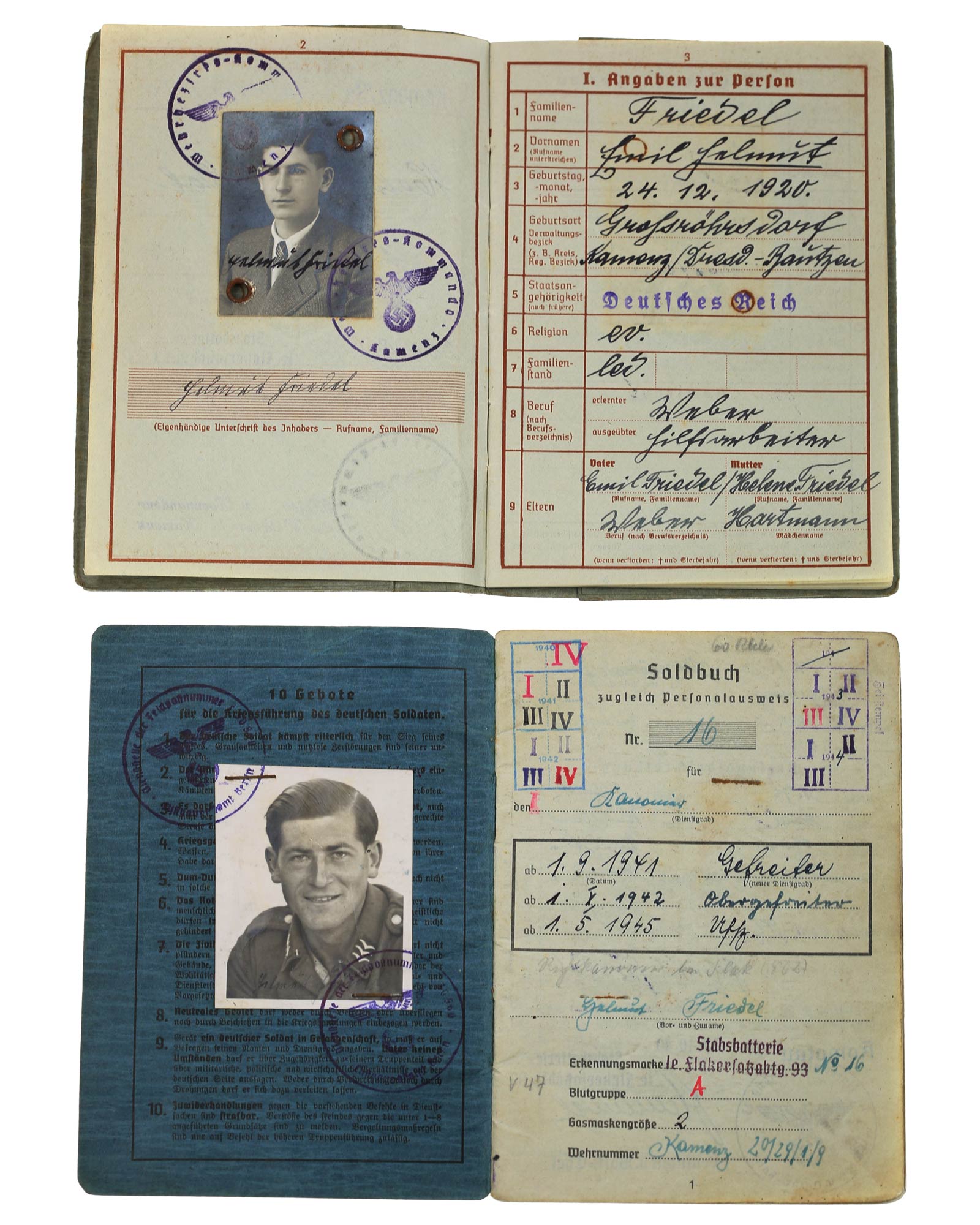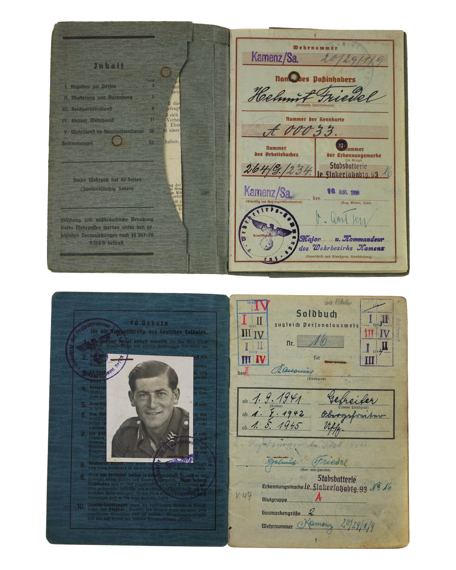 Wehrpass und Soldbuch für einen späteren Unteroffizier aus Kamenz/Sachsen des Jahrgangs 1920.