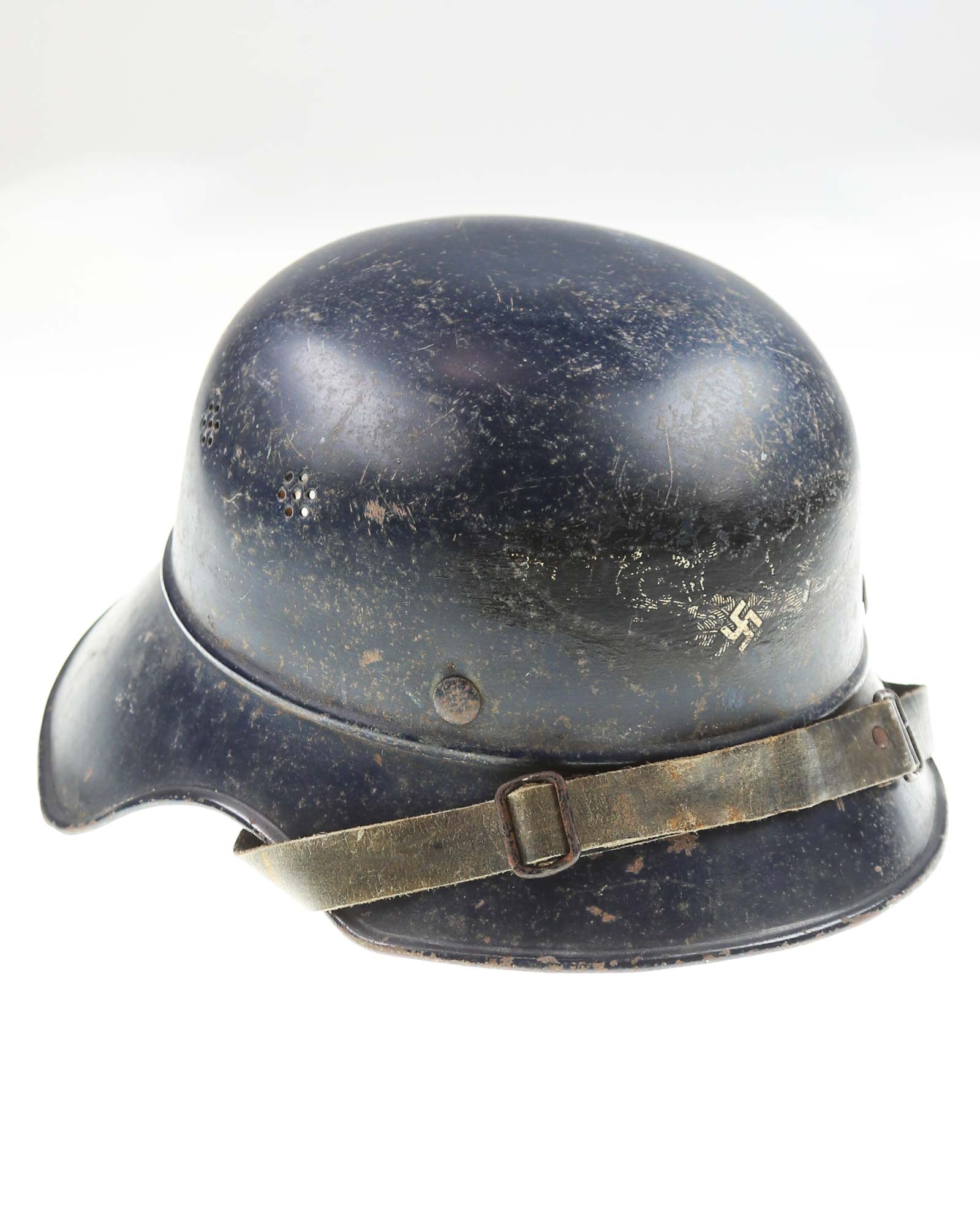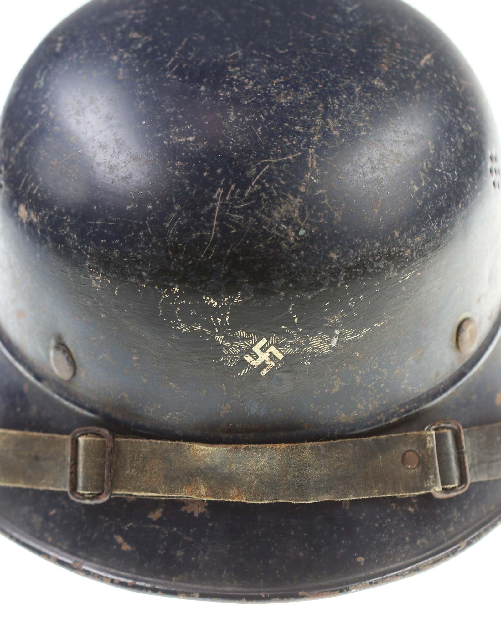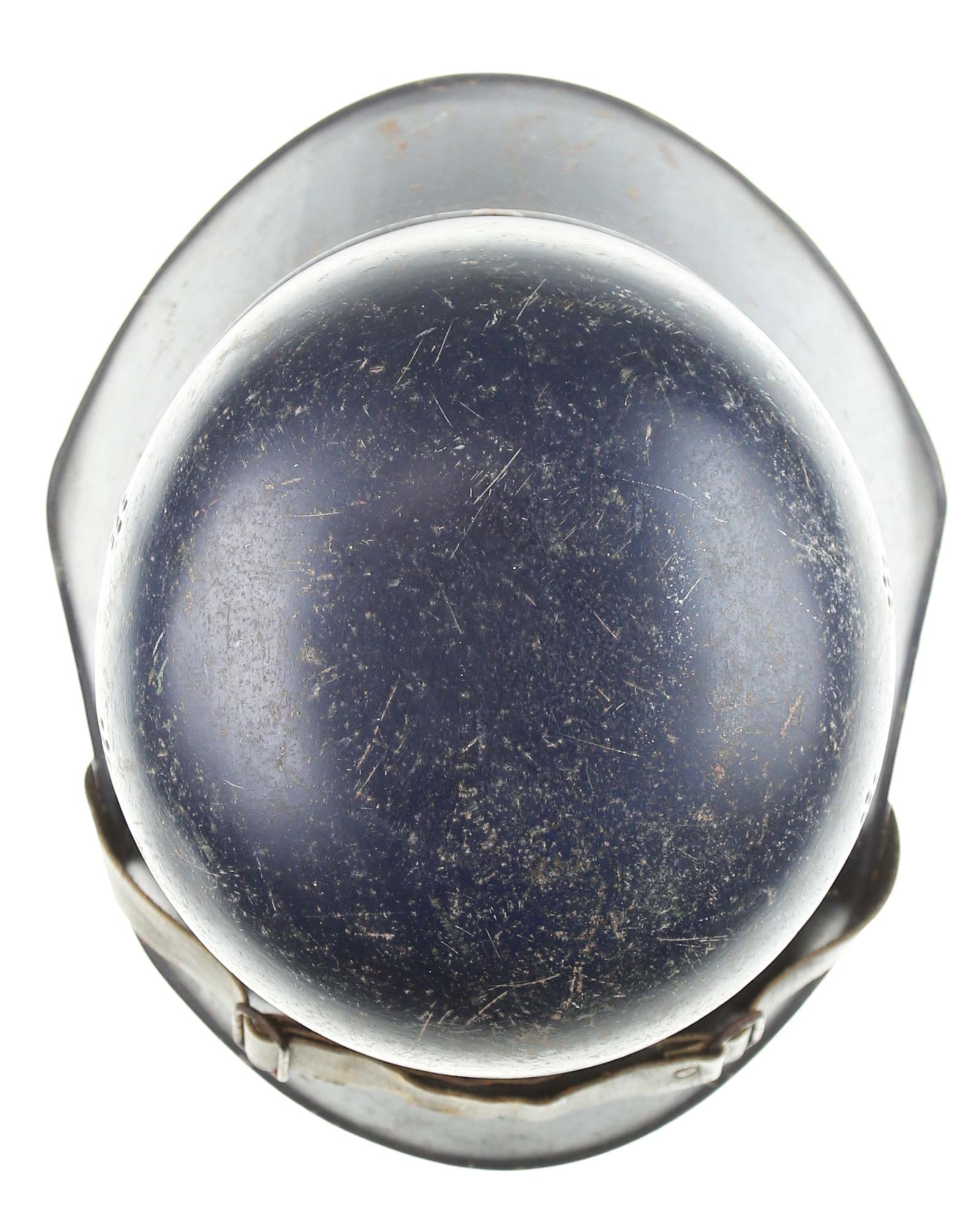 Reichsluftschutzbund Stahlhelm in einem gut erhaltenem Zustand mit einem Abzeichen. Modell M38, sog. Gladiator Helm. Original erhaltene RLB blaue Lackierung, frontseitig zum Teil erhaltene Luftschutzschwinge als Hoheitsabzeichen des RLB mit Hakenkreuz. Die Helmglocke ist innen gestempelt mit dem Hersteller: RL2-40/28 - Paul Diener, Metalldrückerei und Stanzerei, Bernhardstraße 103, Dresde sowie mit Bezeichnung und Kopfgröße: Vertrieb genehmigt gemäß §8 Luftschutzgesetz, Kopfweite 57.