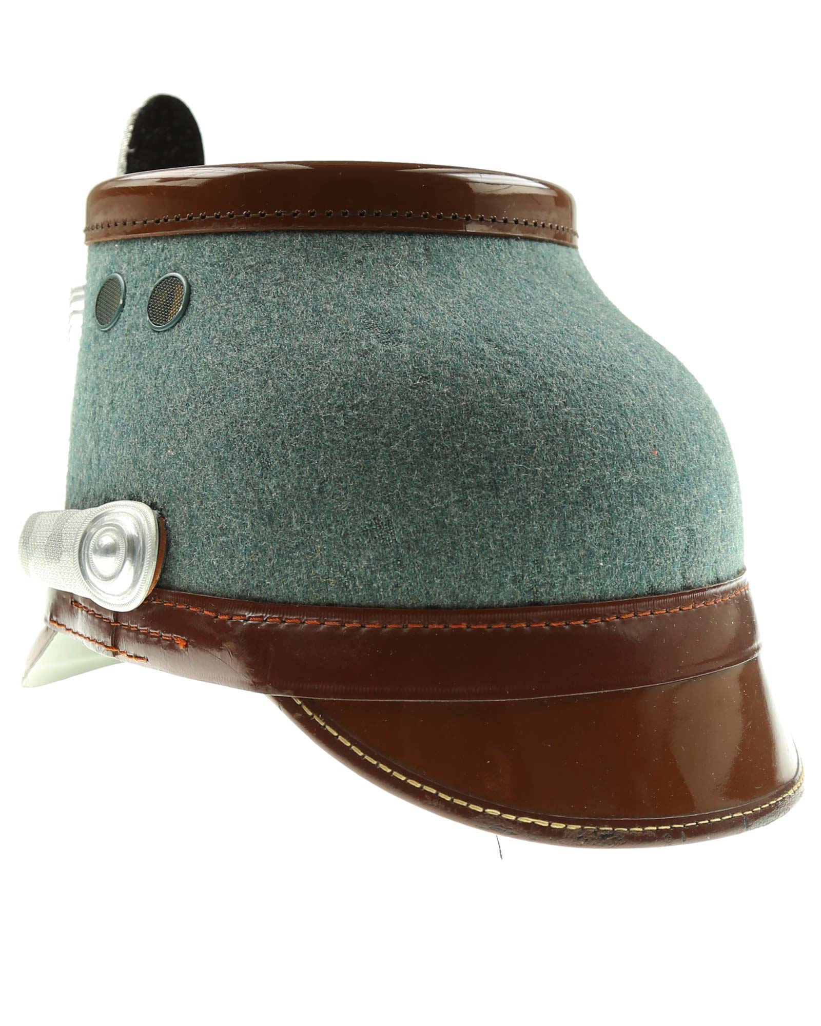 Braunes Polizei Tschako aus Vulkanfiber mit Tuchbezug. Polizeitschako mit Hersteller "Erel Tschako - Eingetr. Warenzeichen". Tschako komplett mit Hoheitsadler in hochgewölbter Offiziersausführung, Schuppenketten aus Aluminium, das Feldzeichen in Aluminiumgespinst. Innen mit hellbraunem Schweißleder und hellem Seidenfutter. Größe 55.
