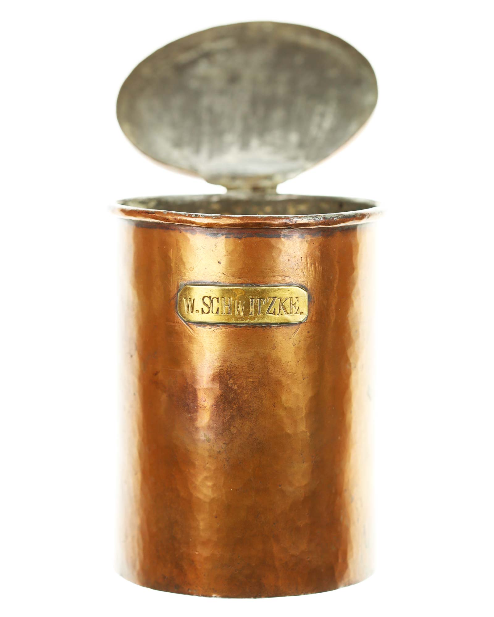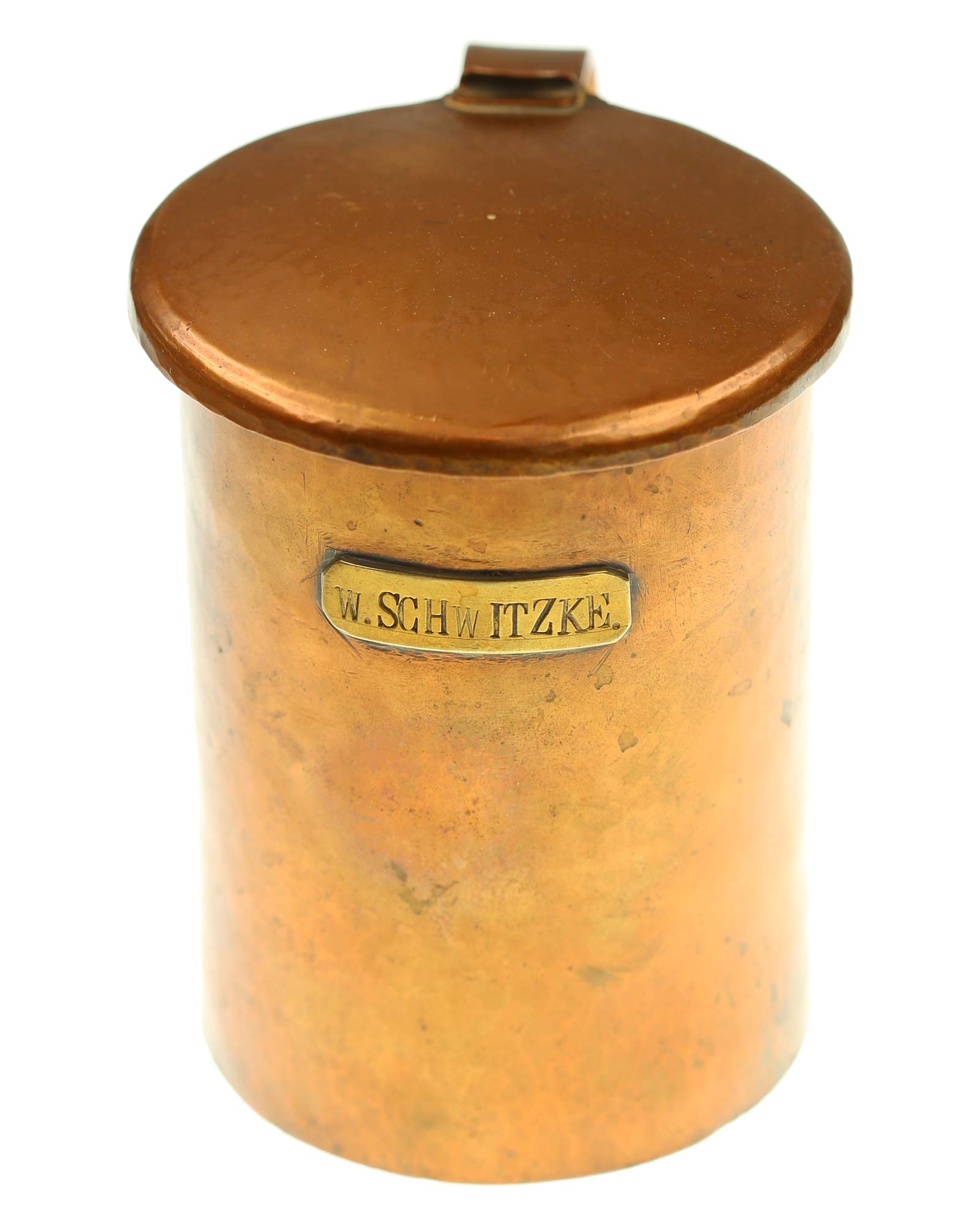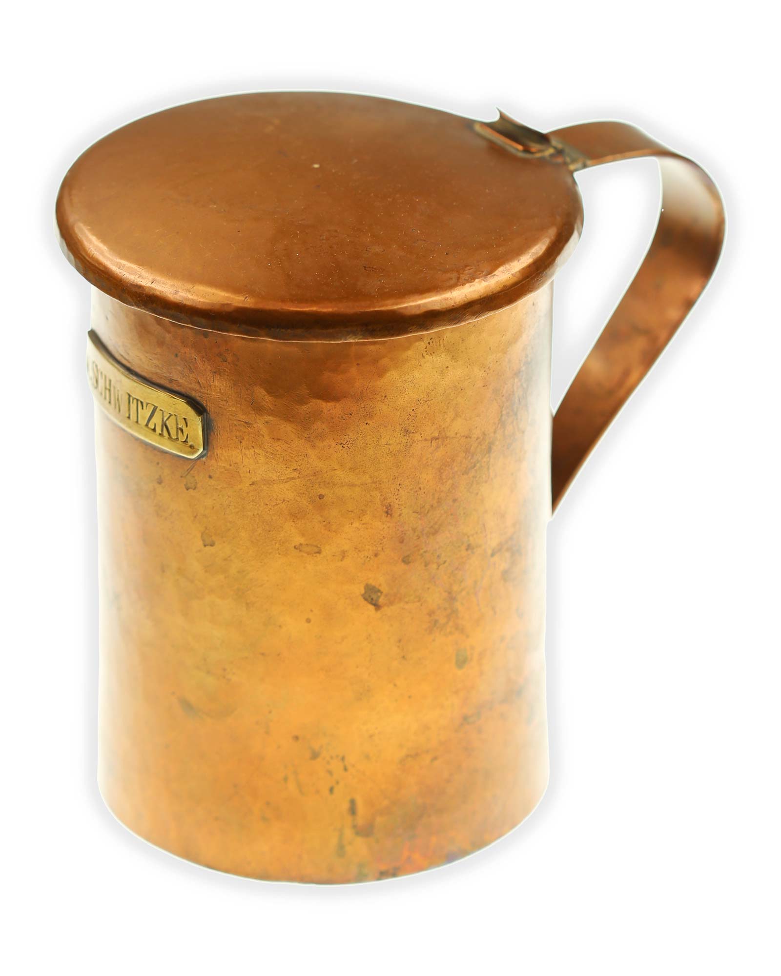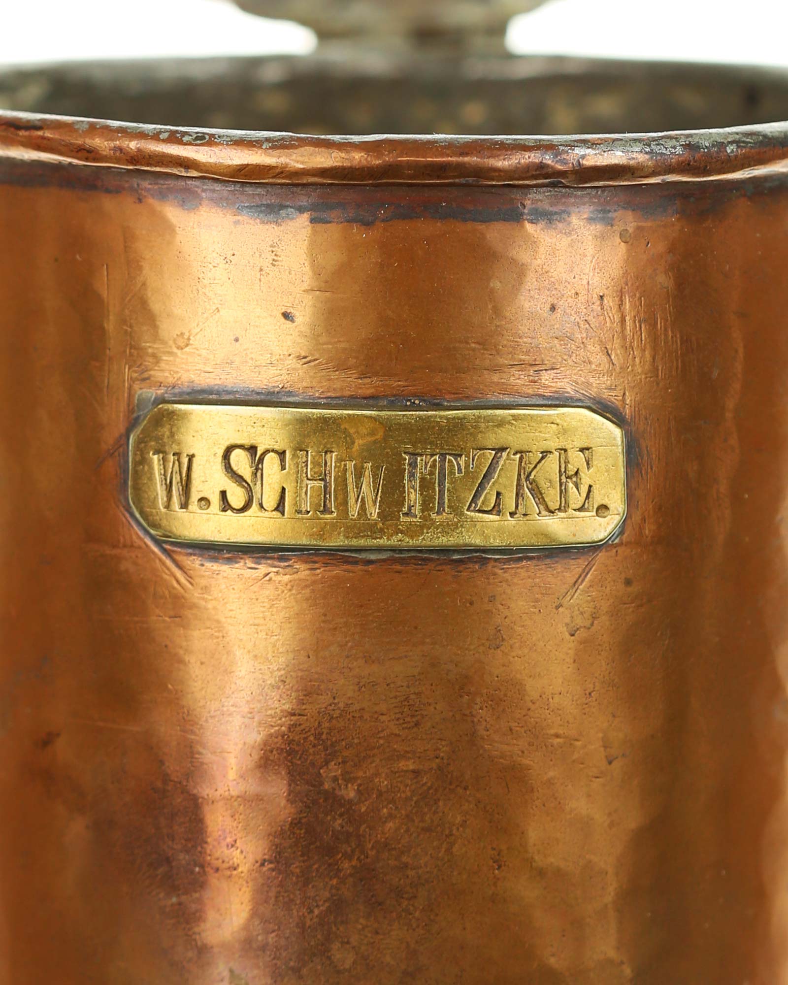 Messing Krug mit Deckel und Widmung (W. Schwitzke).