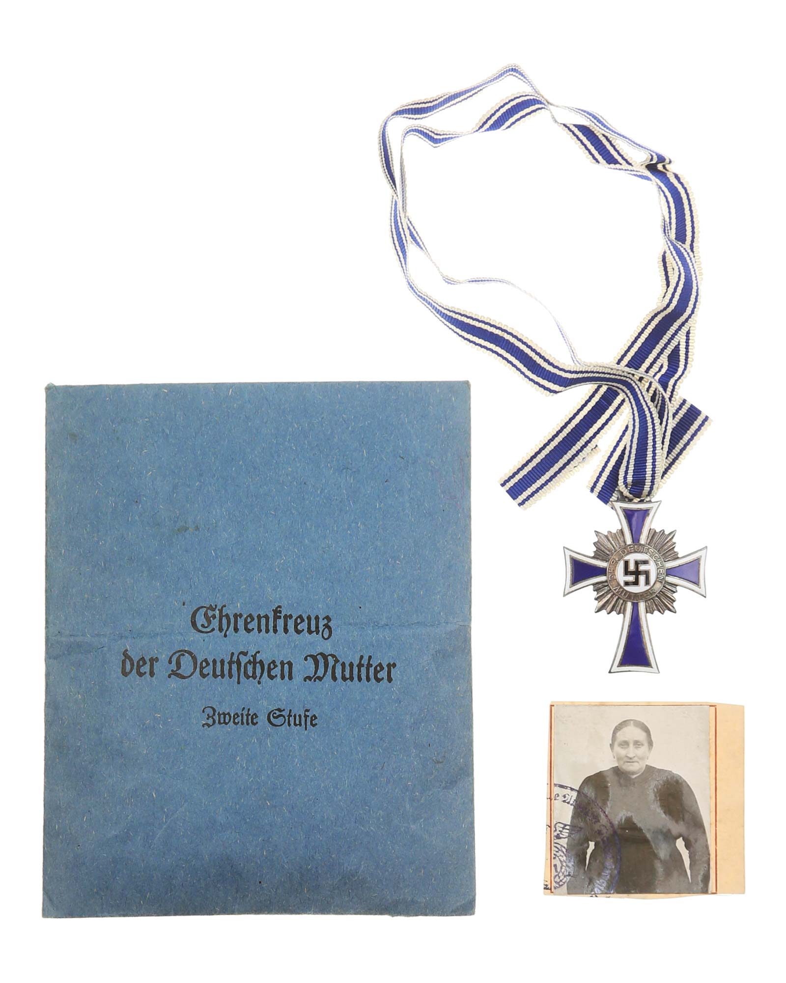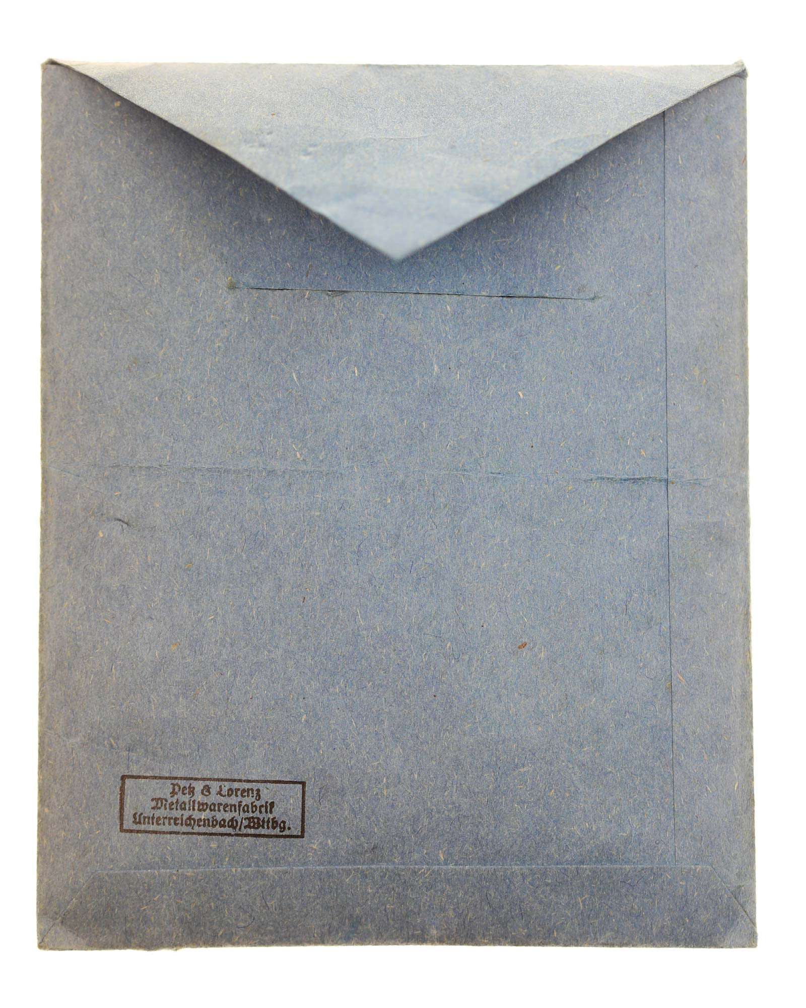 Ehrenkreuz der Deutschen Mutter am Band, 2. Modell in 2. Stufe mit Verkaufstüte und Hersteller: Petz & Lorenz, Metallwarenfabrik Unterreichenbach/Württemberg. Abmaßen: 35,25 x 45,62 mm.