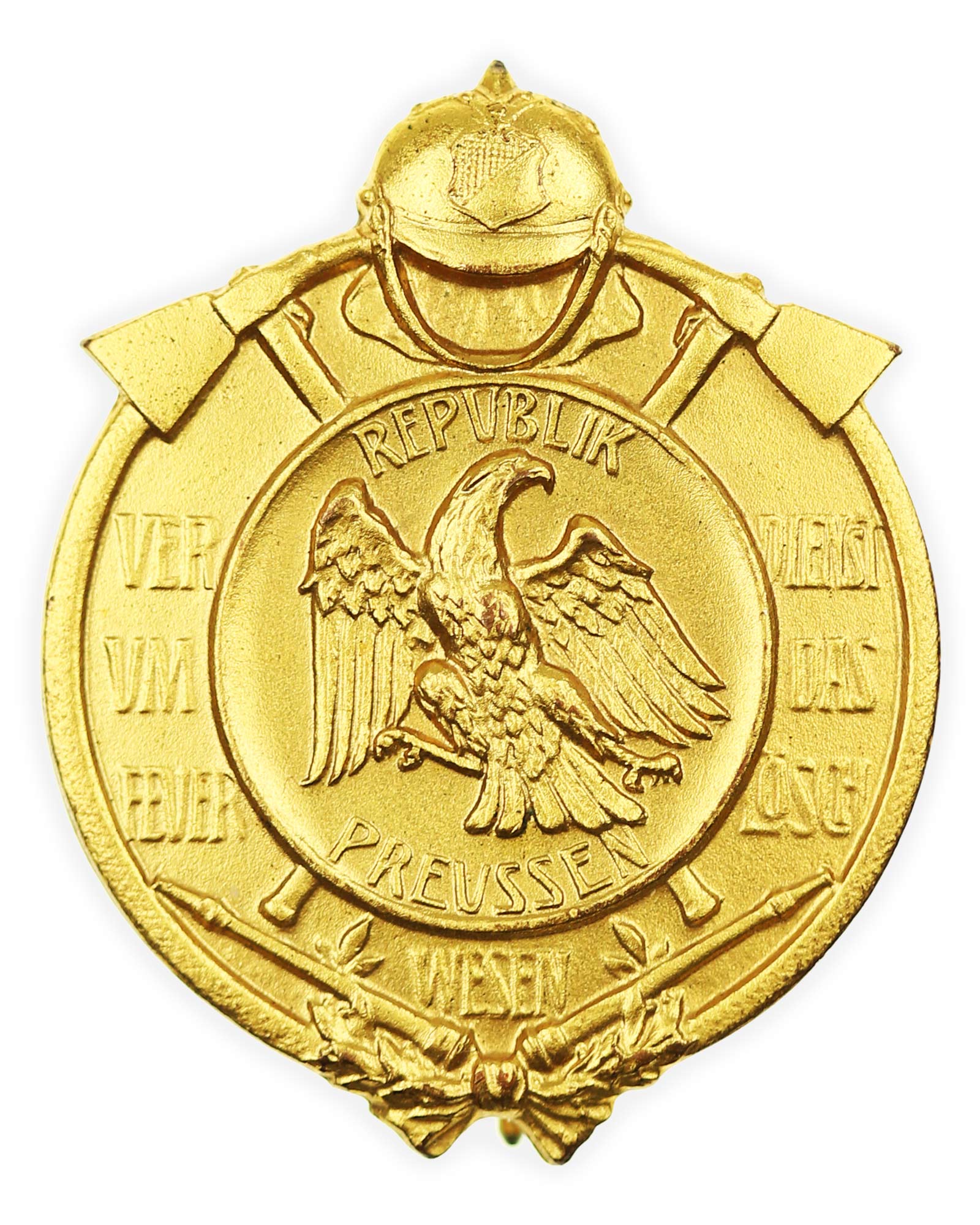 Weimarer Republik Erinnerungszeichen für Verdienste um das Feuerlöschwesen Republik Preußen 1925. Vertikale Nadel. Gesamtgewicht 11 g. Abmessungen: 31,21 x 38,12 mm.