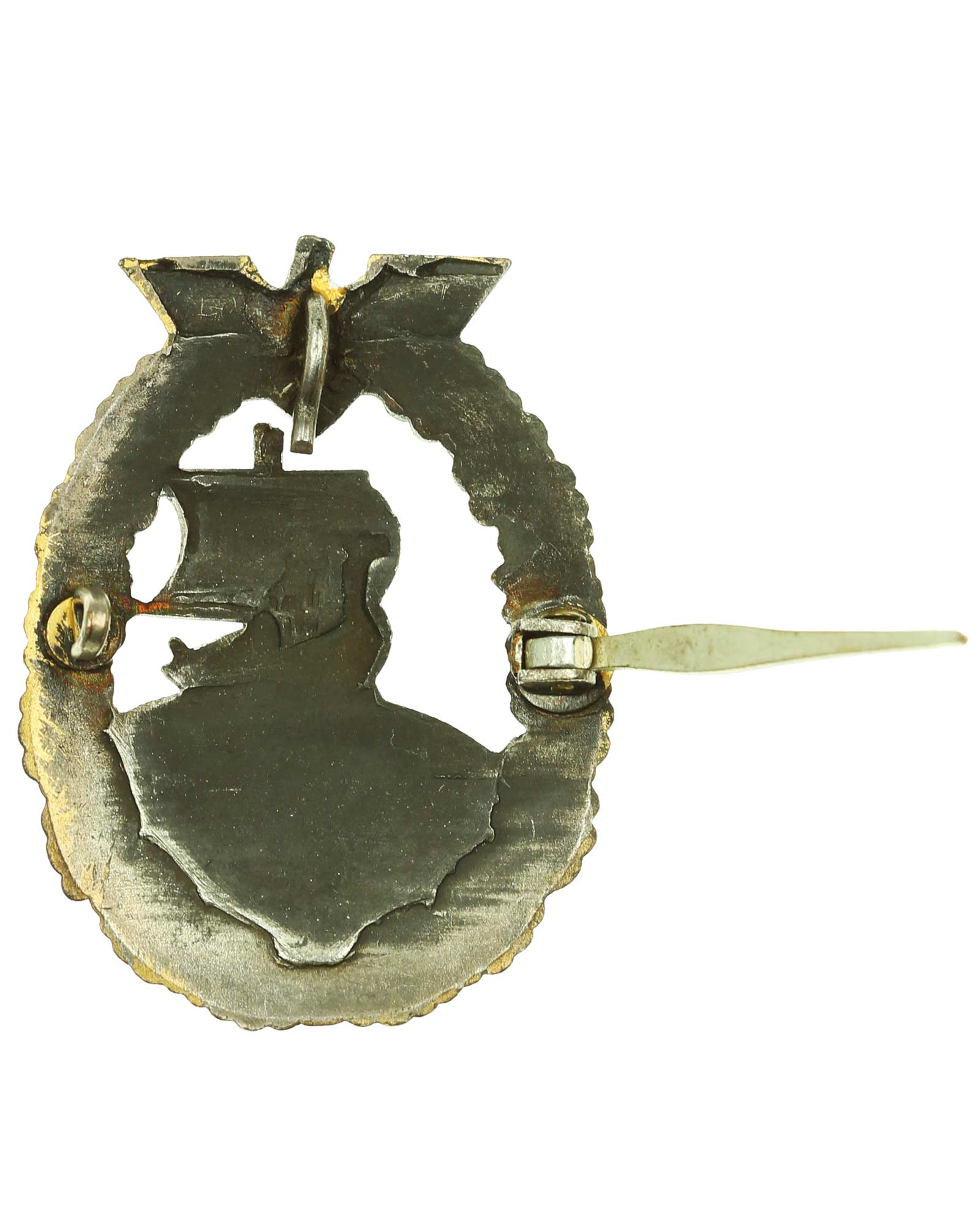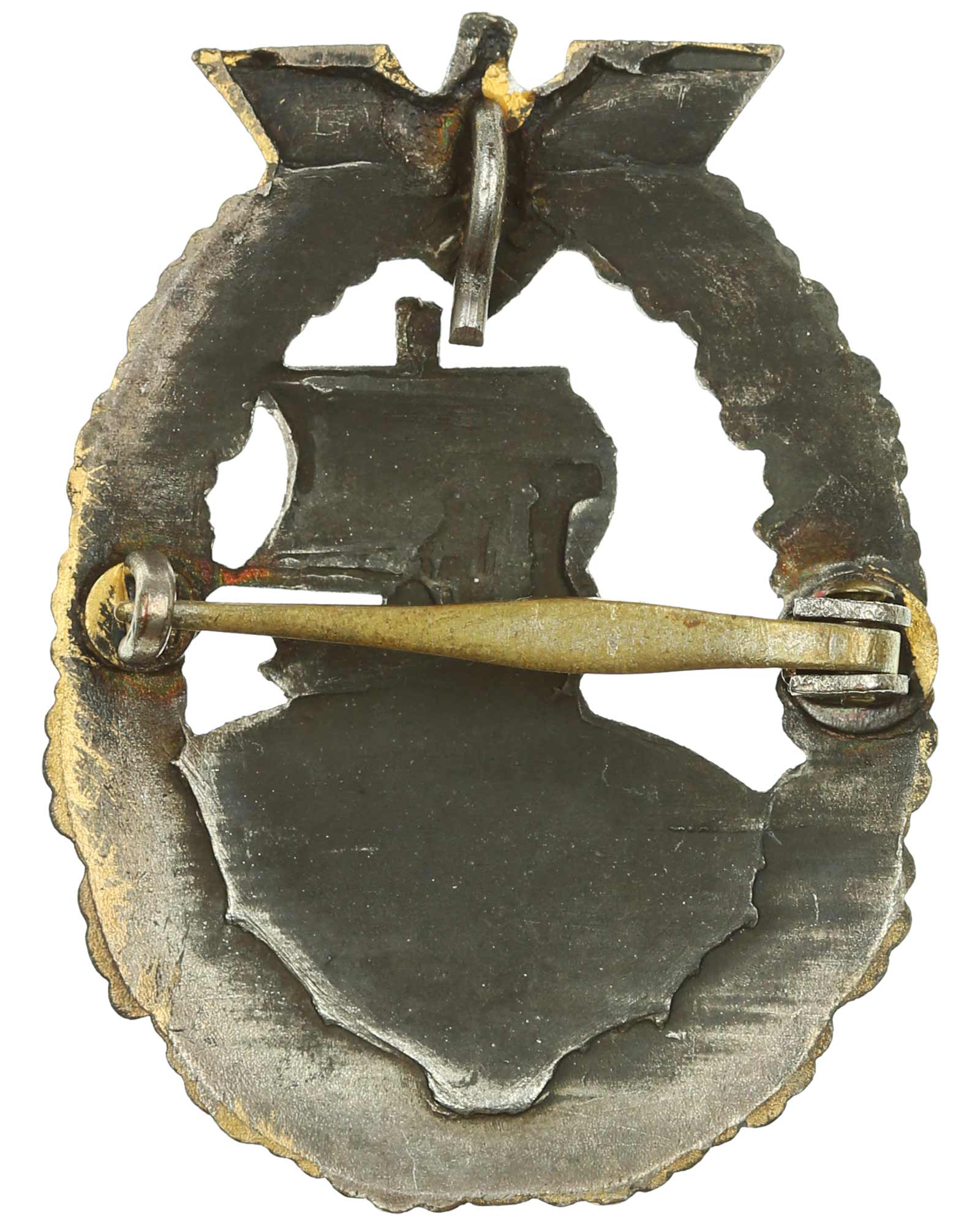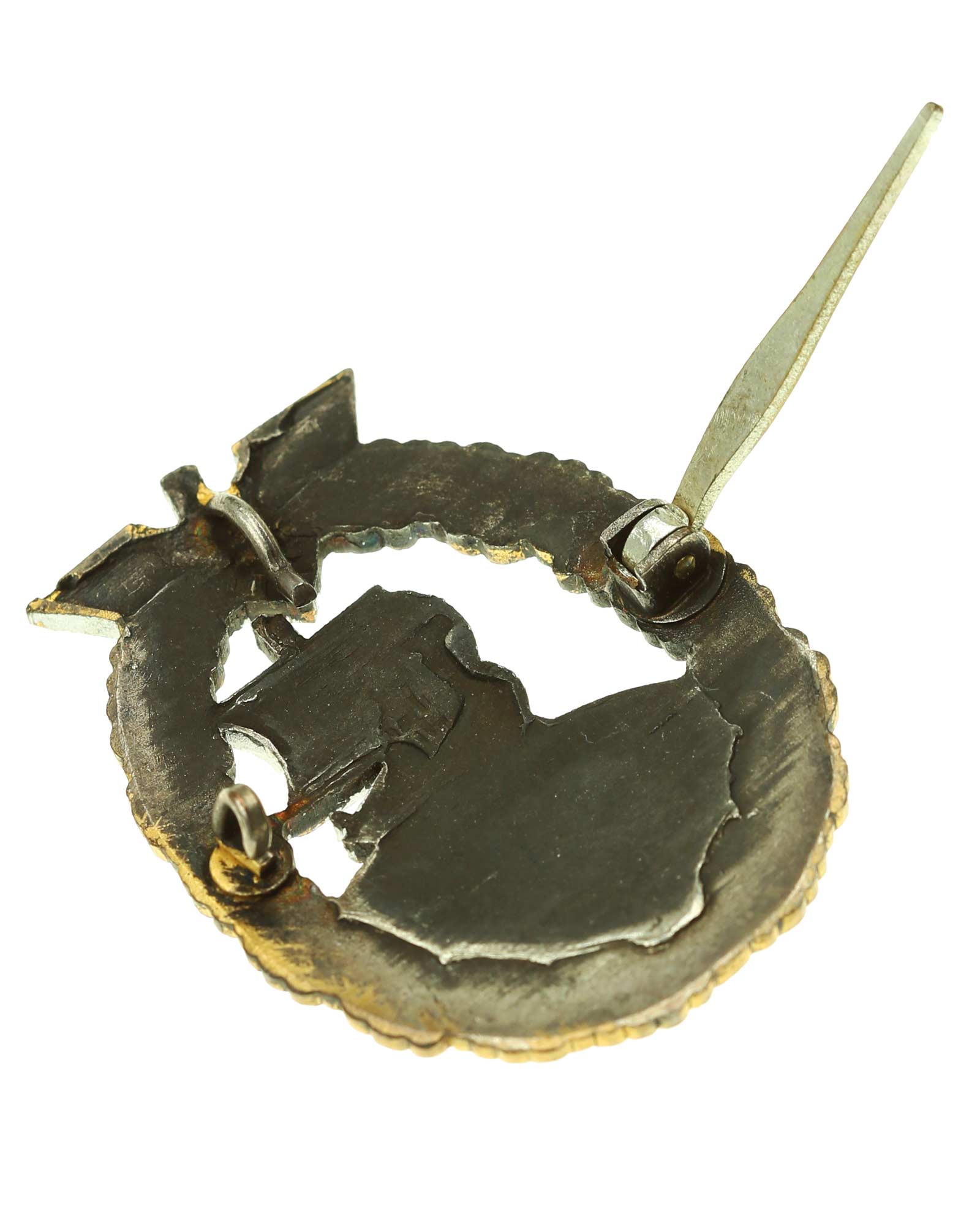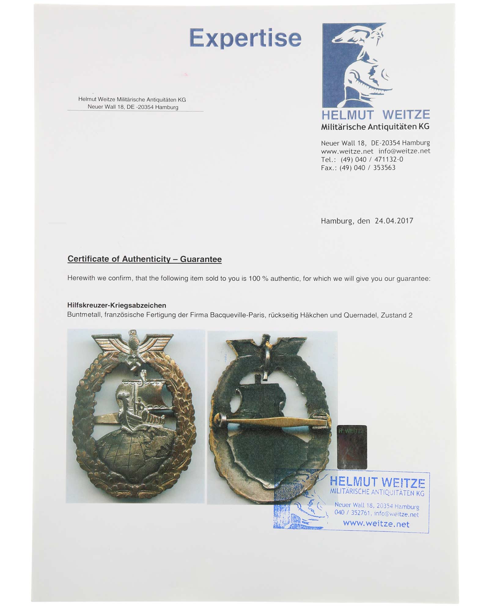 Kriegsabzeichen für Hilfskreuzer 1941, Buntmetall, französische Fertigung der Firma Bacqueville-Paris. Rückseitig Häkchen und Quernadel. Zustand 2. Gesamtgewicht 27 g. Abmessungen: 41,10 x 55,10 mm.