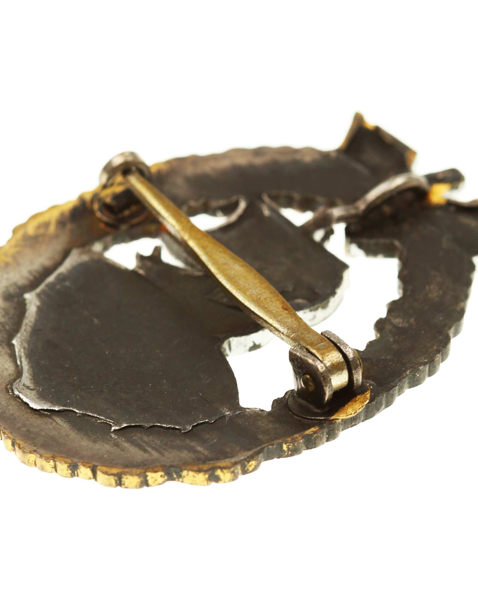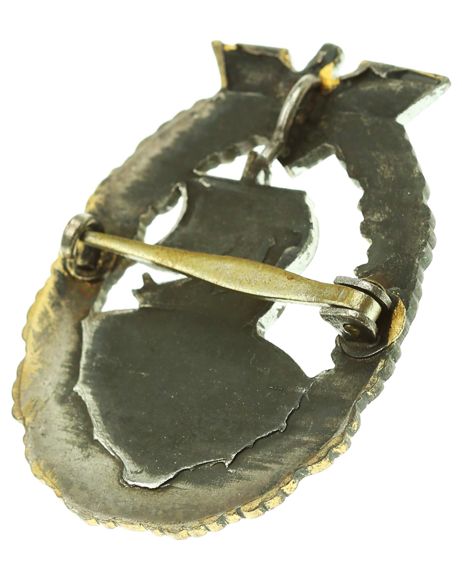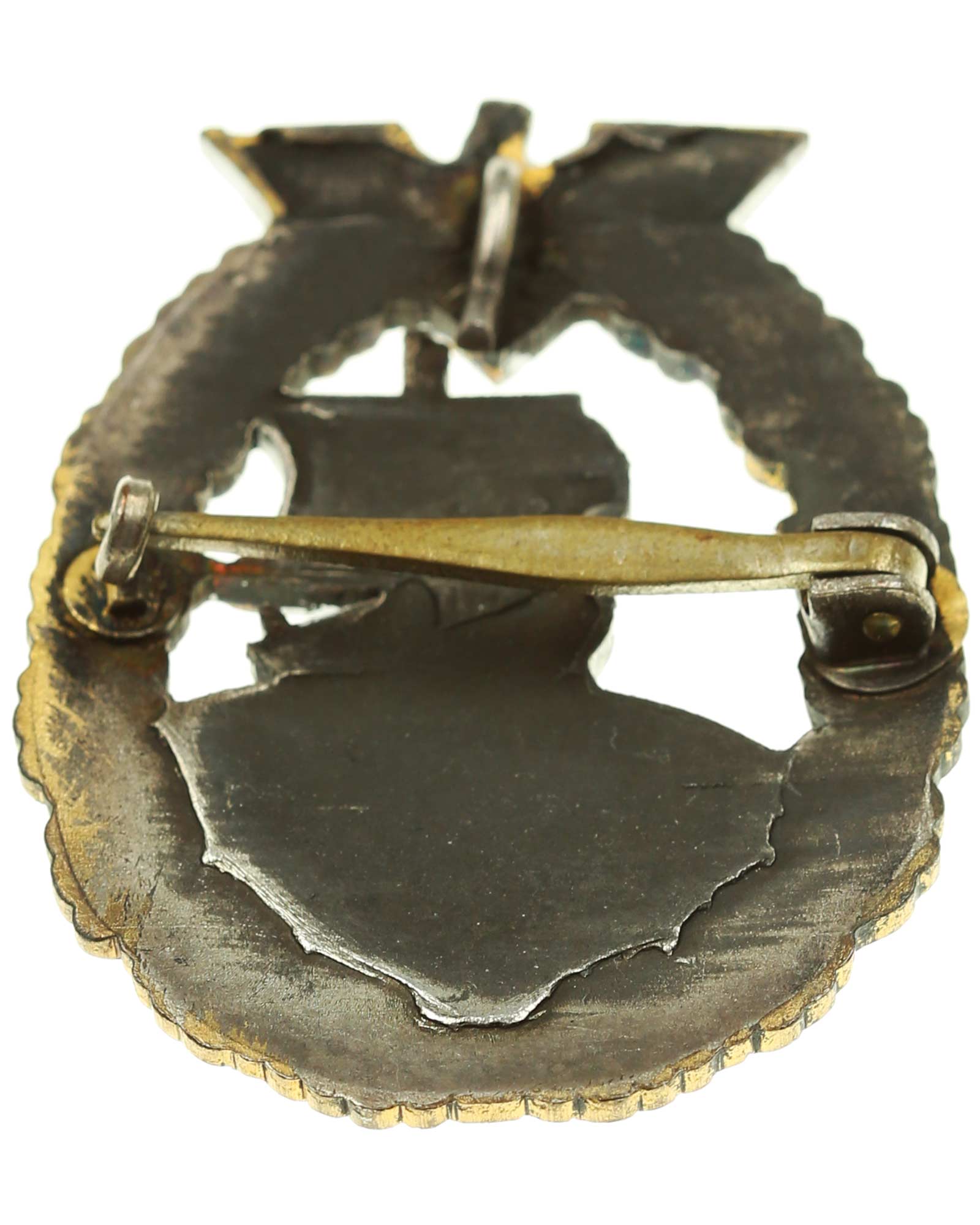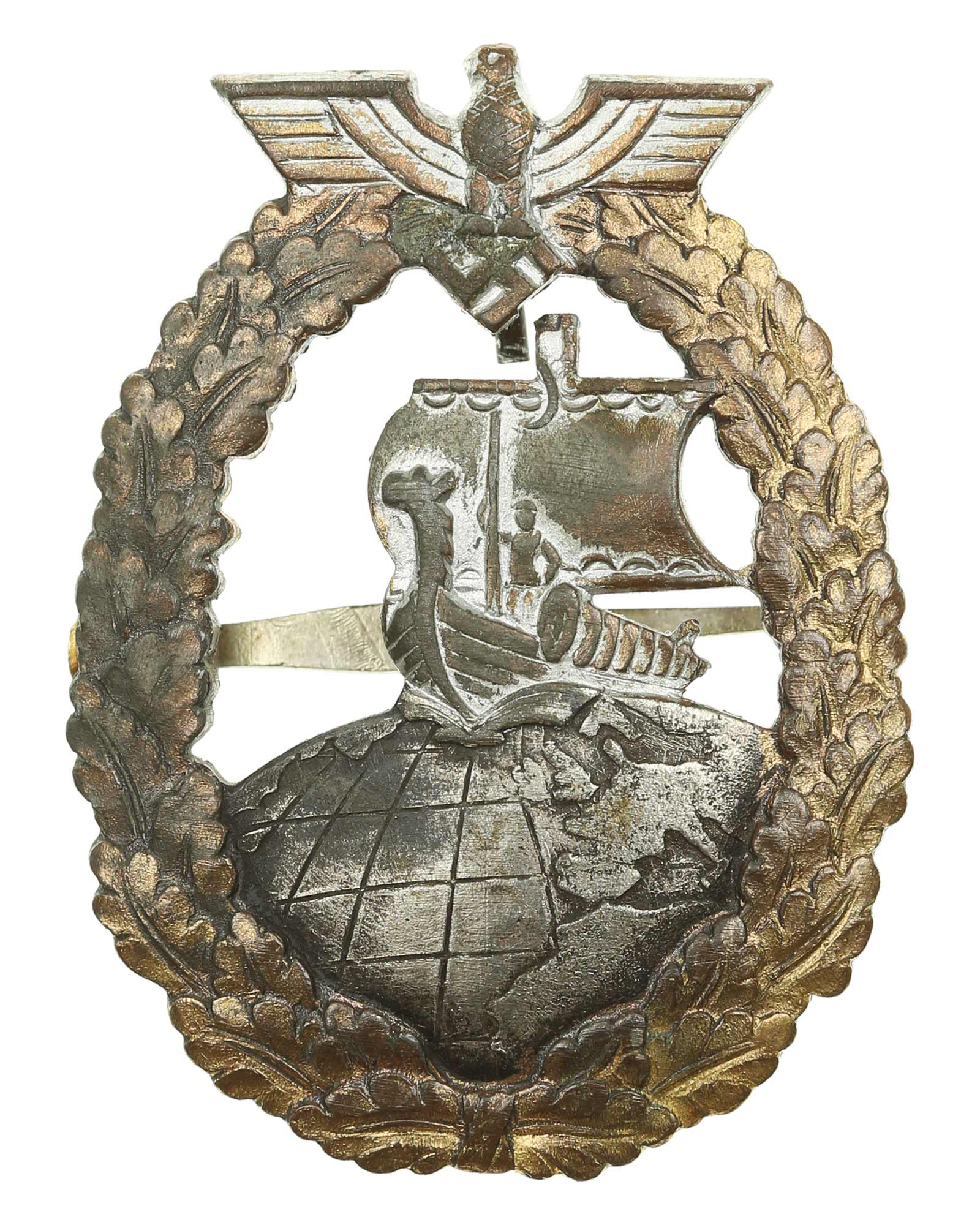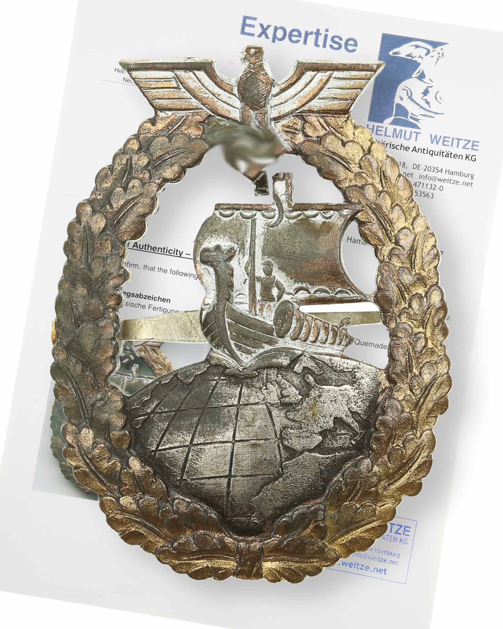 Kriegsabzeichen für Hilfskreuzer 1941, Buntmetall, französische Fertigung der Firma Bacqueville-Paris. Rückseitig Häkchen und Quernadel. Zustand 2. Gesamtgewicht 27 g. Abmessungen: 41,10 x 55,10 mm.