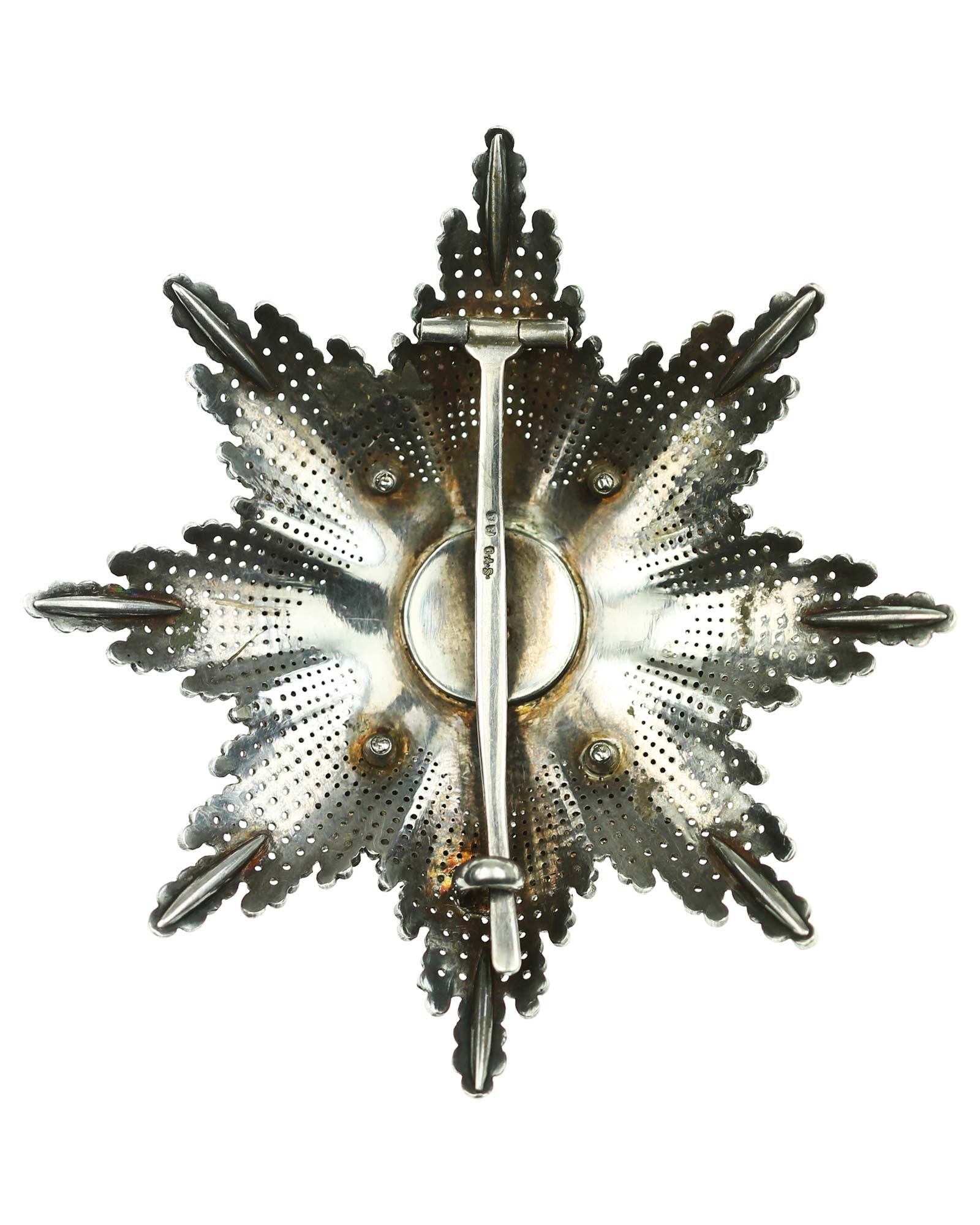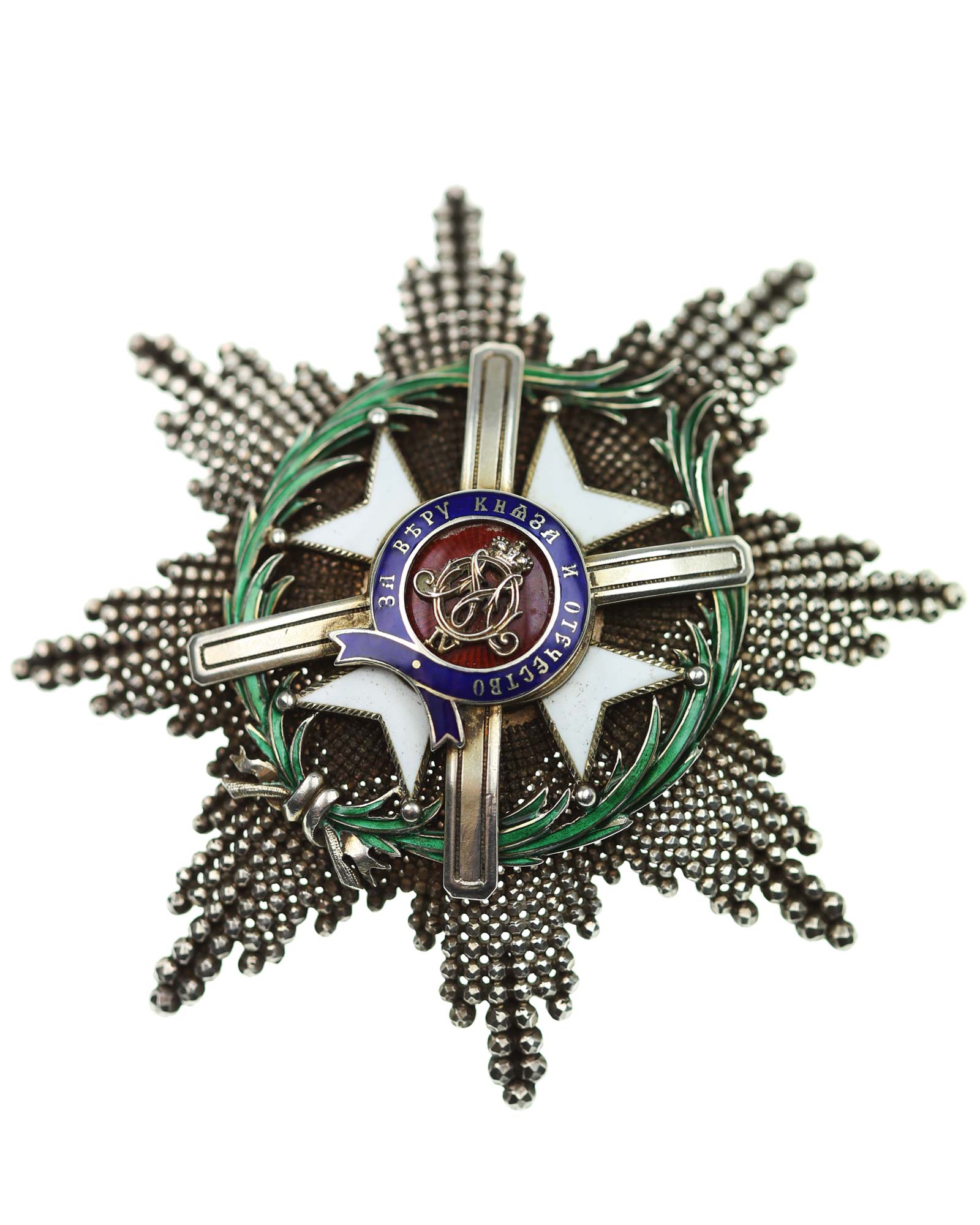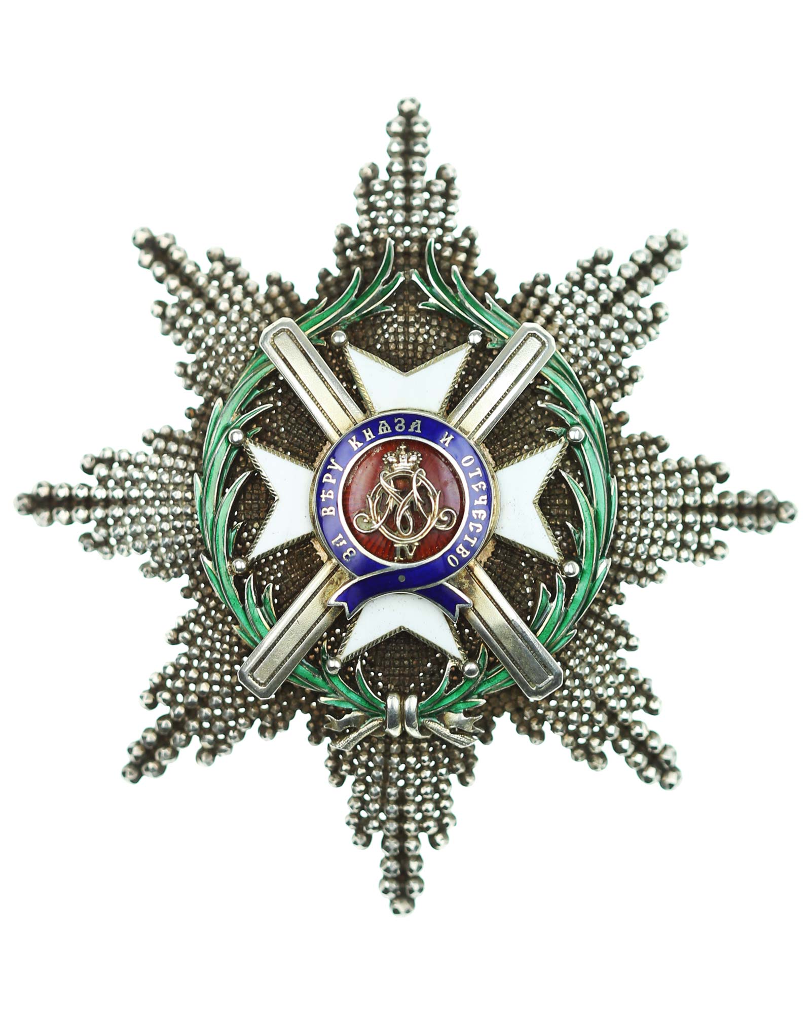 Orden des Kreuzes von Takowo, 2. Modell (1868-1903), Komtur Stern, Serbien. Silber, Korpus brillantiert und reperziert, die mehrteilige Auflage vergoldet und emailliert, vierfach verschraubt mit dem Korpus, sowohl die Medaillonrückplatte und die Nadel mehrfach gepunzt, u.a. G.A.S., die Strahlenspitzen verstärkt.