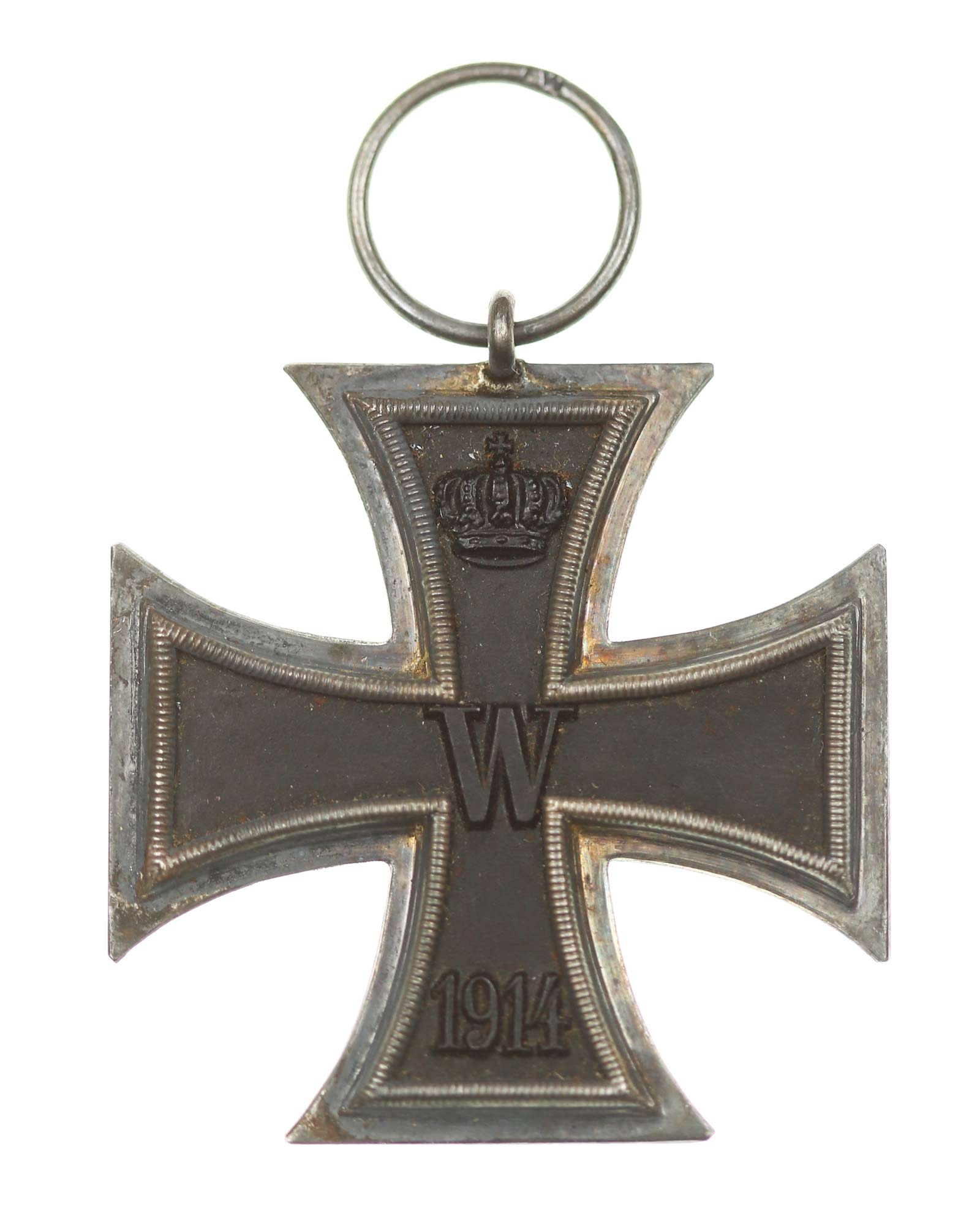 Preußen Eisernes Kreuz 1914 2. Klasse. Vorderseite: W - 1914. Rückseite: FW - 1813. Eisenkern. Ring mit Herstellermarkierung. Gesamtgewicht 19 g. Abmessungen: 43,46 x 43,34 mm.