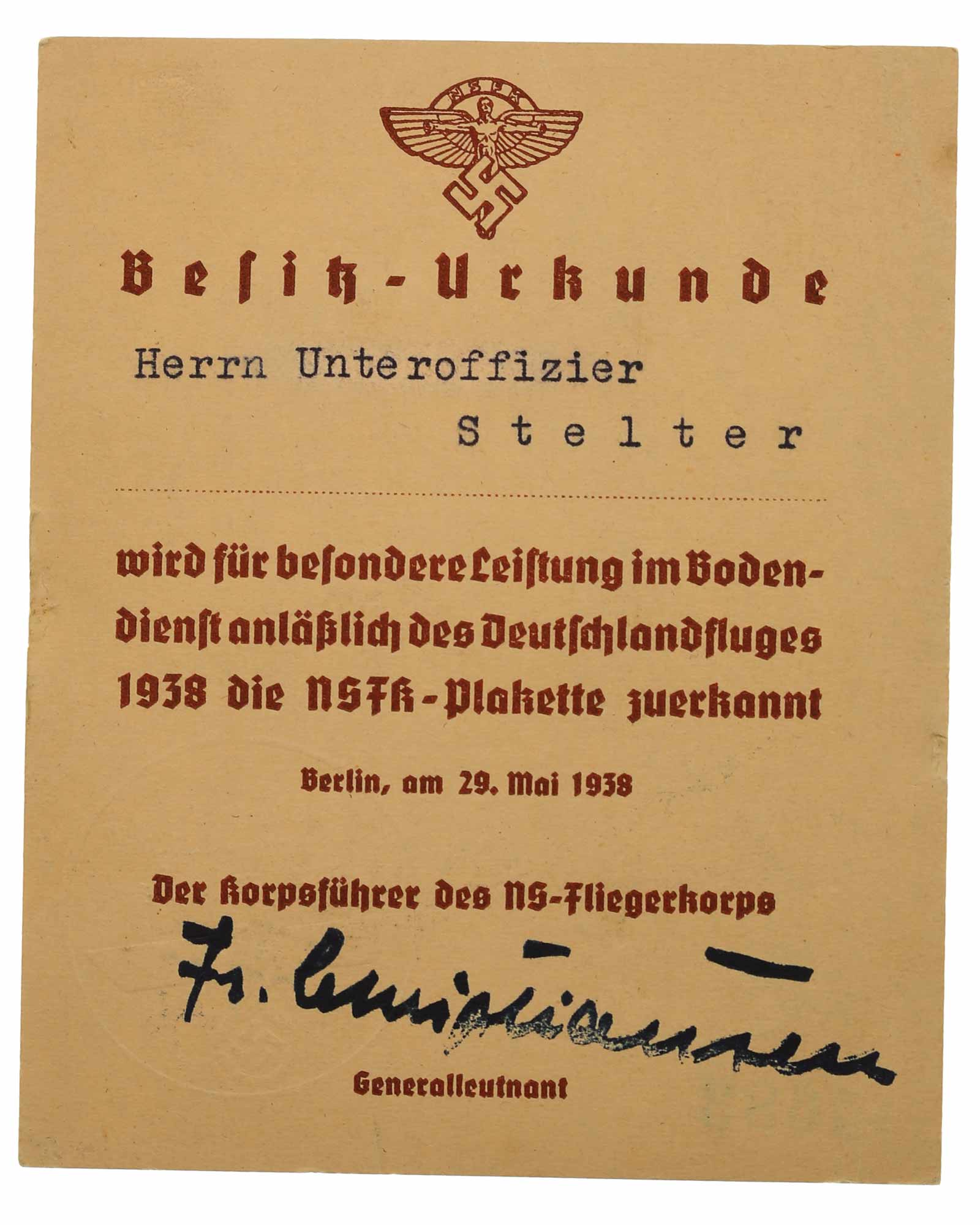 Besitz Urkunde: Herrn Unteroffizier Stelter wird für besondere Leistung im Bodendienst anlässlich des Deutschlandfluges 1938 die NSFK-Plakette zuerkannt. Berlin, am 29. Mai 1938.