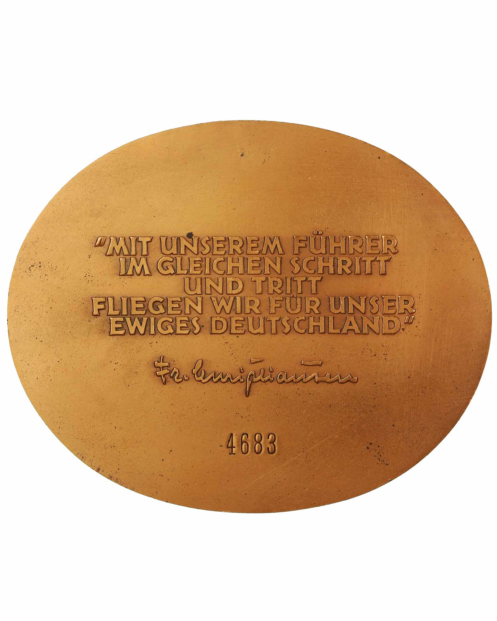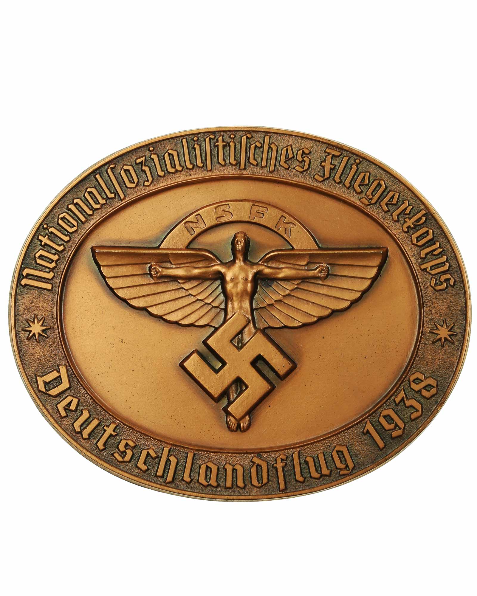 Nationalsozialistisches Fliegerkorps [NSFK] Bronzene Plakette zum Deutschlandflug 1938 im Etui und nummerngleiche Besitz-Urkunde #4683. Plakette ist aus Aluminium und bronziert. Die Plakette ist oval mit dem Schriftzug: Nationalsozialistisches Fliegerkorps Deutschlandflug 1938. Rückseite mit Zitat von Friedrich Christiansen NSFK : MIT UNSEREM FÜHRER IM GLEICHEN SCHRITT UND TRITT FLIEGEN WIR FÜR UNSER EWIGES DEUTSCHLAND. Herausklappbares Deckelfutter in Gold beschriftet: Nationalsozialistisches Fliegerkorps - Der Korpsführer.