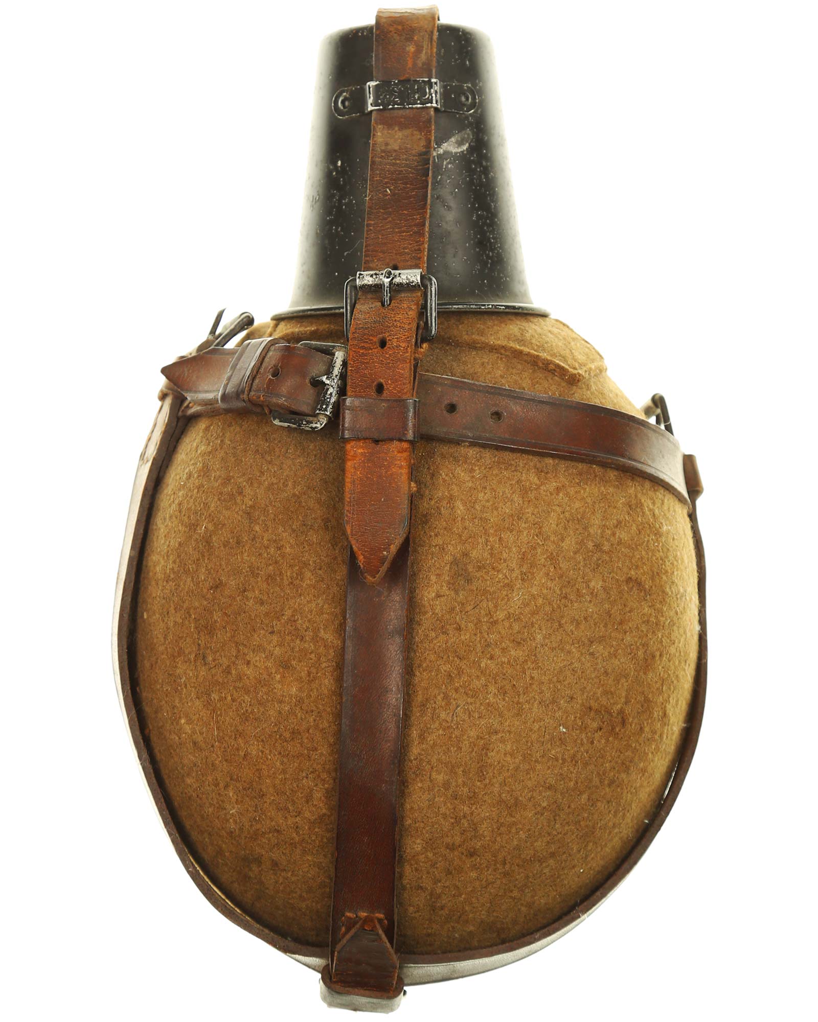 Wehrmacht Labeflasche ist komplett mit Filzbezug und Riemen. Der Becher, Flasche und Flaschenverschluss sind mit identischer Markierung "C.F.L.38" (Carl Feldhaus Aluminium-und Metallwerke, Lüdenscheid).