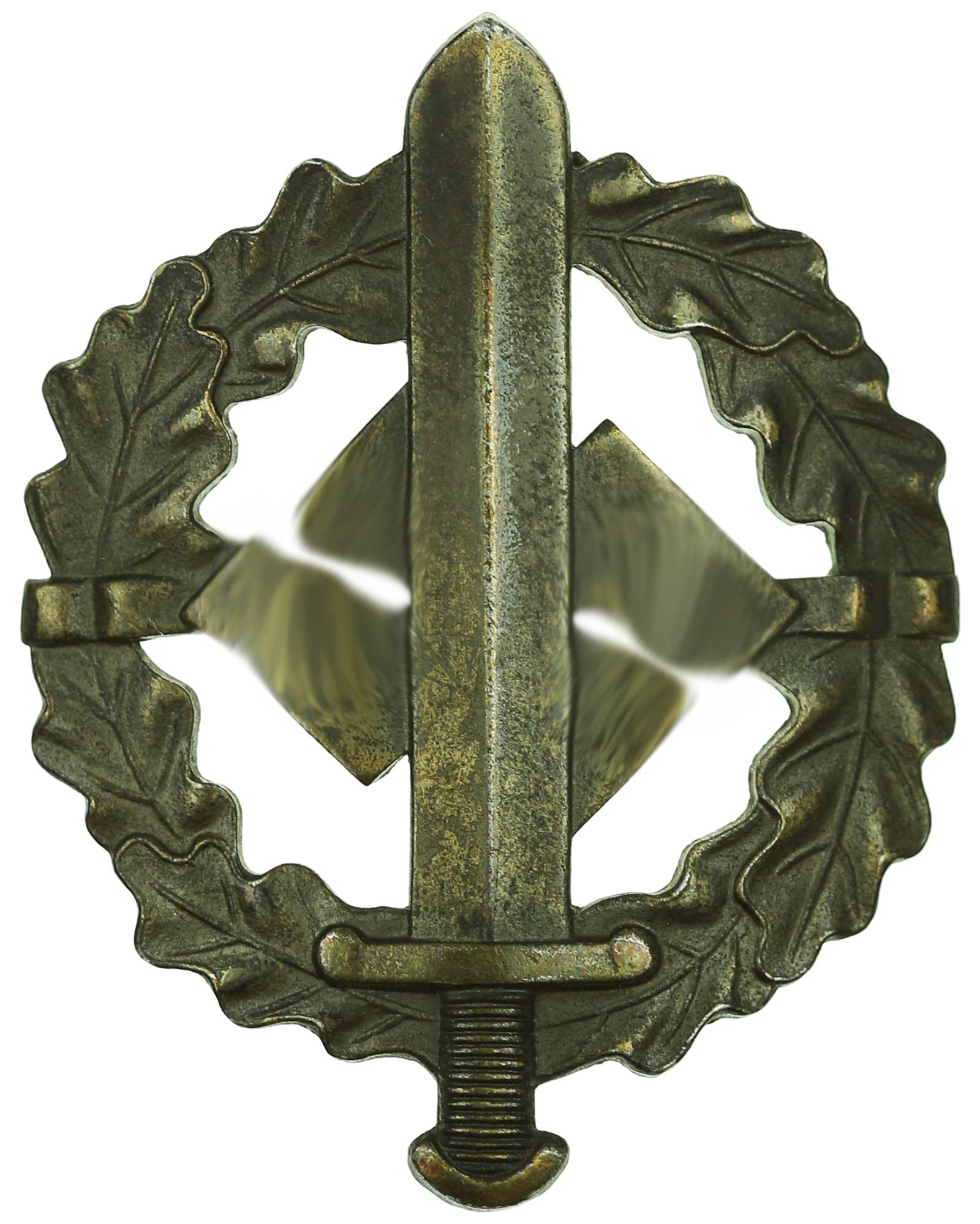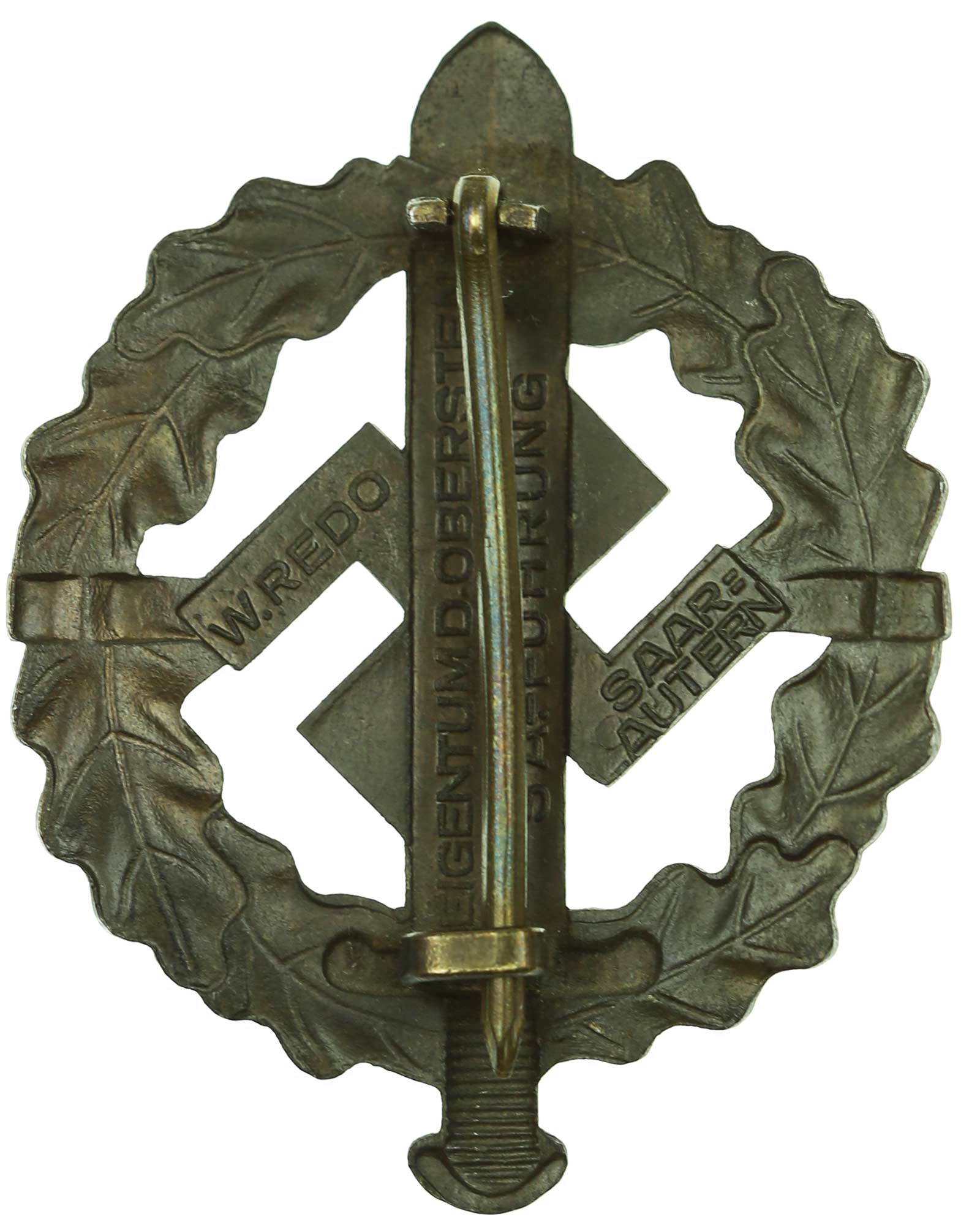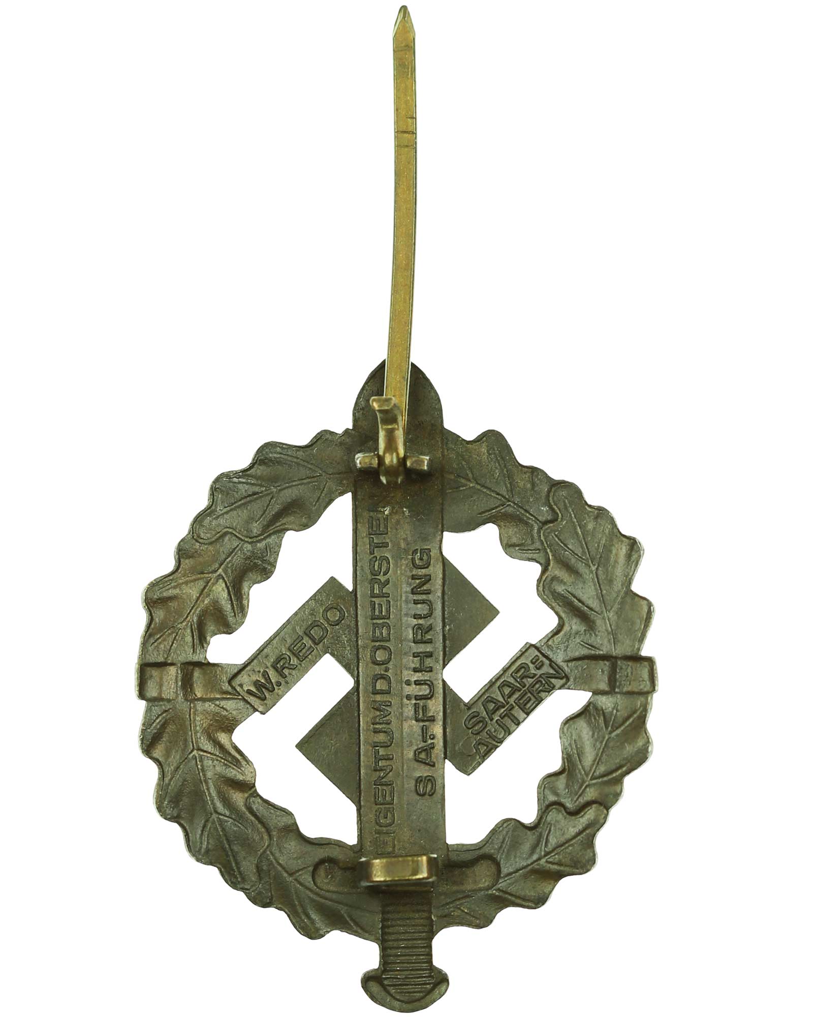 Sturmabteilung [SA] Sportabzeichen aus bronziertem Eisen. Rückseite mit Hersteller: W. Redo Saarlautern. Gesamtgewicht 20 g. Abmessungen: 58,31 x 45,97 mm.