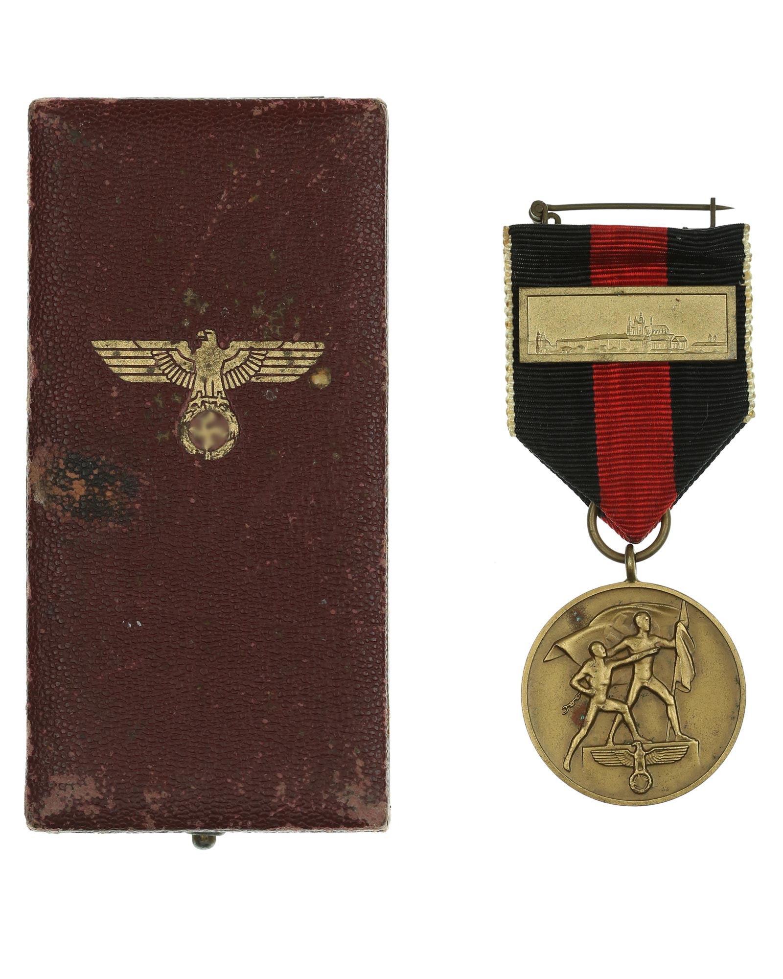 Medaille zur Erinnerung an den 1. Oktober 1938 Anschlussmedaille Sudetenland am Band und im Etui, Buntmetall bronziert. Rückseite mit Inschrift: EIN VOLK EIN REICH EIN FÜHRER und 1. Oktober 1938.
