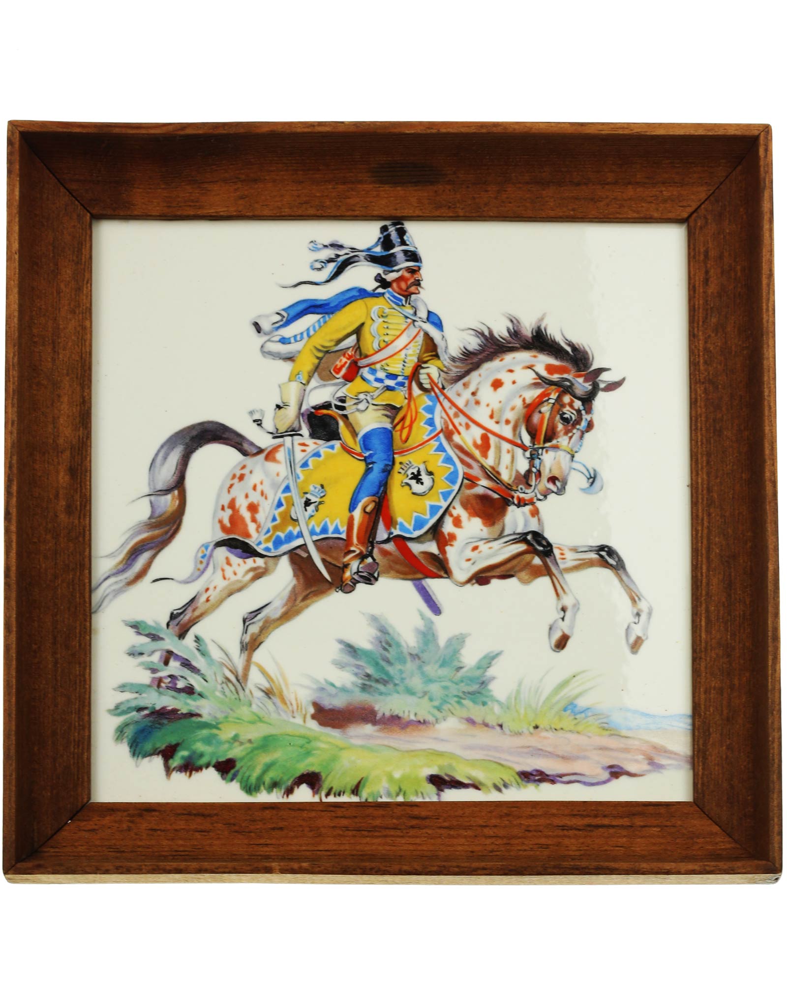 Weiße Porzellanfliese mit farbiger Abbildung des Malachowski-Husars, nach der gestaltenen Allach Porzellanfigur Modell 121 von Prof. T. Kärner. Auf der Rückseite befindet sich die Lieferantenmarkierung (Meissen) des Keramikrohlings. Fliesenmaße ca. 150 x 150 mm, Holzrahmen 180 x 180 mm. Sehr gut erhaltener Zustand im originalen Holzrahmen.