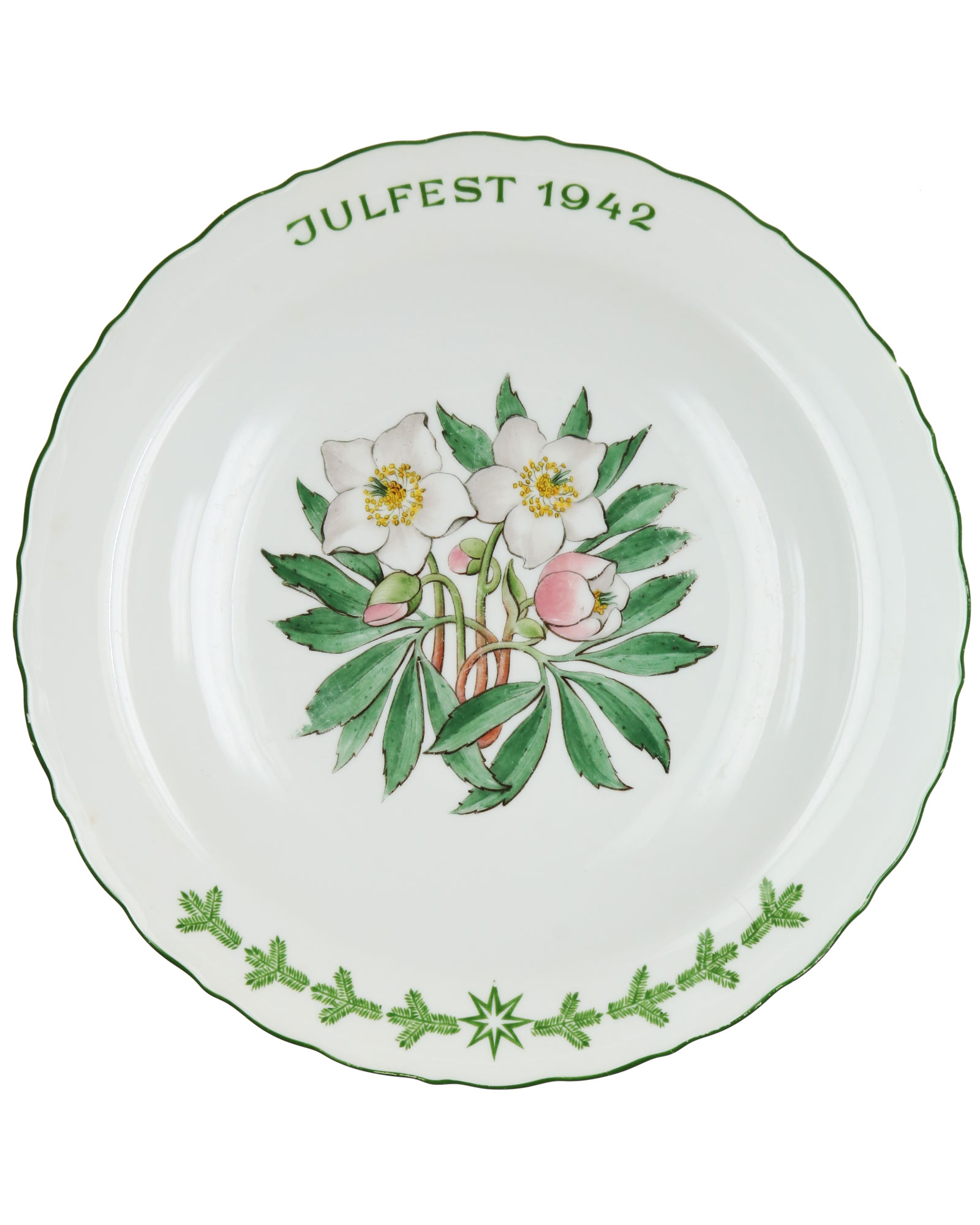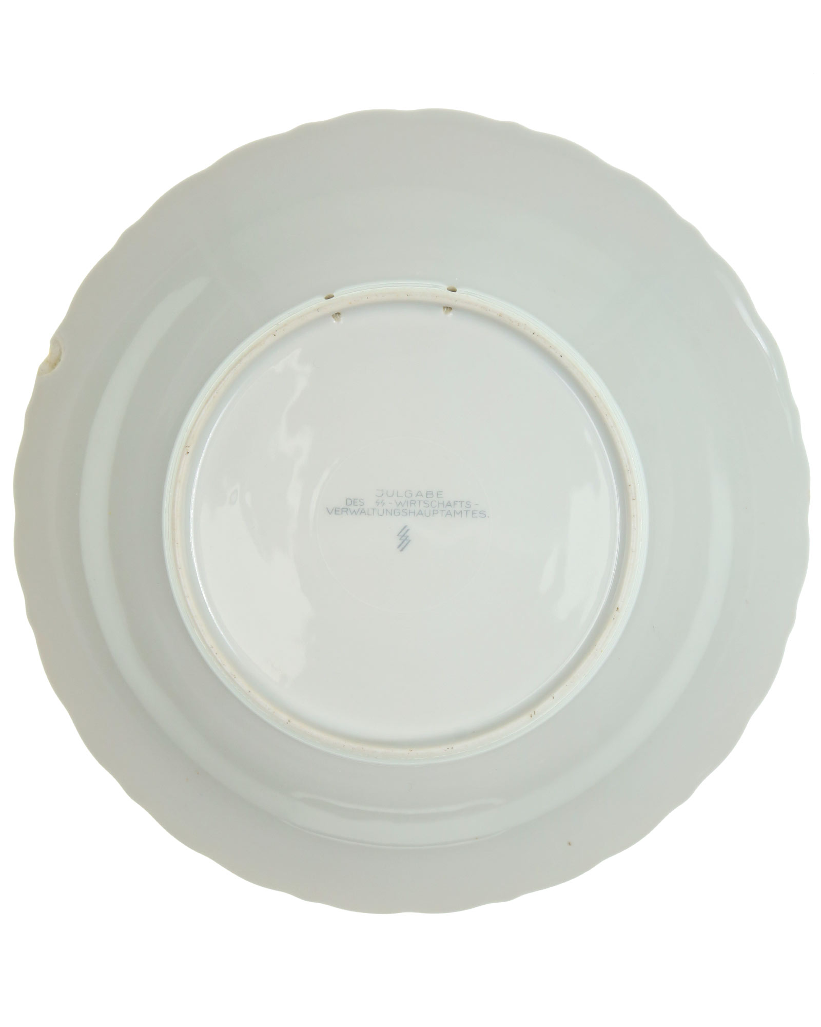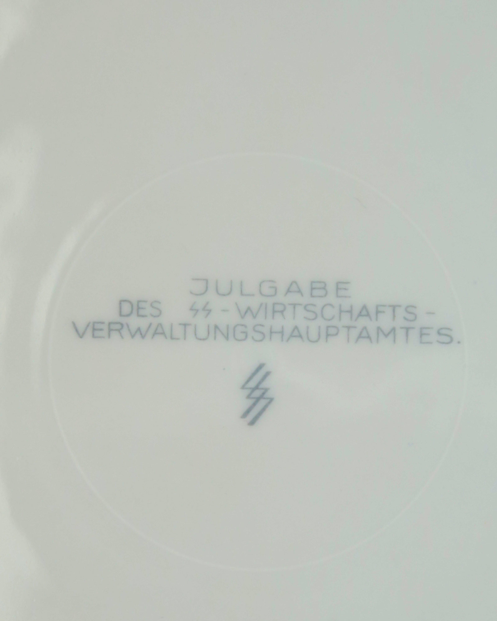 Weißes, glasierter Porzellanteller mit farbigen Blumendekor. Am Rand: Inschrift "Julfest 1942" mit Tannenzweigen und Stern. Auf der Rückseite im Boden befindet sich die graue, unterglasierte Inschrift "Julgabe des SS-Wirtschafts-Verwaltungshauptamtes", sowie SS Allach Manufakturmarke. Durchmesser 27 cm.