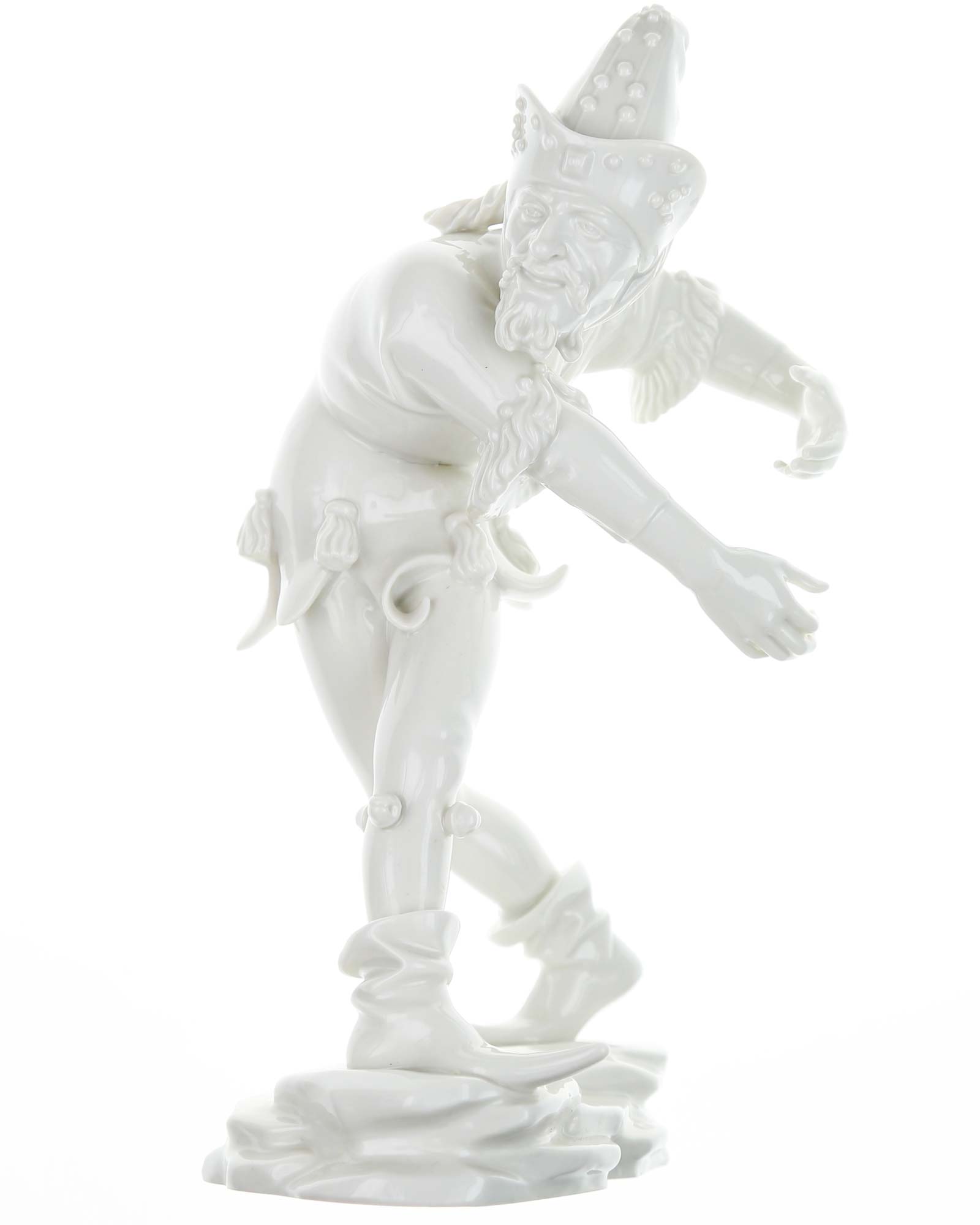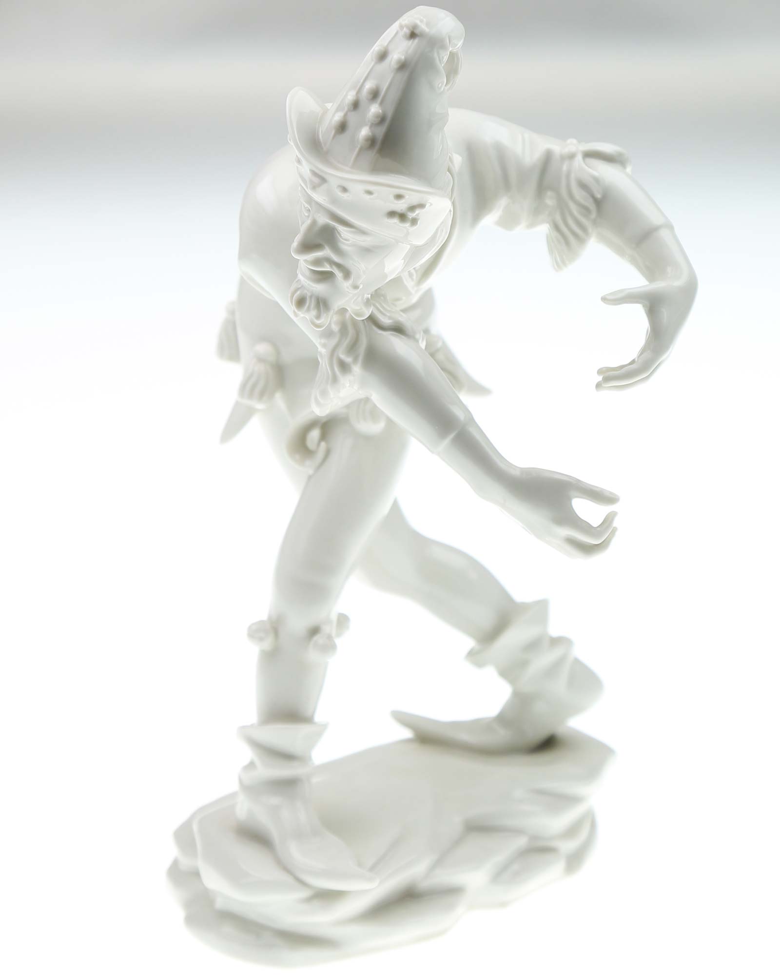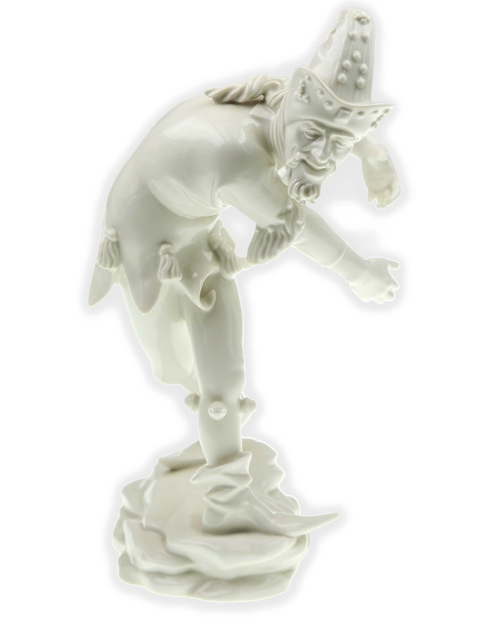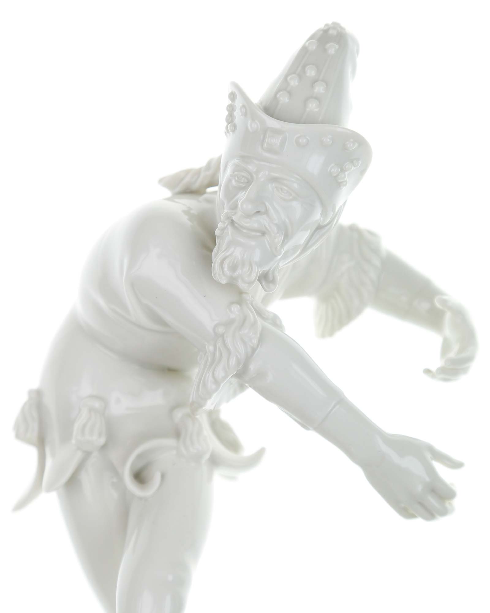 Weiß glasierte Allach Porzellanfigur aus der Serie der Moriskentänzer. Moriskentänzer III Gezaddelte (Modell 1941). Im Boden gepresste Manufakturmarke "SS Allach", Entwurf von Richard Förster. Sonderanfertigung ohne Modellnummer für die Stadt München nach den berühmten, im Münchner Stadtmuseum ausgestellten, spätgotischen Holzfiguren von Erasmus Grasser. Die Figur III "Der Zaddelrock" bzw. "Figur mit Hochmütze" erschien 1941. Abmessungen 12,0 x 22,2 mm. Gesamtgewicht 551 g. Zustand 1.