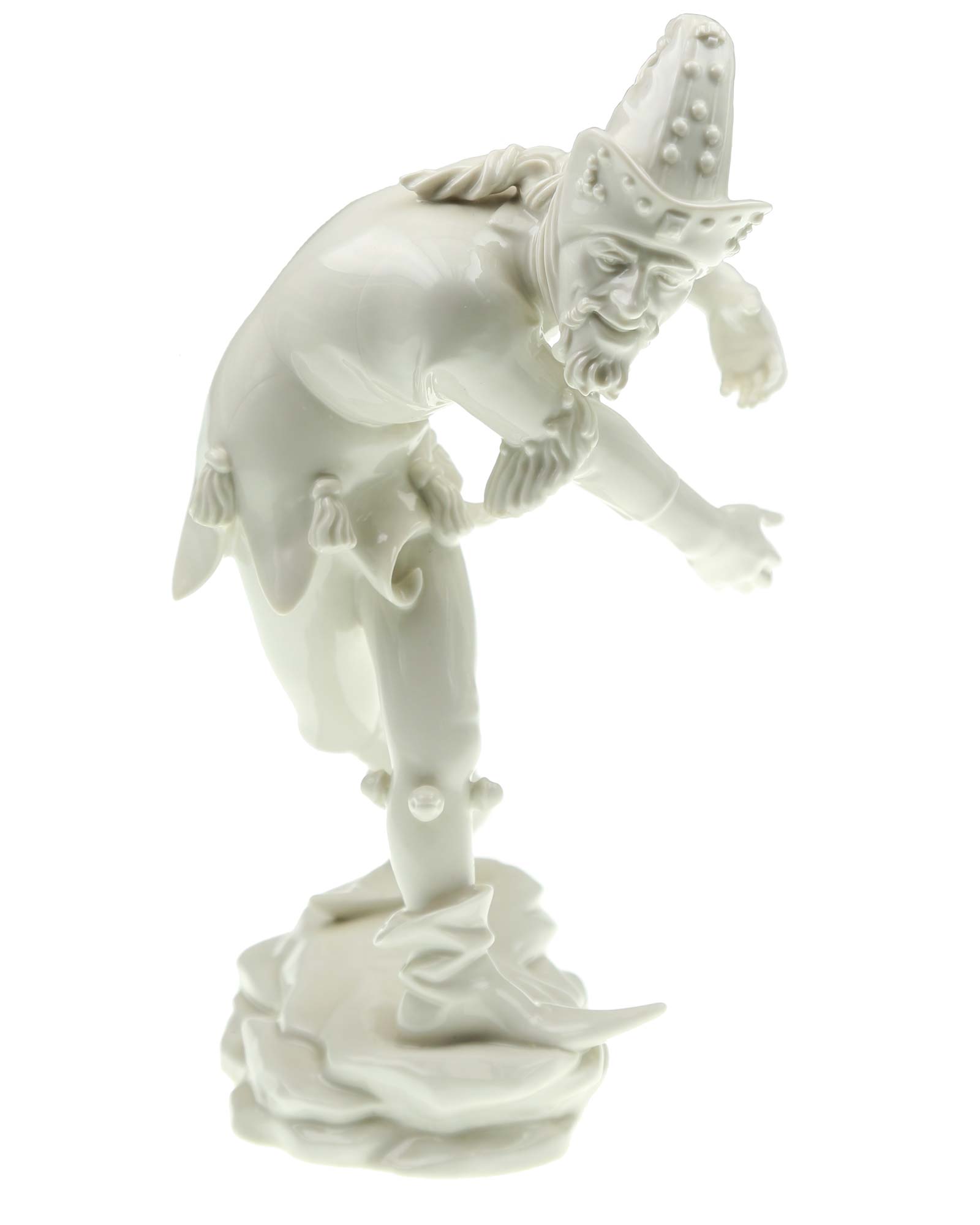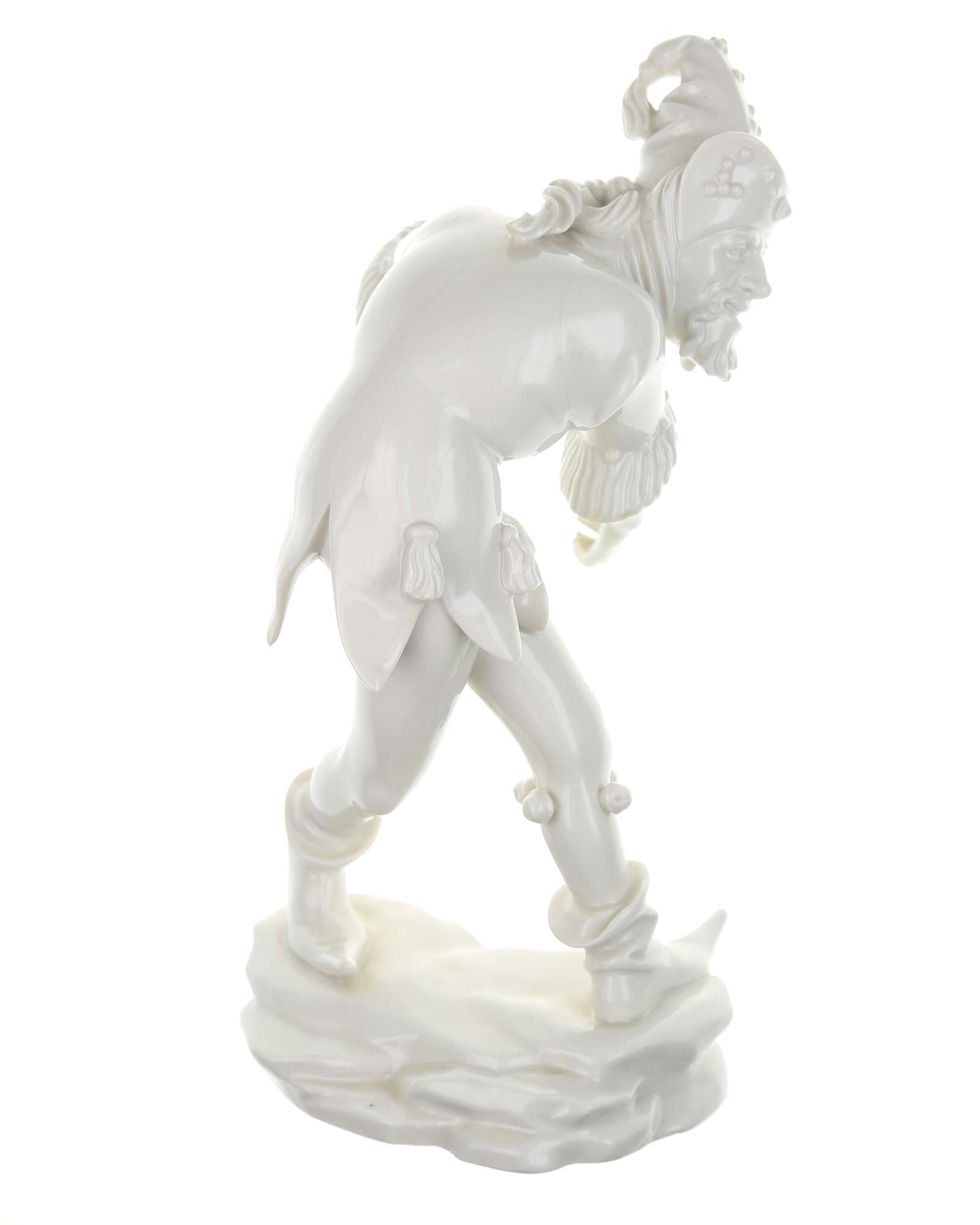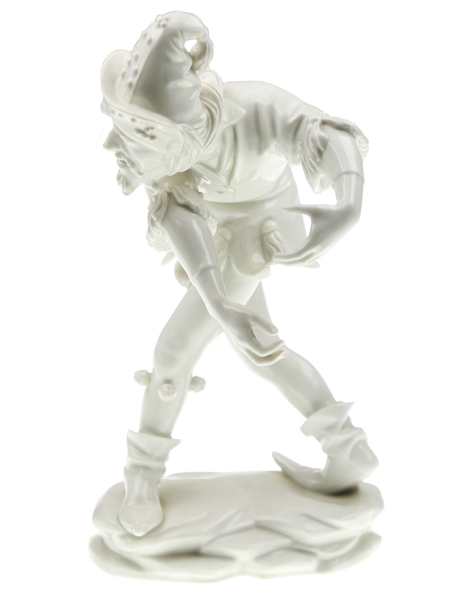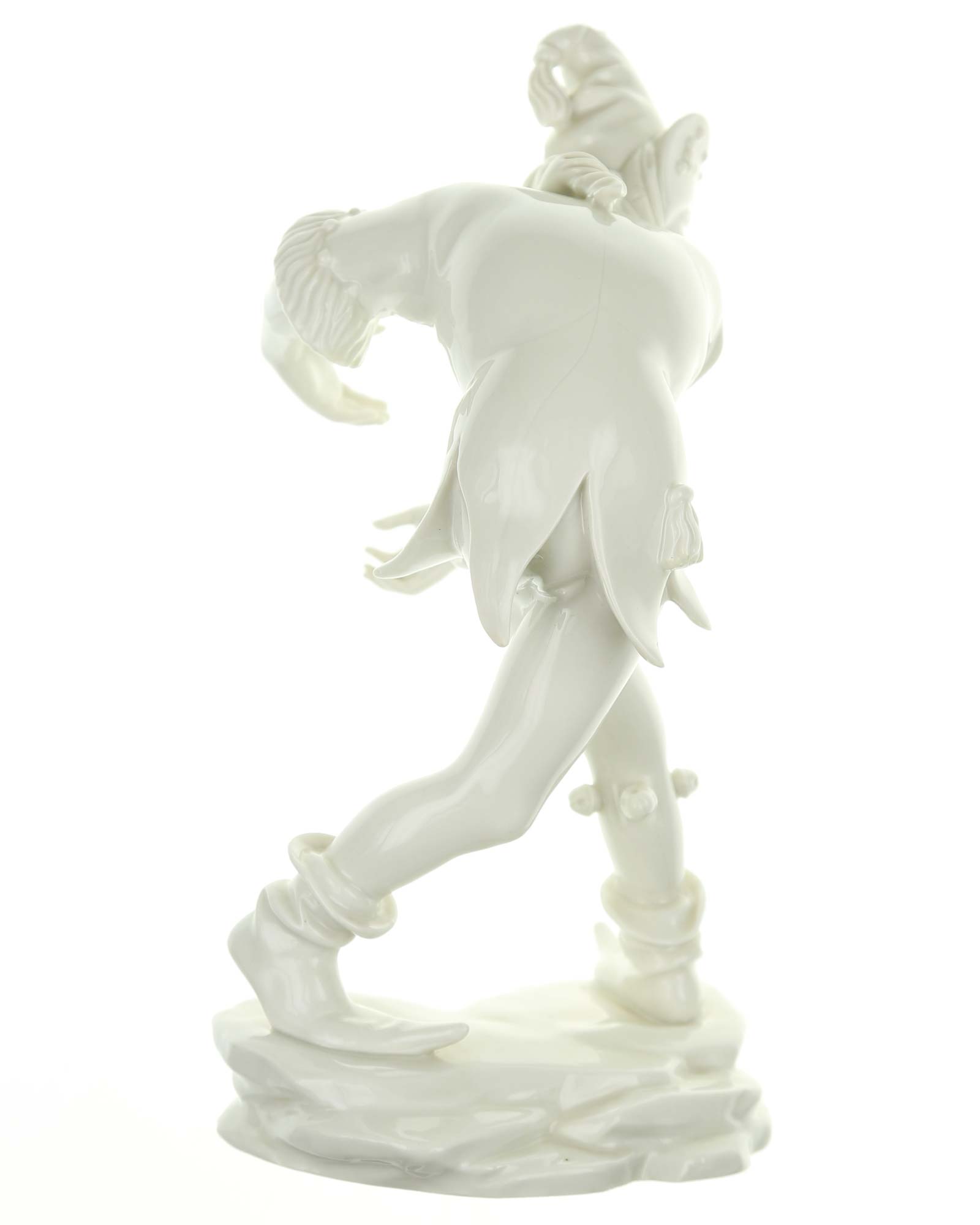 Weiß glasierte Allach Porzellanfigur aus der Serie der Moriskentänzer. Moriskentänzer III Gezaddelte (Modell 1941). Im Boden gepresste Manufakturmarke "SS Allach", Entwurf von Richard Förster. Sonderanfertigung ohne Modellnummer für die Stadt München nach den berühmten, im Münchner Stadtmuseum ausgestellten, spätgotischen Holzfiguren von Erasmus Grasser. Die Figur III "Der Zaddelrock" bzw. "Figur mit Hochmütze" erschien 1941. Abmessungen 12,0 x 22,2 mm. Gesamtgewicht 551 g. Zustand 1.