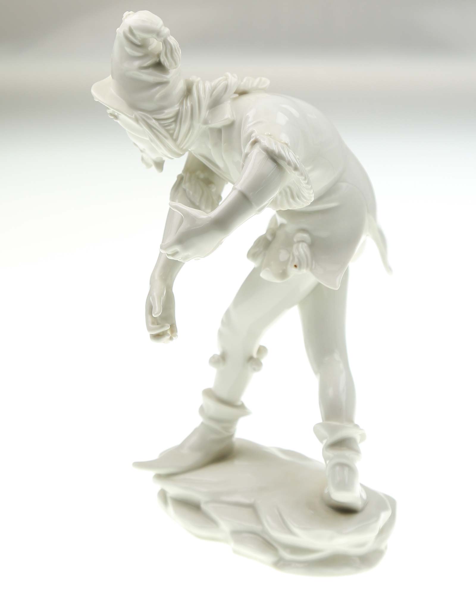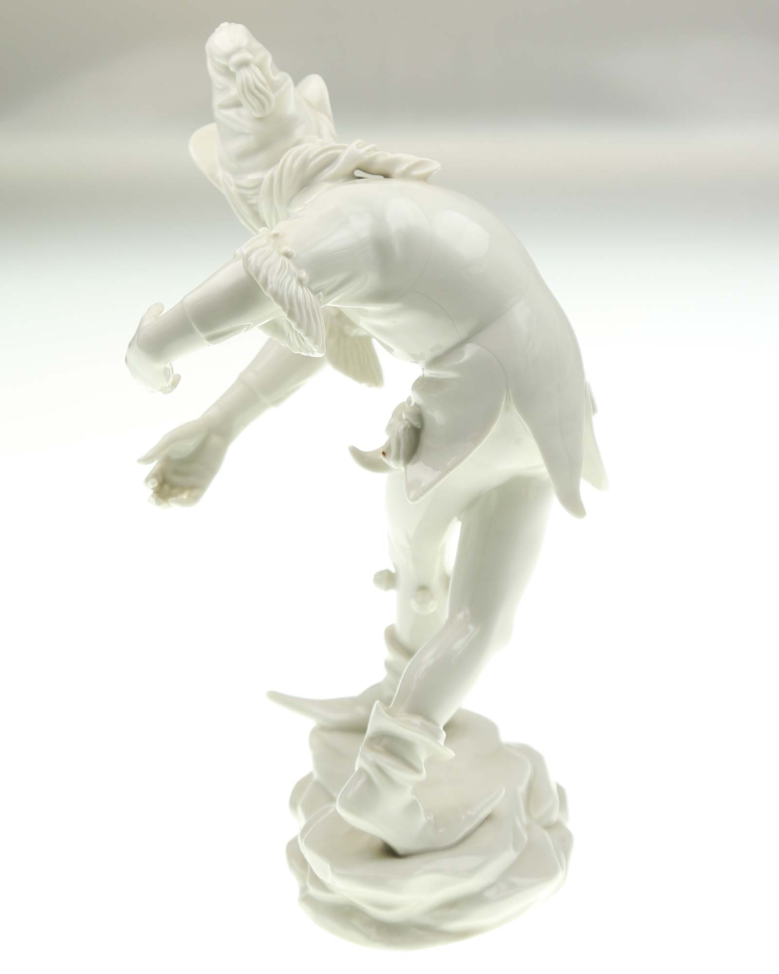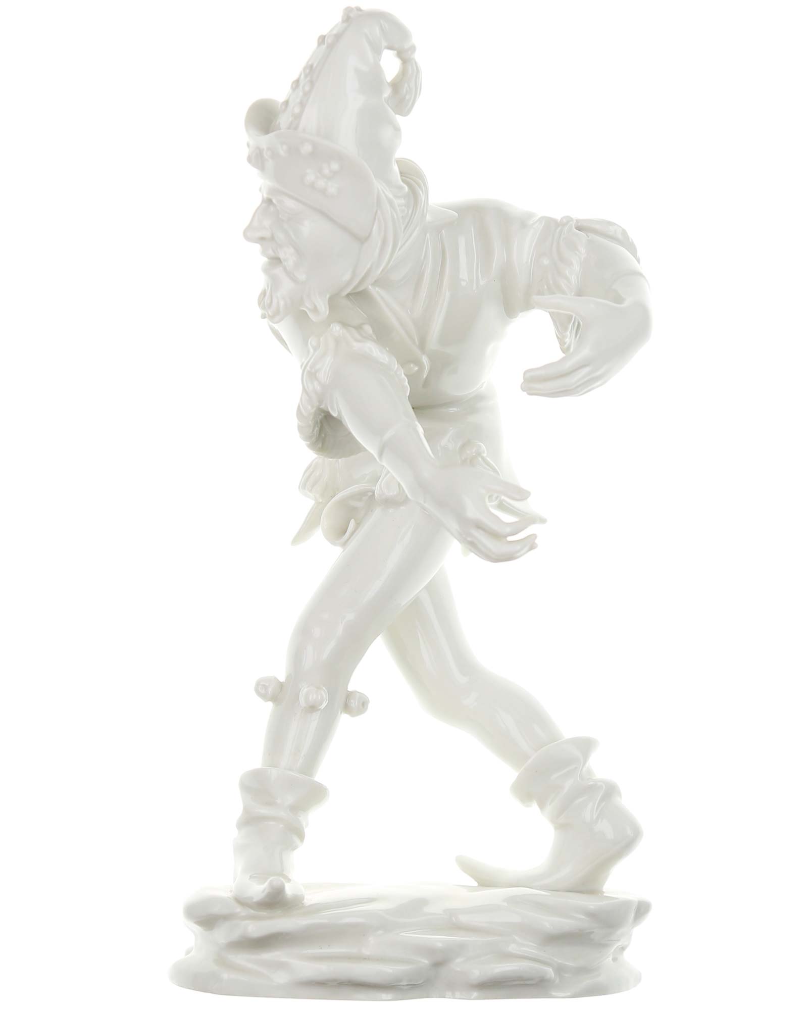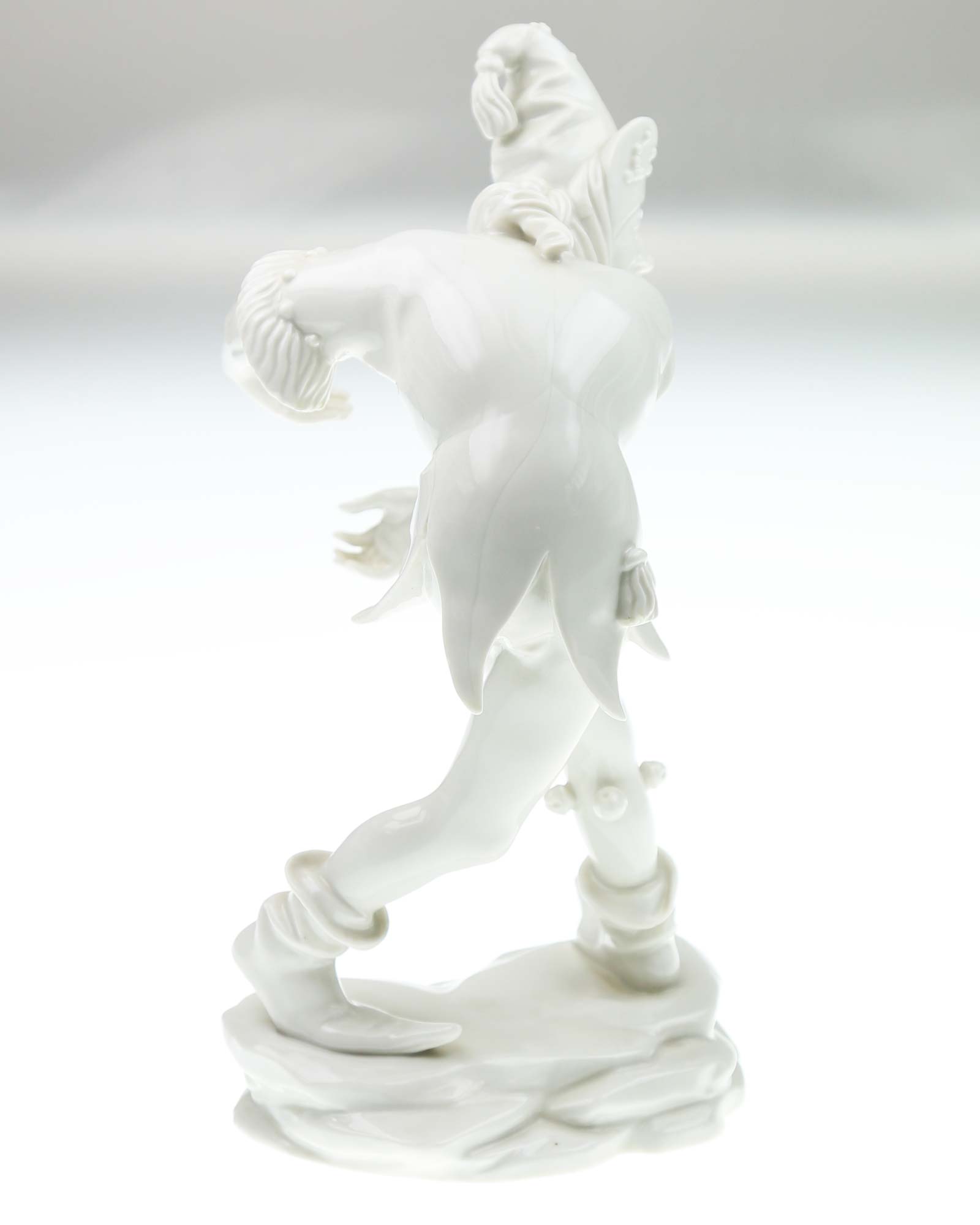 Weiß glasierte Allach Porzellanfigur aus der Serie der Moriskentänzer. Moriskentänzer III Gezaddelte (Modell 1941). Im Boden gepresste Manufakturmarke "SS Allach", Entwurf von Richard Förster. Sonderanfertigung ohne Modellnummer für die Stadt München nach den berühmten, im Münchner Stadtmuseum ausgestellten, spätgotischen Holzfiguren von Erasmus Grasser. Die Figur III "Der Zaddelrock" bzw. "Figur mit Hochmütze" erschien 1941. Abmessungen 12,0 x 22,2 mm. Gesamtgewicht 551 g. Zustand 1.