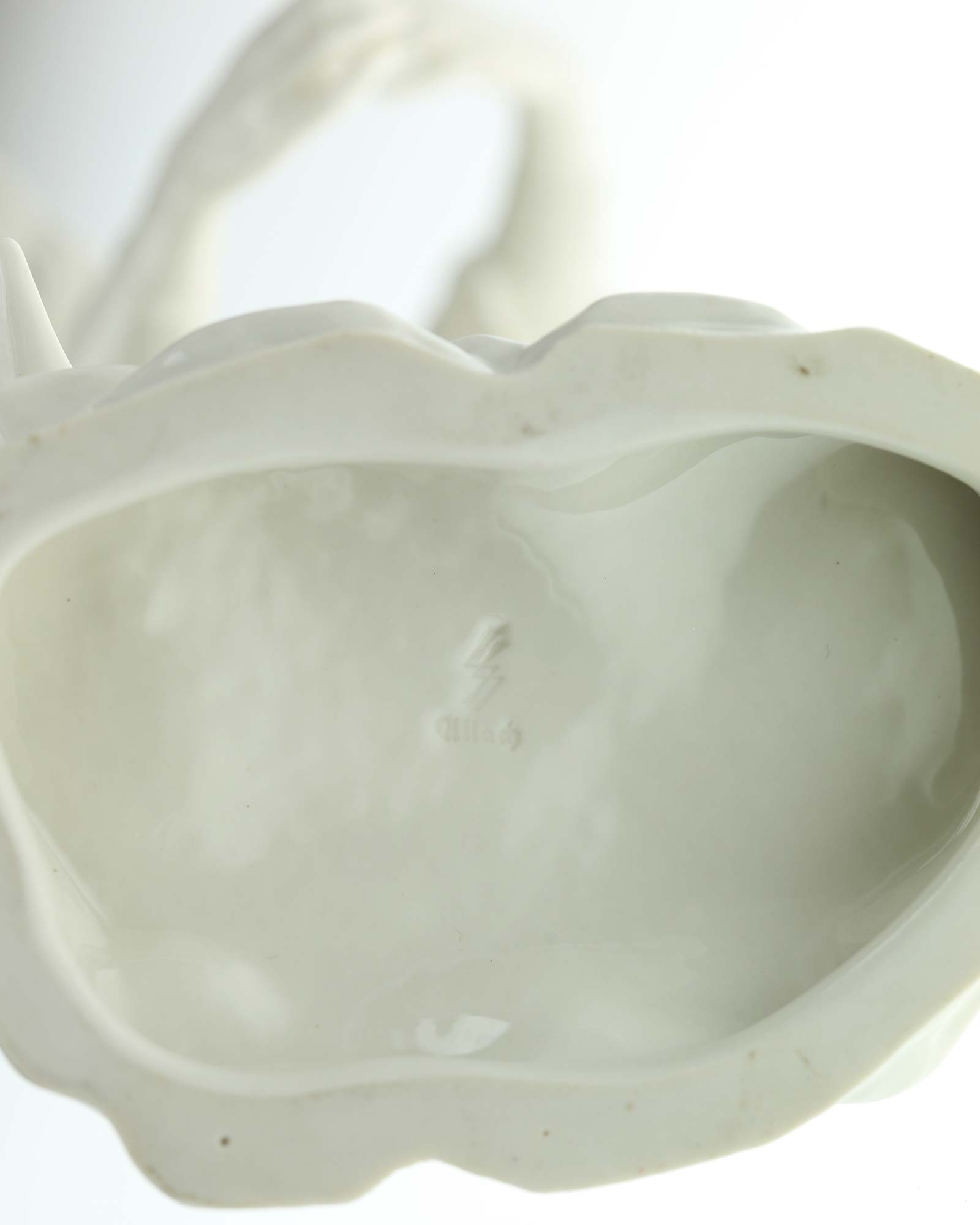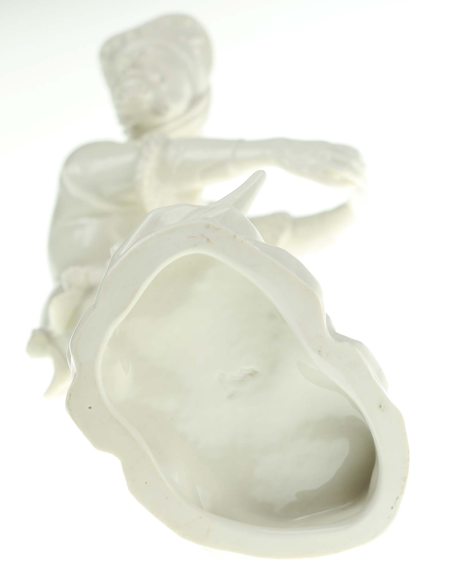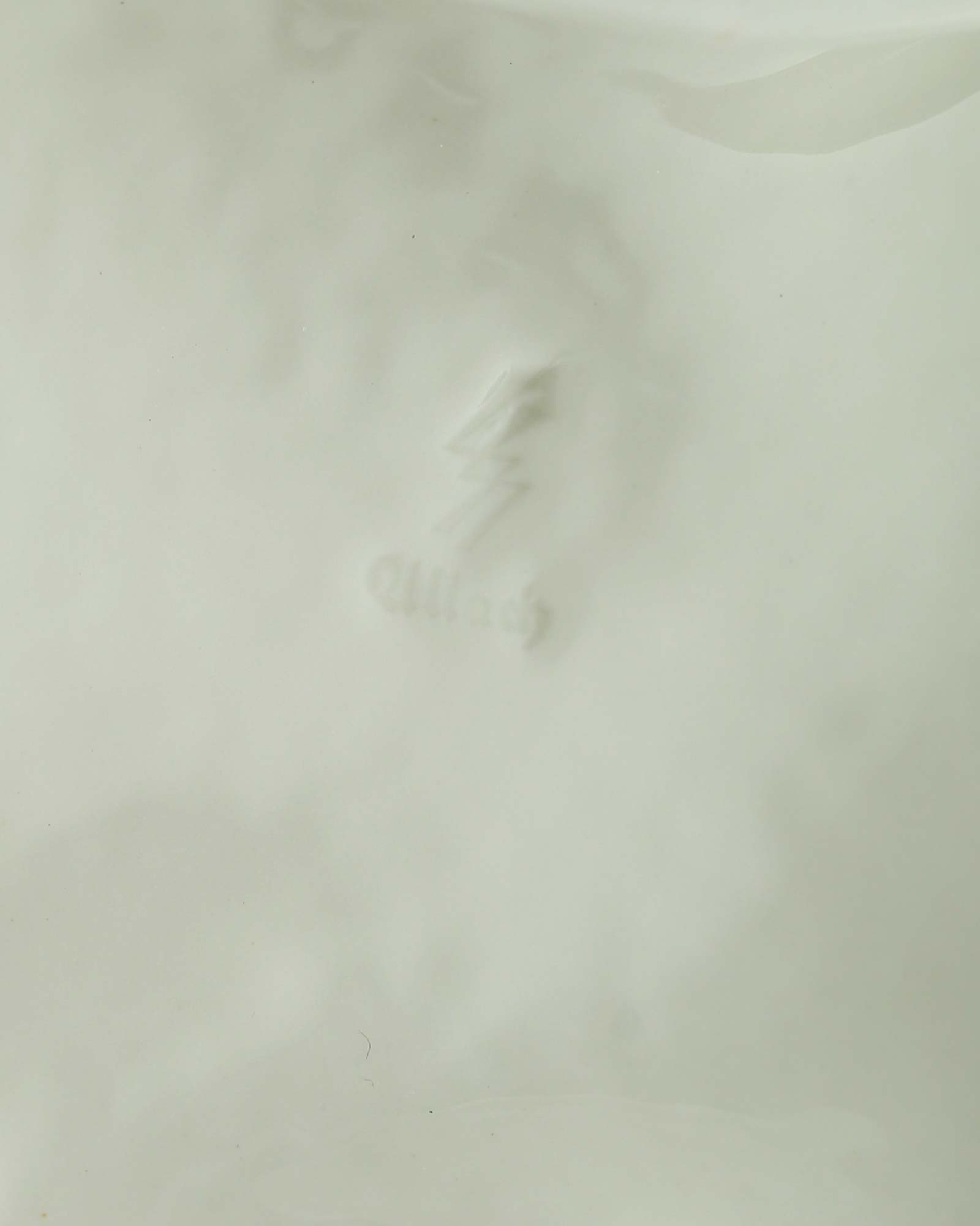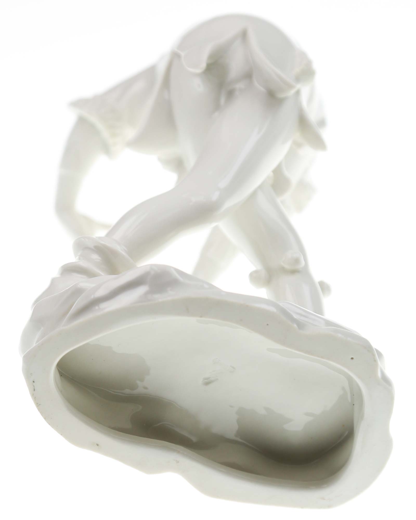 Weiß glasierte Allach Porzellanfigur aus der Serie der Moriskentänzer. Moriskentänzer III Gezaddelte (Modell 1941). Im Boden gepresste Manufakturmarke "SS Allach", Entwurf von Richard Förster. Sonderanfertigung ohne Modellnummer für die Stadt München nach den berühmten, im Münchner Stadtmuseum ausgestellten, spätgotischen Holzfiguren von Erasmus Grasser. Die Figur III "Der Zaddelrock" bzw. "Figur mit Hochmütze" erschien 1941. Abmessungen 12,0 x 22,2 mm. Gesamtgewicht 551 g. Zustand 1.