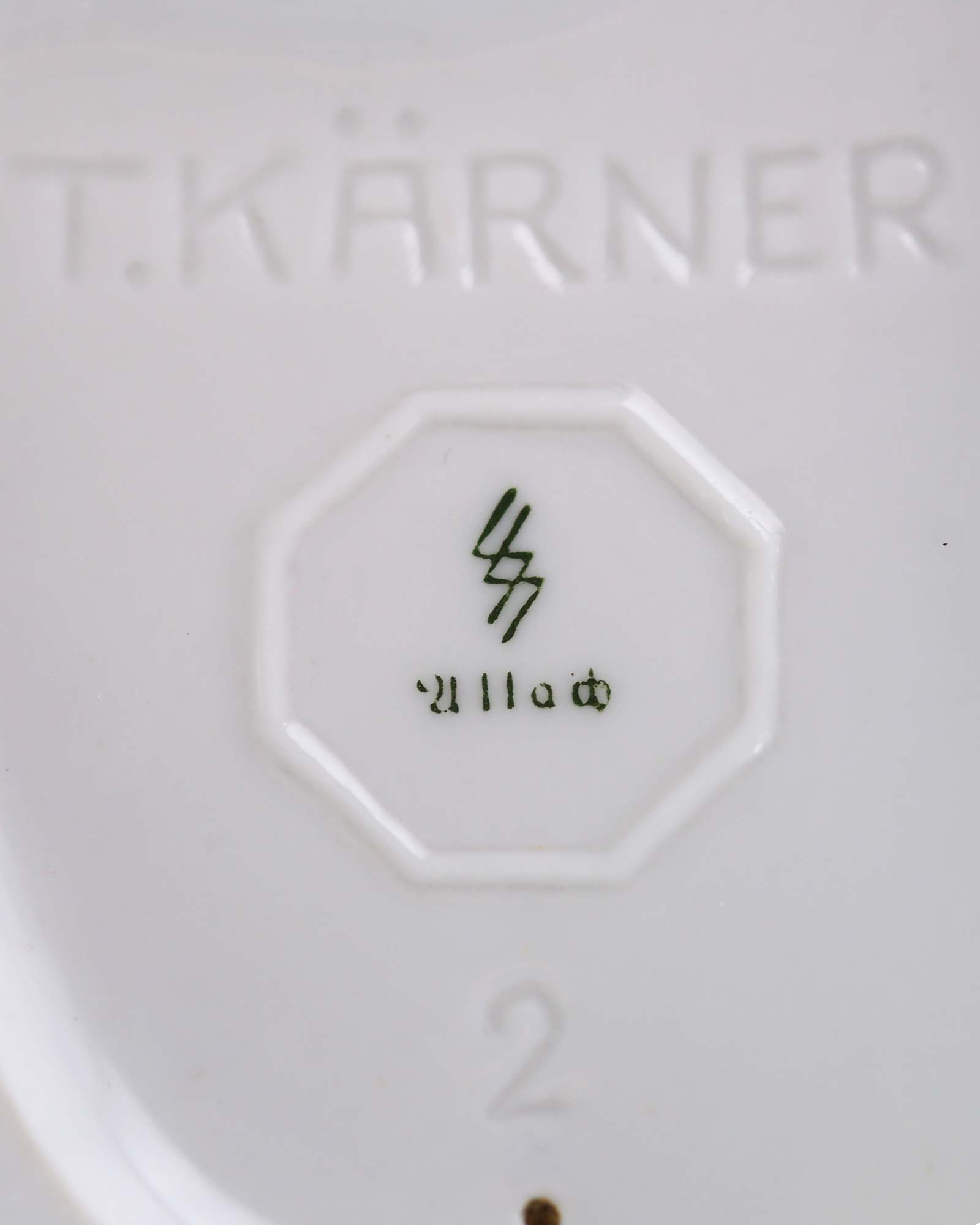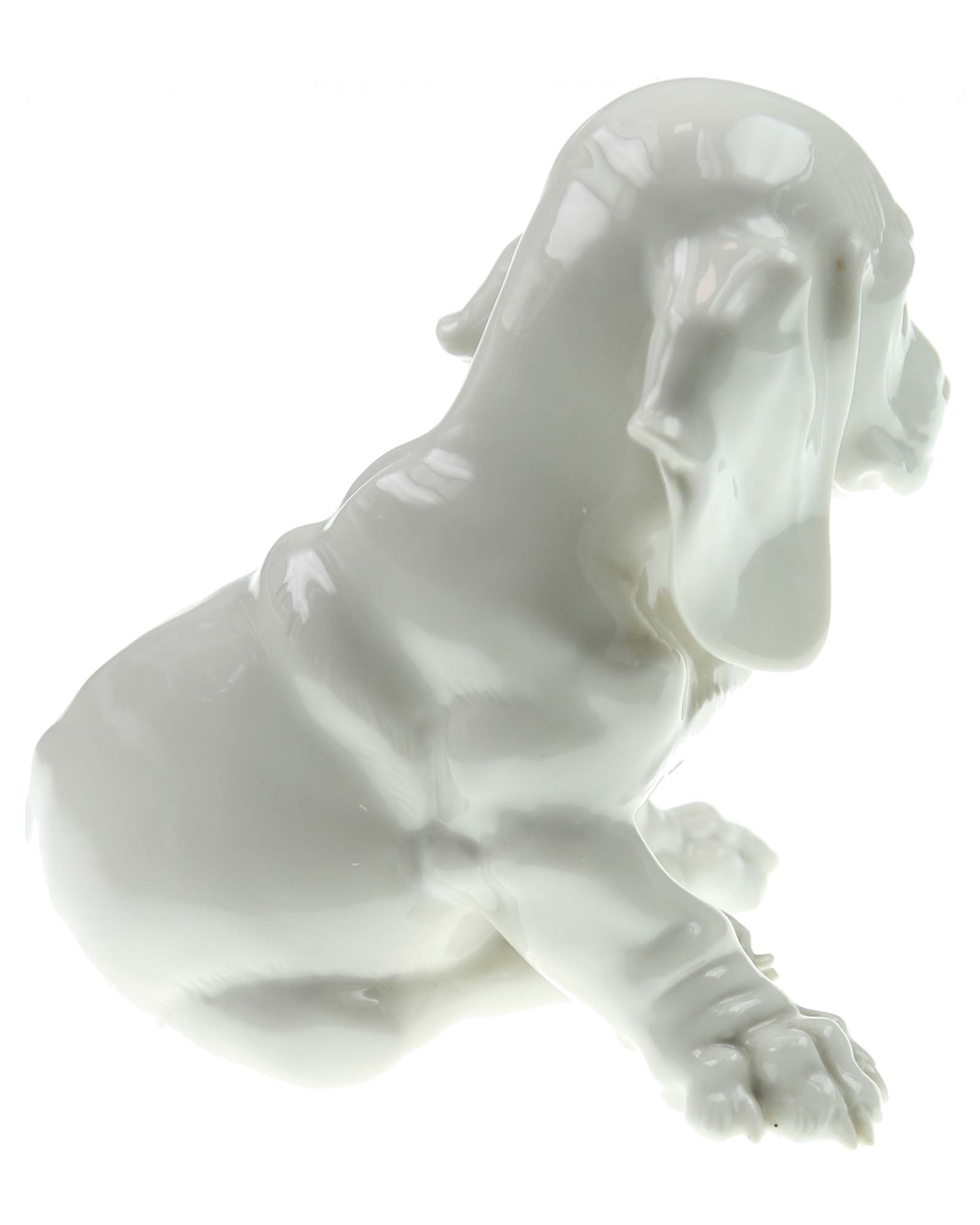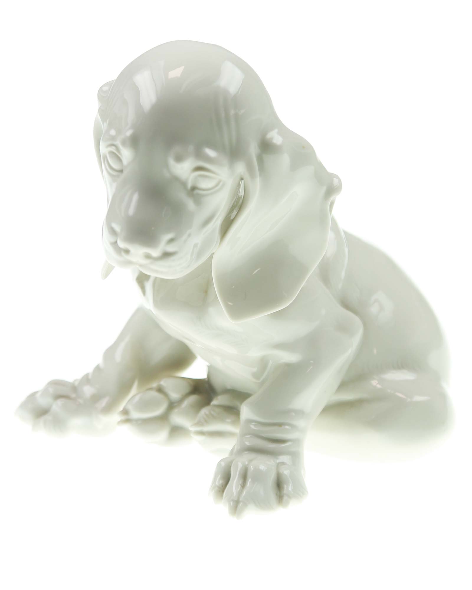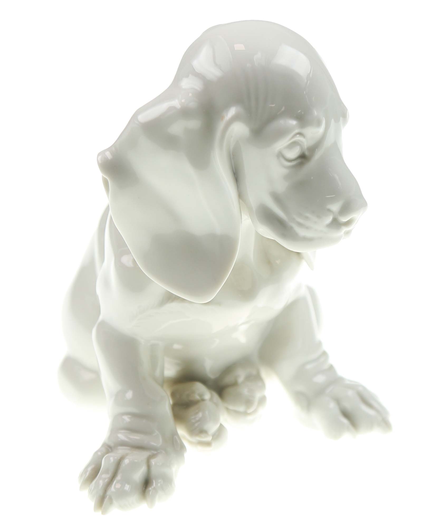 Weiß glasierte Porzellanfigur. Sitzender Dackelwelpe (Dackel). Im Boden befindet sich die SS Manufakturmarke "SS", sowie die Künstlersignatur „T. Kärner“ - und die Modellnummer "2".