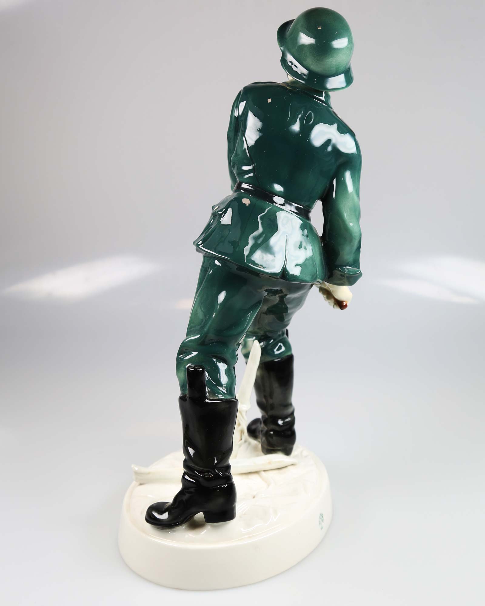 Deutscher Soldat (Handgranatenwerfer). Farbig glasierte Porzellanfigur auf einem Podest. Auf dem Podest befindet sich die Manufakturmarke "ENS" Friedrich Karl Ens Porzellan. Gesamtgewicht 1352 g. Abmessungen: 355 x 185 x 140 mm. Zustand 1.