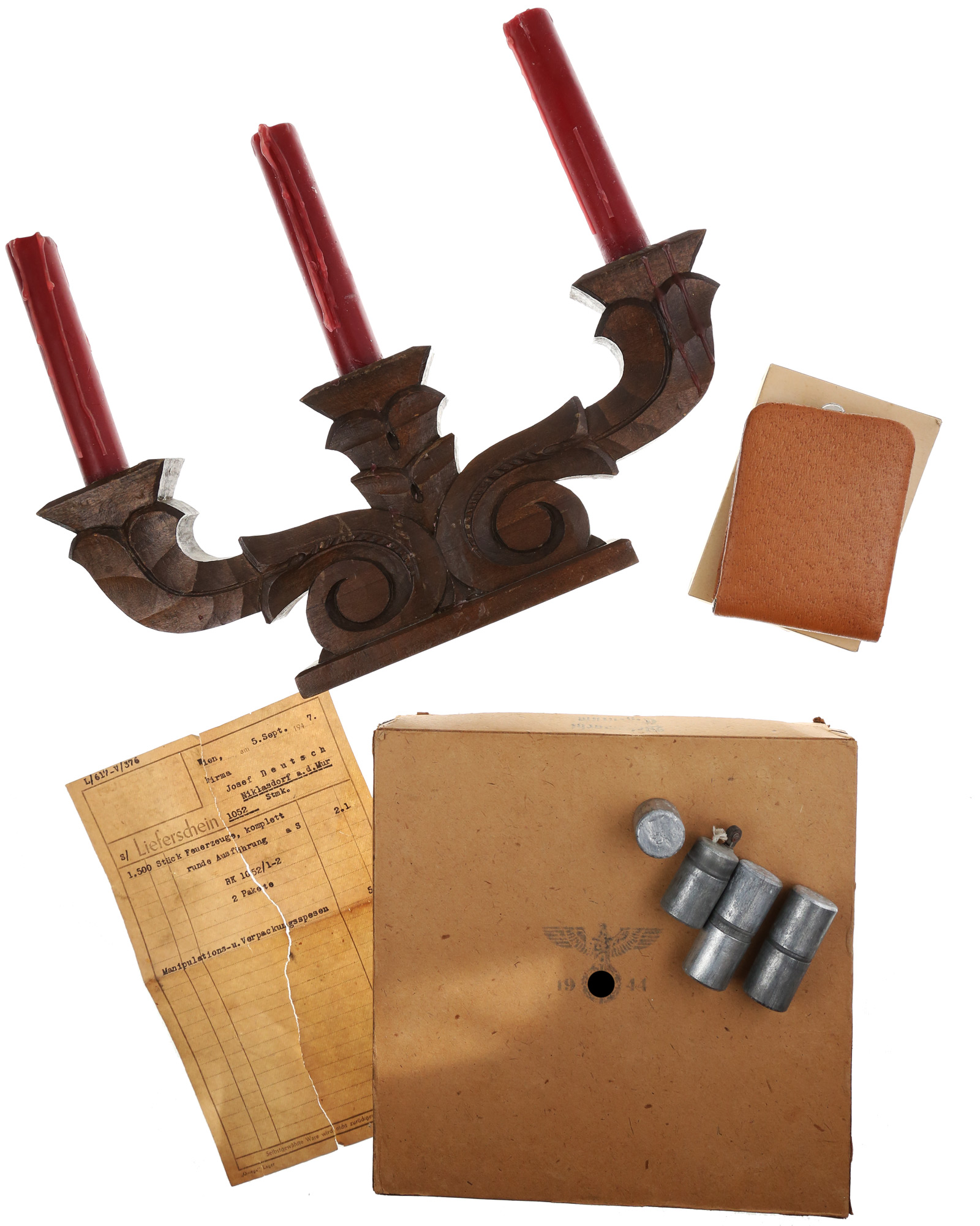 Kleiner Nachlass: Kerzenleuchter aus Holz, handgeschnitzt. Unterhalb ein Stempel der Waffen SS. Die drei Kerzen sind auch noch aus der Zeit. Drei Feuerzeuge der Luftwaffe zusammen mit Rechnung und Originalverpackung. Die Feuerzeuge sind mit Luftwaffe Abnahmestempel. Luftwaffe Zigarettenetui (D.R.G.M.) aus hellbraunen Leder.