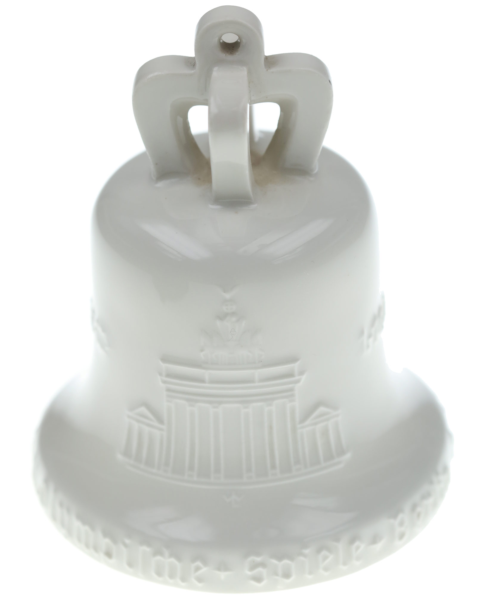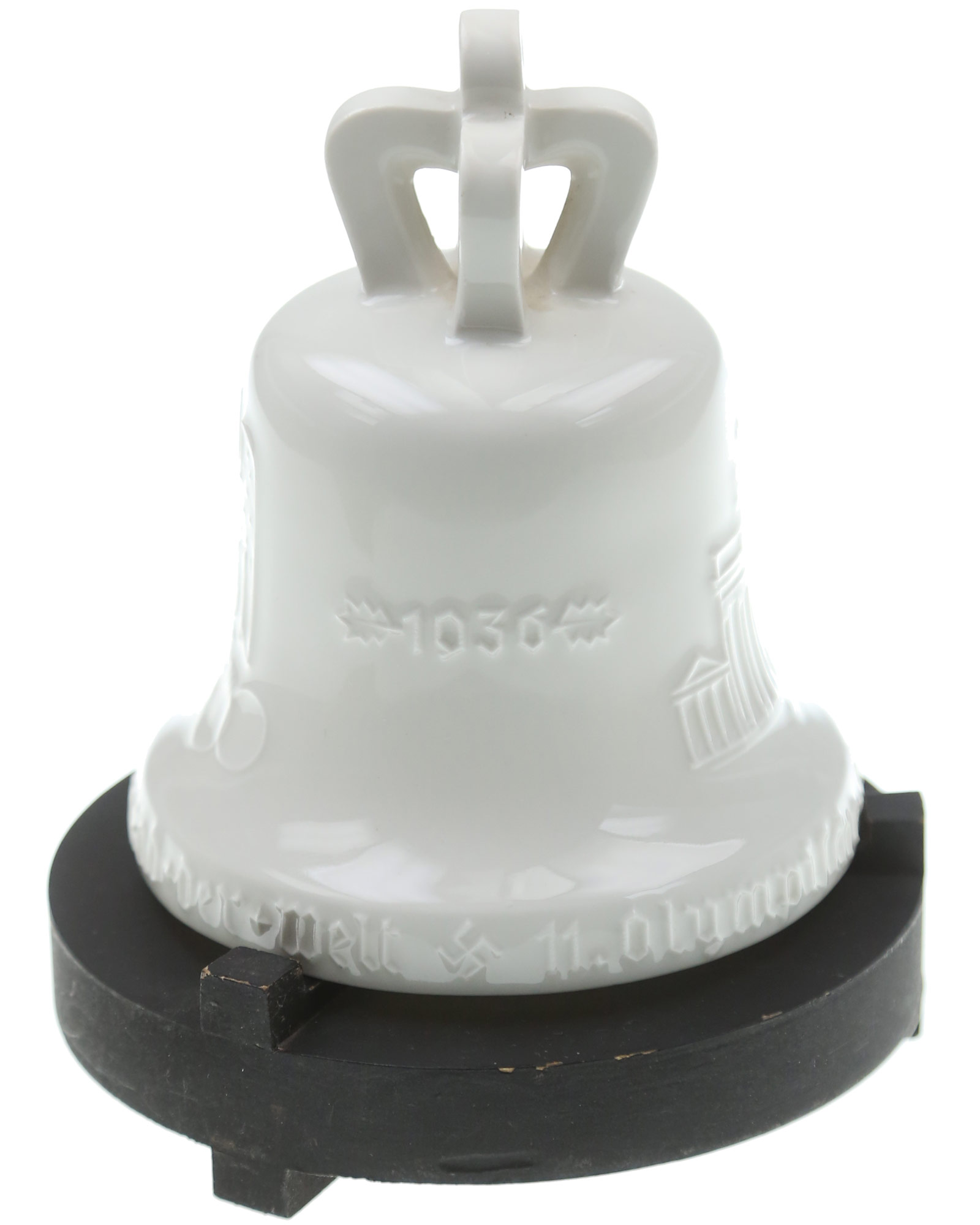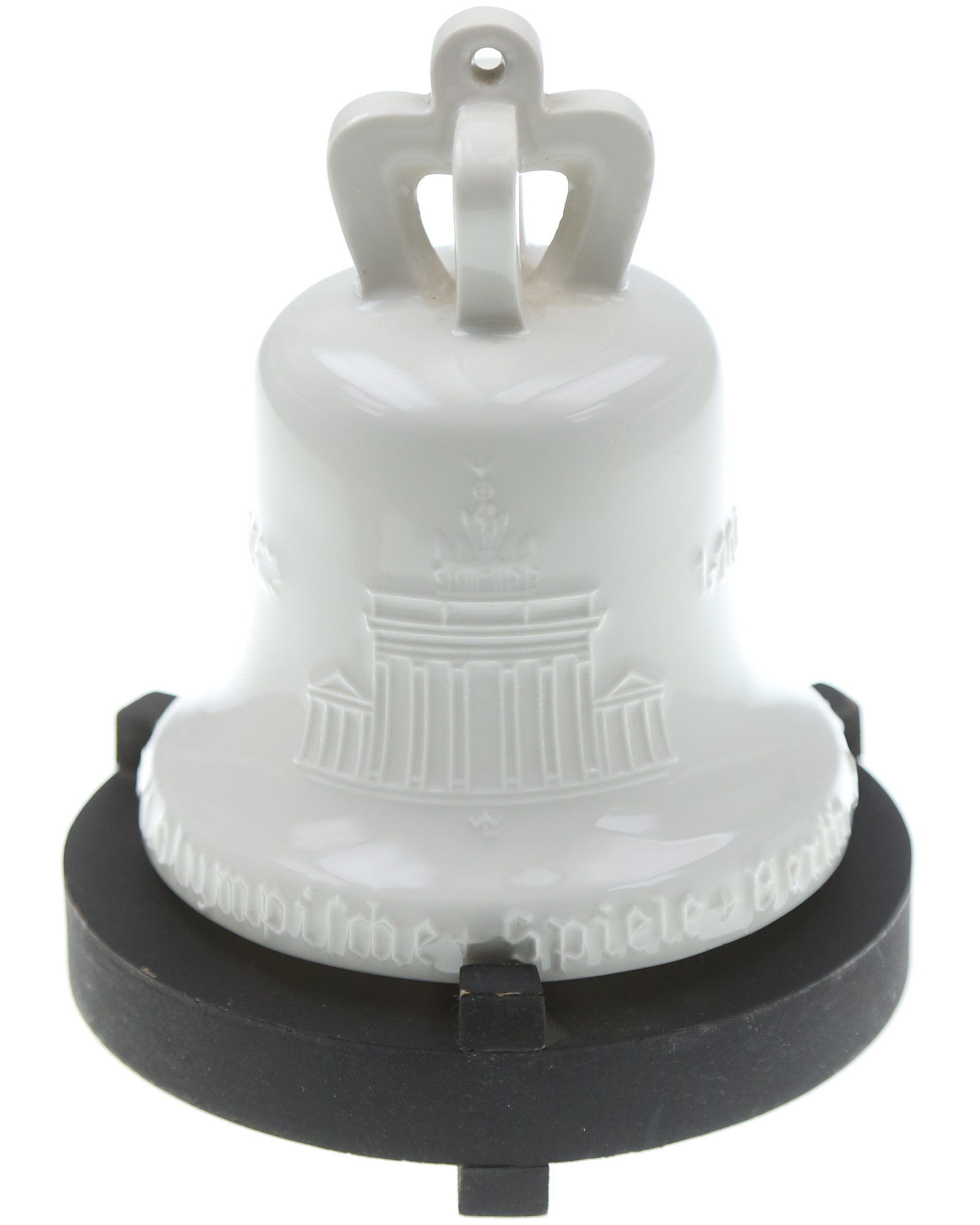 Olympia-Glocke mit dazugehörigem Briefumschlag, aus weißem, glasiertem Porzellan. Im Relief verziert mit dem Brandenburger Tor, dem Reichsadler über den Olympischen Ringen und dem Datum 1.-16. August 1936. Inschrift: Ich rufe die Jugend der Welt und 11. Olympische-Spiele Berlin. Innen befindet sich die blaue KPM-Zeptermarke (Königliche Porzellan-Manufaktur Berlin). Komplett mit hölzernem Sockel. Höhe mit Sockel ca. 15 cm.