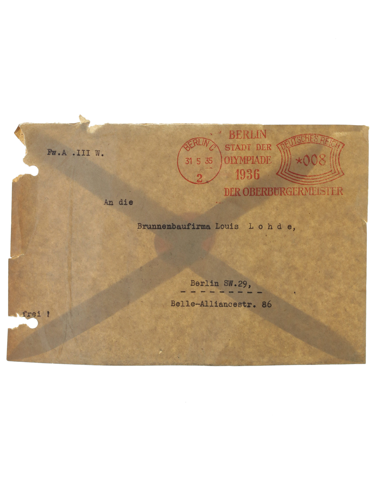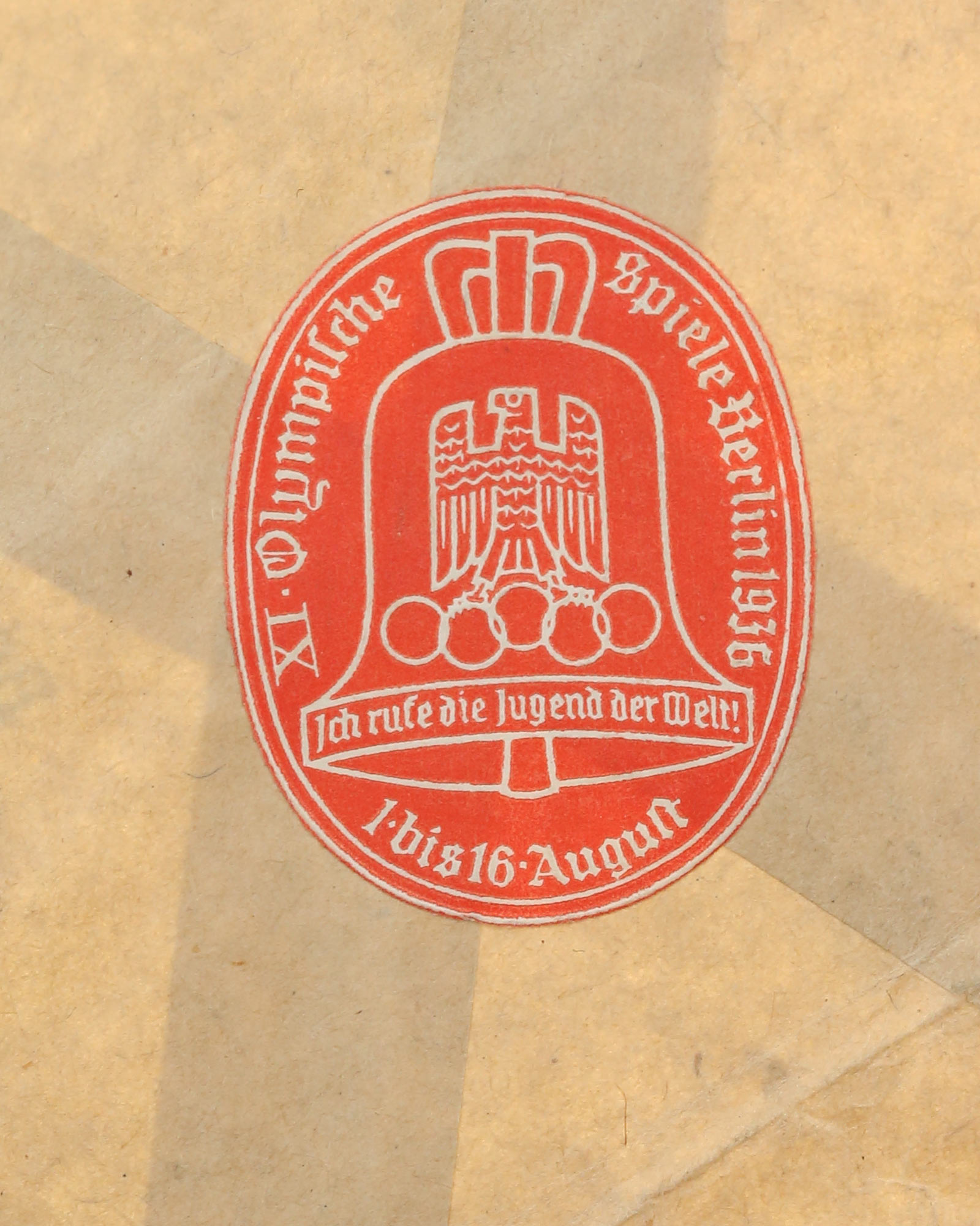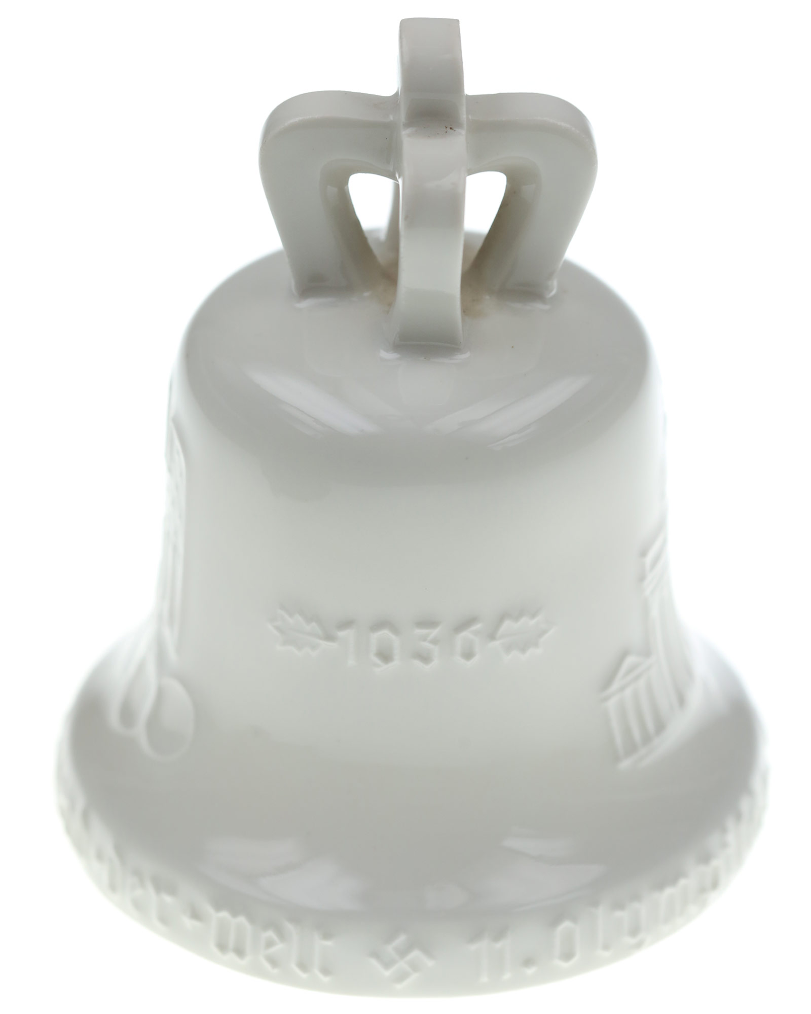 Olympia-Glocke mit dazugehörigem Briefumschlag, aus weißem, glasiertem Porzellan. Im Relief verziert mit dem Brandenburger Tor, dem Reichsadler über den Olympischen Ringen und dem Datum 1.-16. August 1936. Inschrift: Ich rufe die Jugend der Welt und 11. Olympische-Spiele Berlin. Innen befindet sich die blaue KPM-Zeptermarke (Königliche Porzellan-Manufaktur Berlin). Komplett mit hölzernem Sockel. Höhe mit Sockel ca. 15 cm.