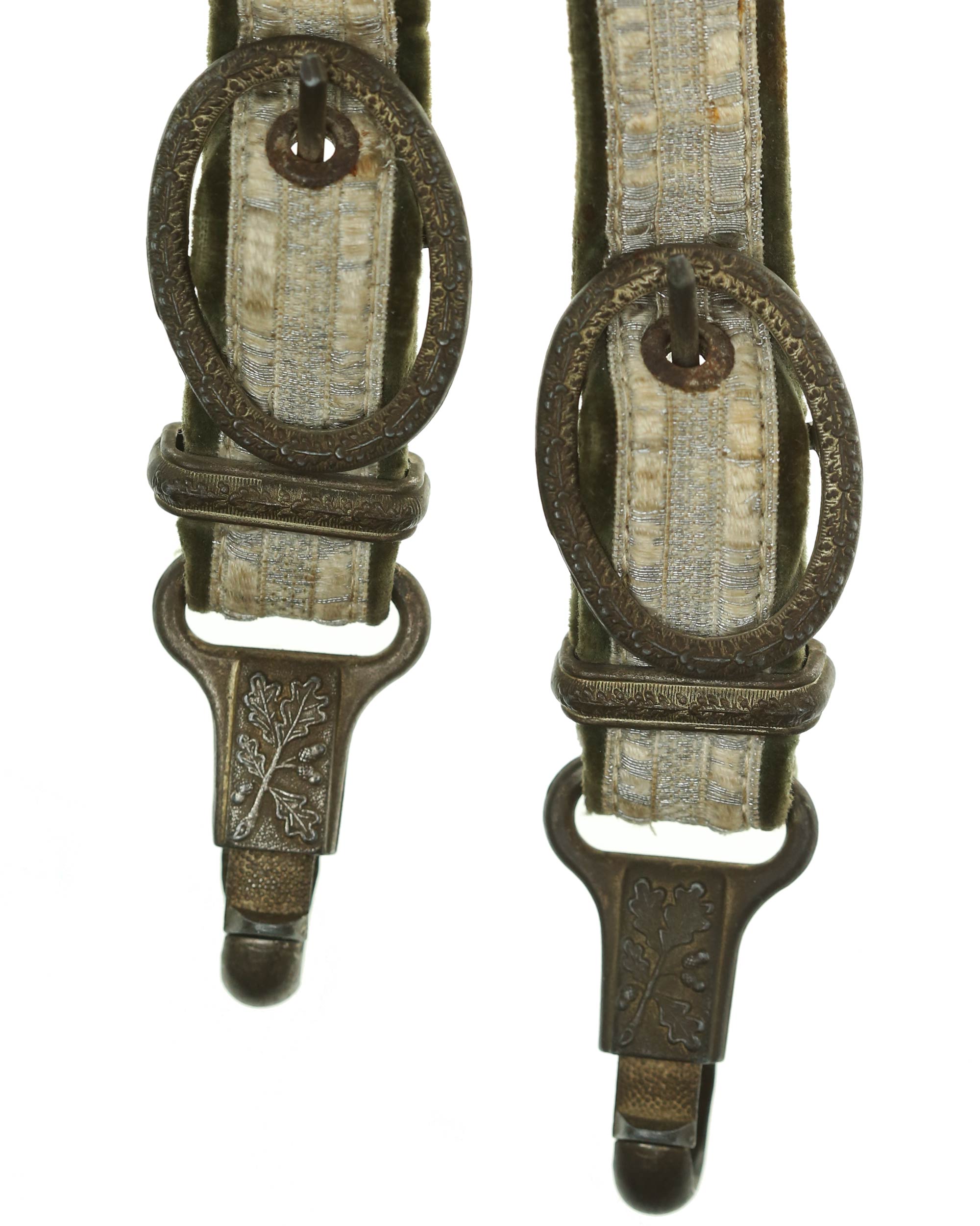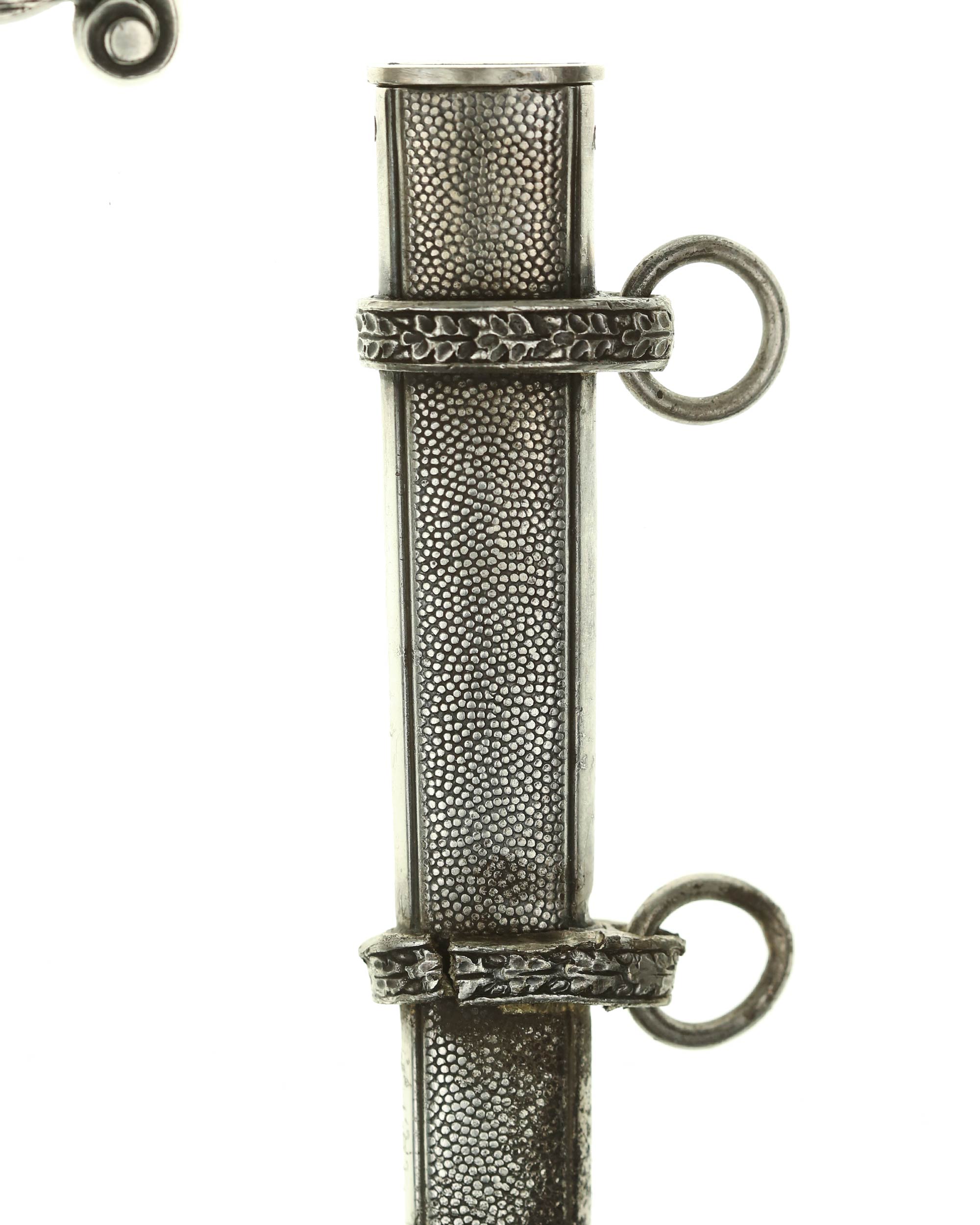 Scheide: Die Scheide besteht aus Mundblech und aus zwei eichenlaubverzierten Scheidenbändern mit zwei losen Trageringen, diese sind komplett geschlossen. Das untere Scheidenband ist angebrochen Die Scheide ist aus einem Stück Stahlblech gezogen und auf der Vorder- und Rückseite mit körniger Oberflächenstruktur versehen. Die Spitze ist abgerundet und eingedrückt. Das Mundstück ist separat eingesetzt, an den beiden Seiten fehlen die Schräubchen. Beidseitig Roststellen an der Scheide.