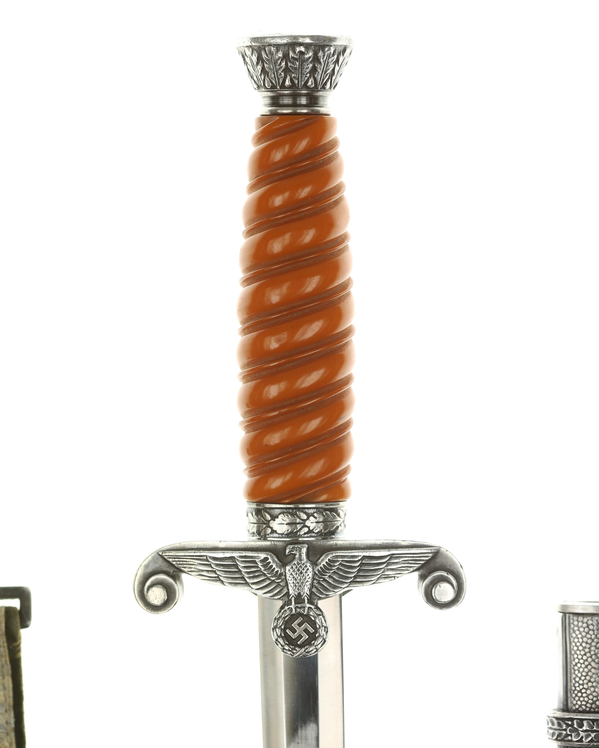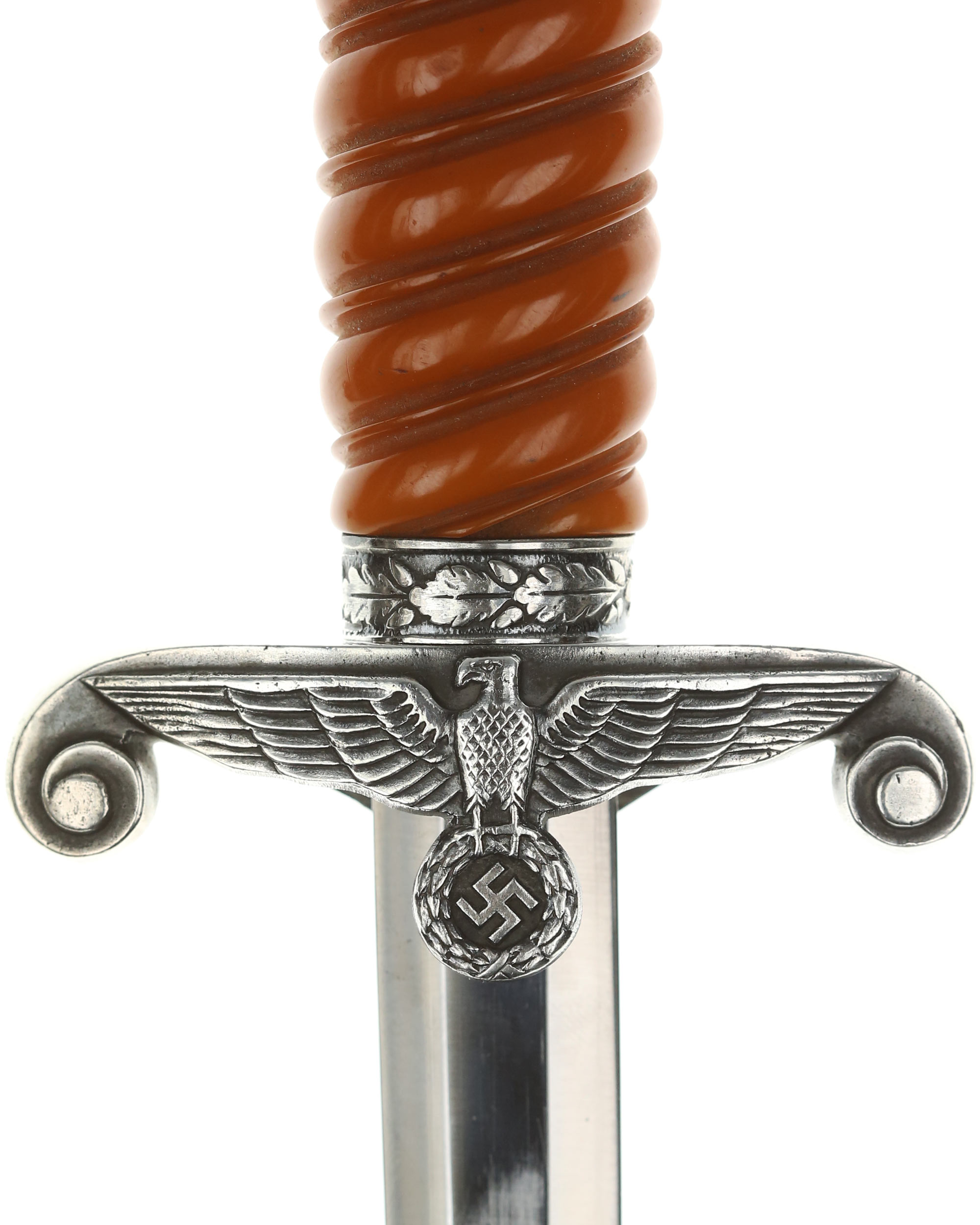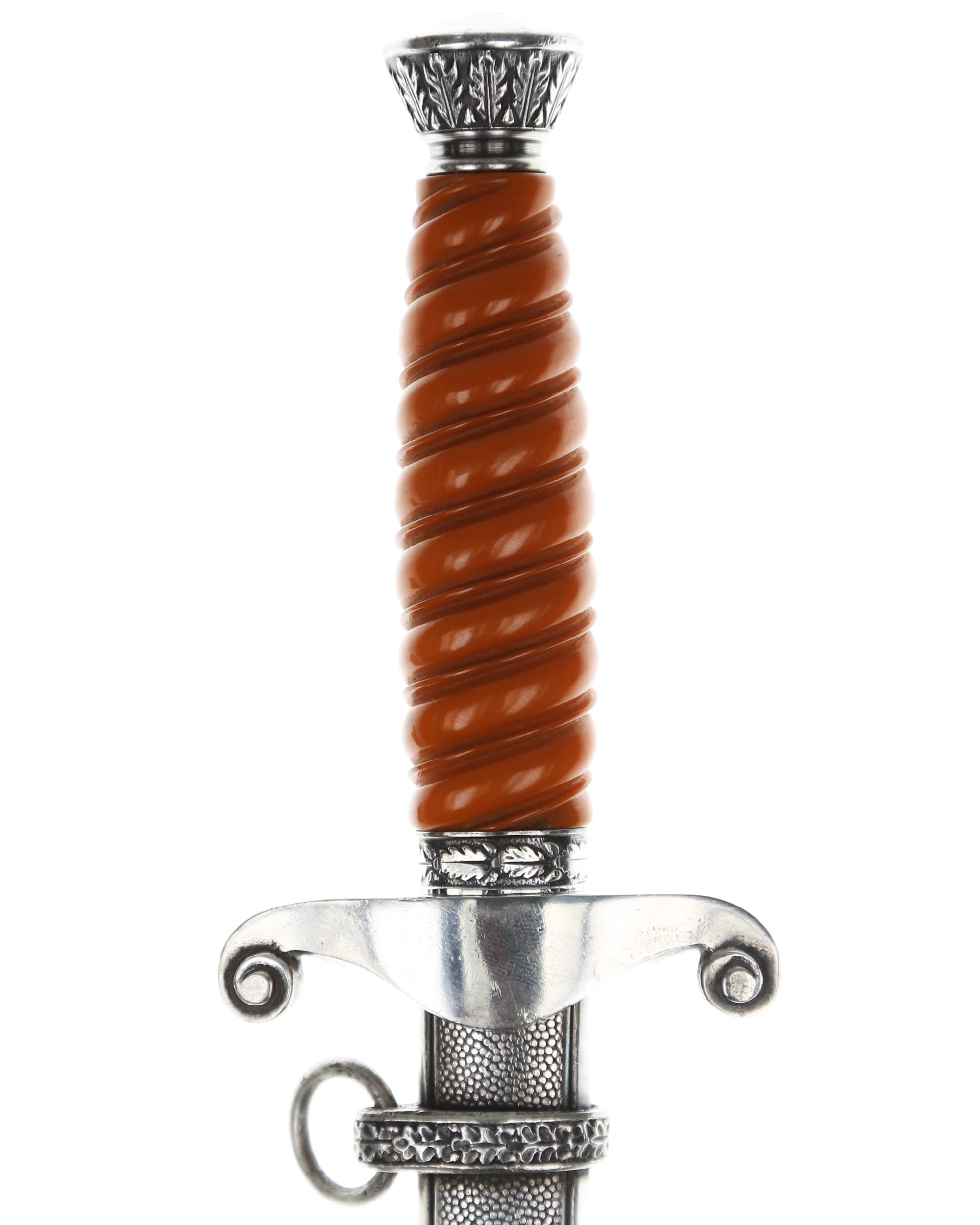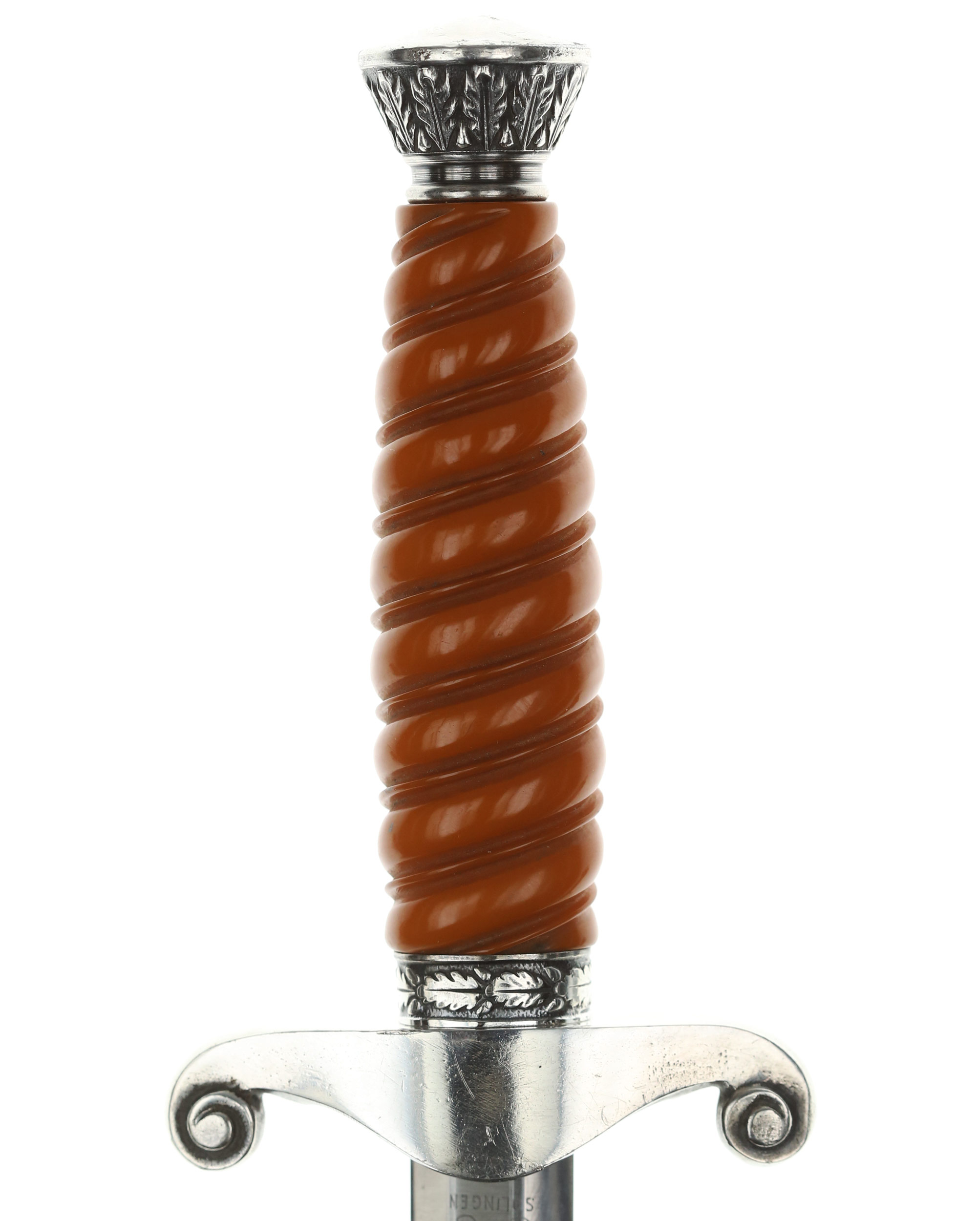Griff: Der Griff ist rund mit zweifach verdrehten Kanneluren und besteht aus gelben/orangenen Trolon. Die Form der Kanneluren ist konvex bzw. nach außen gewölbt. Der Knauf ist konisch und ist auf die Klingenangel festgeschraubt, er ist mit 12 Eichenlaubblätter verziert. Am unteren Ende des Griffes befindet sich der Griffring, der mit 7 Eichenblätter in einer Reihe nebeneinander verziert ist. Die Parierstange ist in Form eines Reichsadlers, der nach links schaut. Zu den beiden Enden hin wirbeln die Flügel nach unten. In der Mitte befindet sich der Adler, der in seinen Krallen einen Kranz mit dem Hakenkreuz festhält.
