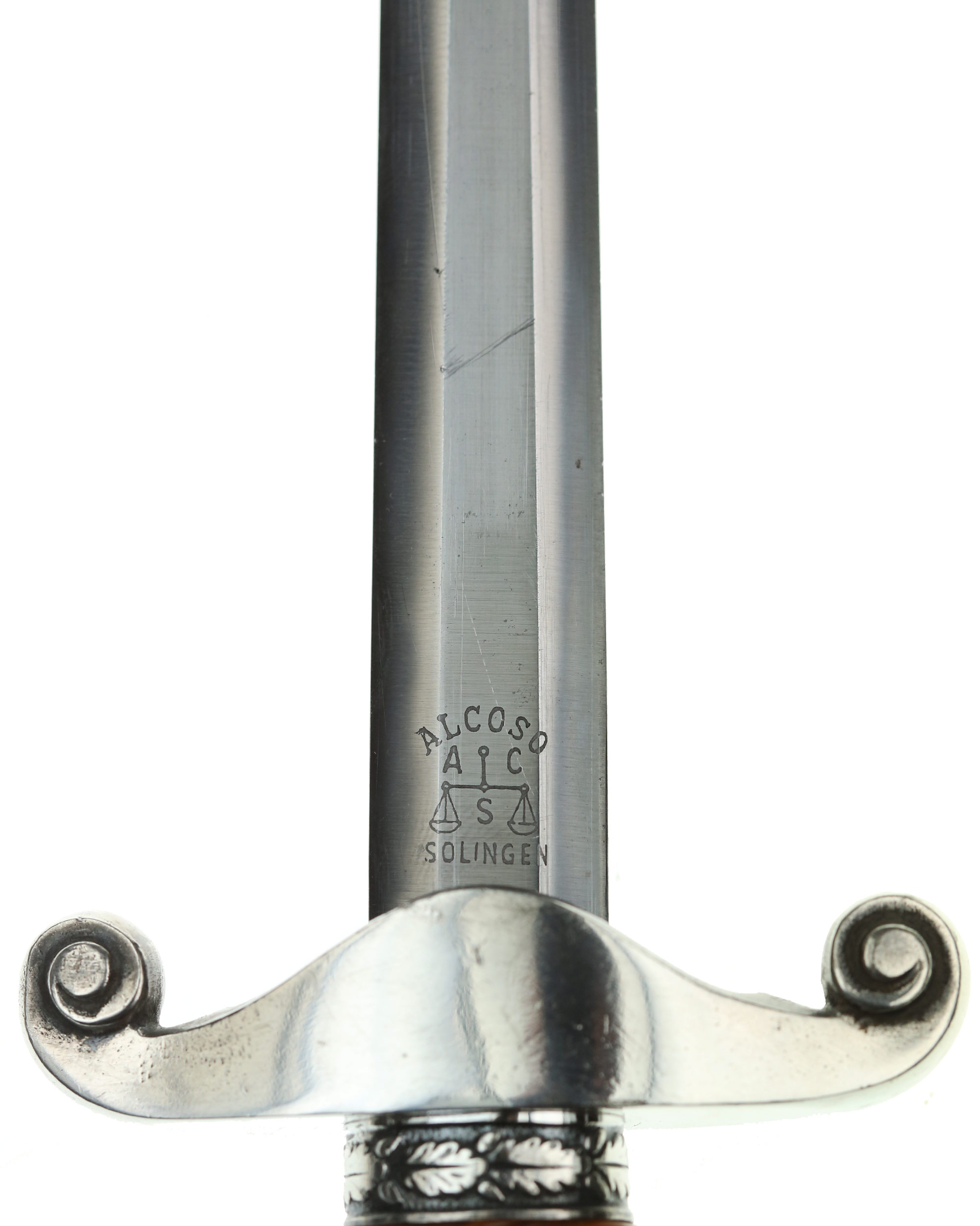 Klinge: Die Klinge ist sauber, nur zur Spitze etwas fleckig. Auf der Rückseite der Klinge befindet sich die Herstellerbezeichnung: Alexander Coppel (ALCOSO) in Solingen. Die Klingenspitze ist zu 100% noch erhalten und ungekürzt. Zwischen den Schultern der Klinge und der unteren Parierstange ist befindet sich das originale Stoßleder.