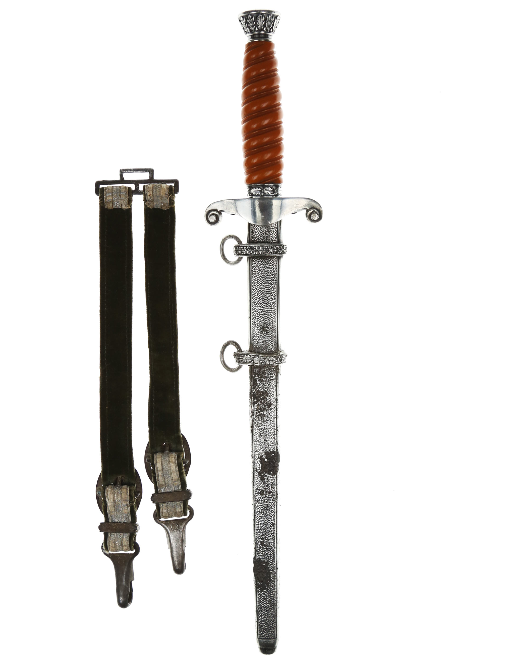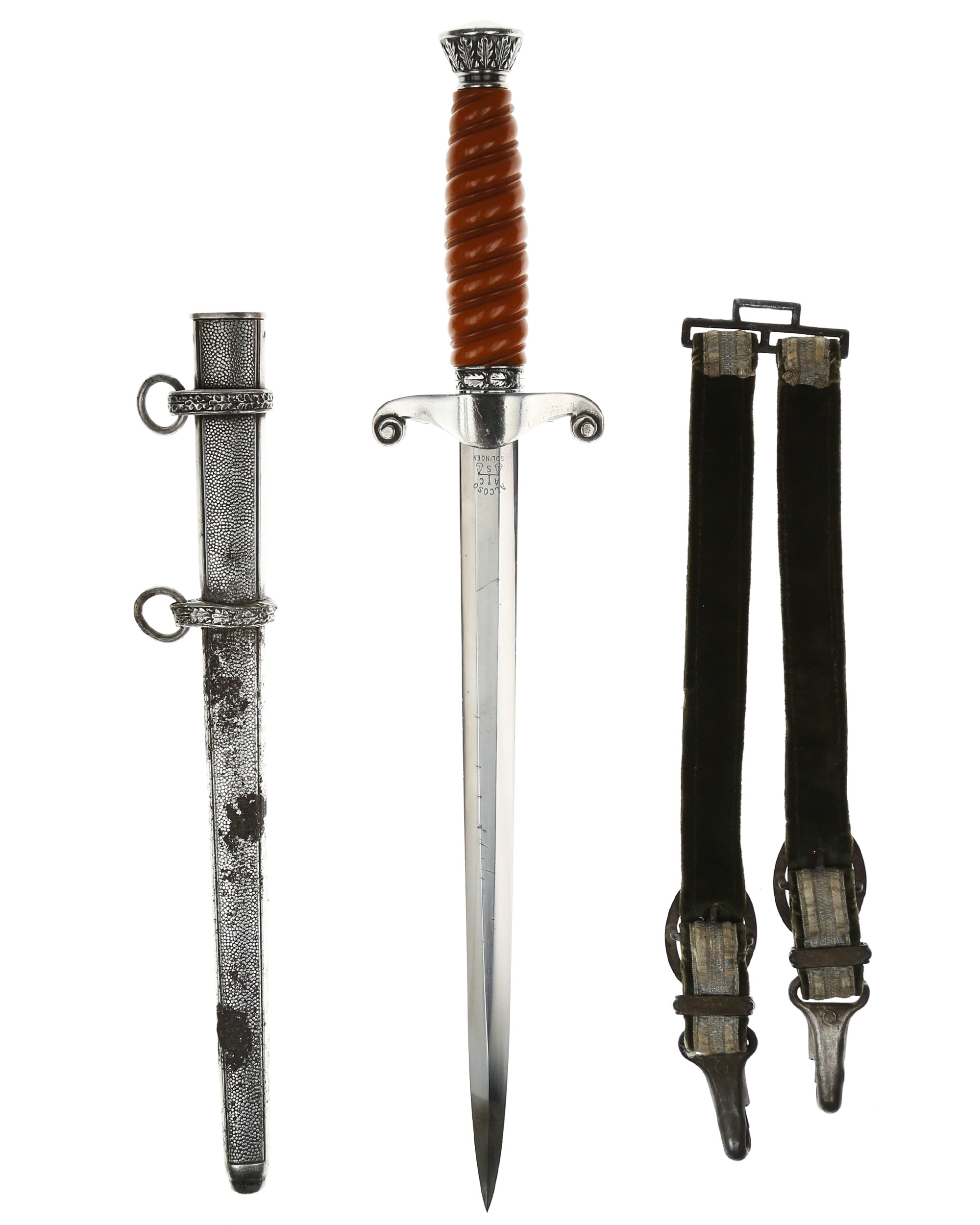 Gut erhaltener Dolch für Offiziere des Heeres. Modell 1935. Die Gesamtlänge beträgt 39,8 cm. Der Heeresdolch hat den Hersteller auf der Klinge: ALCOSO ACS - Alexander Coppel (ALCOSO), Solingen. Der HOD ist zusammen mit einem zweiteiligem Gehänge.