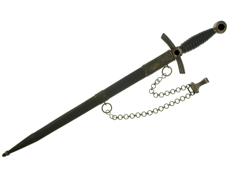 Extremly Rare DLV Flyers Dagger by WKC Solingen. The German Air Sports Formation incorporated all German civilian aero clubs in March, 1933, under the aegis of its newly-appointed head, Bruno Loerzer. Three principle groups made up the initial DLV organization: flyers of motor-driven aircraft; flyers of gliders; and flyers of balloons. The DLV was subsequently dissolved in April, 1937, in order to bring all civilian aviation activities under Nazi control. The DLV Flyers Dagger is significant fort wo reasons: it served as the forerunner oft the Standard First Model Luftwaffe dagger, and it is by far the longest of all oft he standard Nazi daggers. The metal fittings of both the hilt and the scabbard are constructed of nickel. The wooden grip and scabbard are wrapped im dark blue leather. Grip is without wire wrapping. The circular pommel features a brass pinwheel swastika that matches the configuration oft he swastika utilizied on both sides of crossguard. The tip oft he lower scabbard fitting is longer than the standard 1935 Luftwaffe Dagger and has four ridges instead oft two.